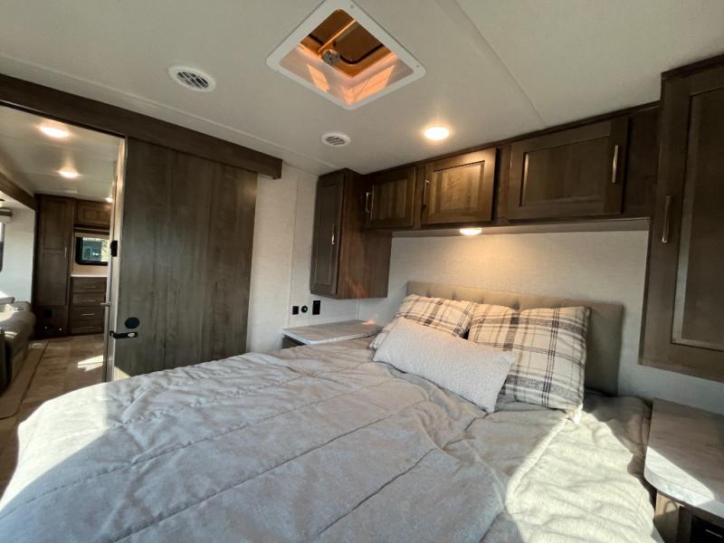 If you like the front kitchen layout, you're going to love this one! You'll have plenty of counter space to prepare and cook meals, or you may just want to head outdoors to cook on the outside kitchen. There is a 17' power awning with LED lights to keep you protected from the sun and rain, and there are three exterior storage compartments for lawn chairs, fishing poles, and firewood! This model includes a theater seating slide in perfect view of the LED TV and fireplace. You'll stay comfortable in the rear bedroom that includes an RV queen bed, dual bedroom wardrobes, and an optional TV if you enjoy movies in bed!