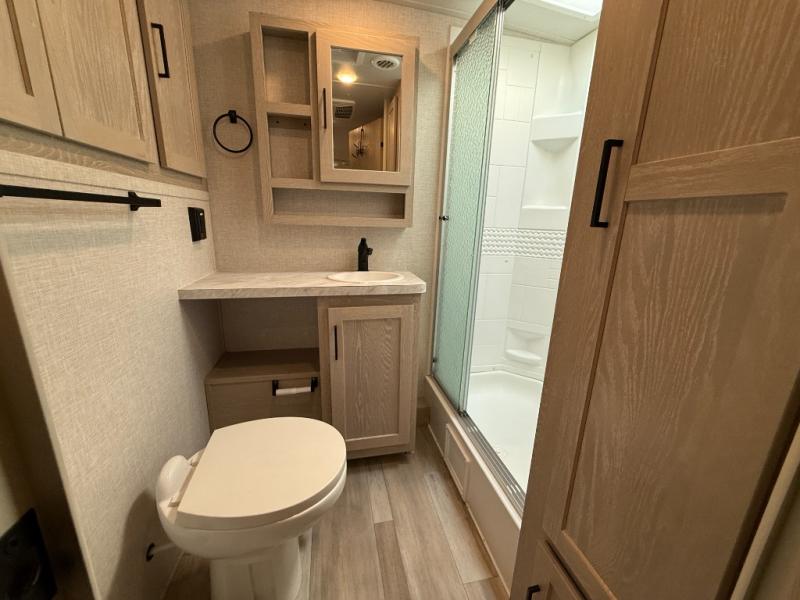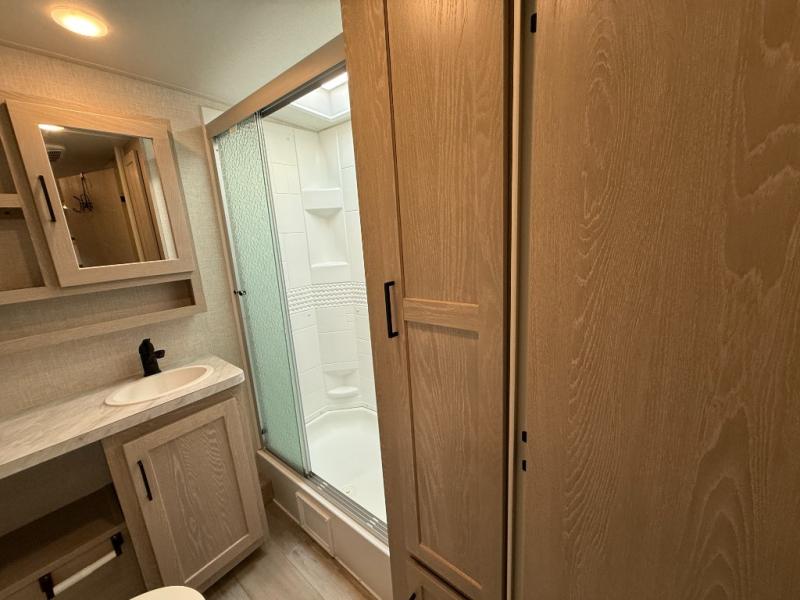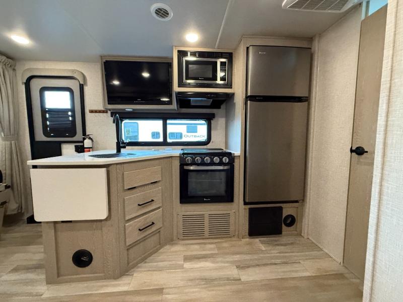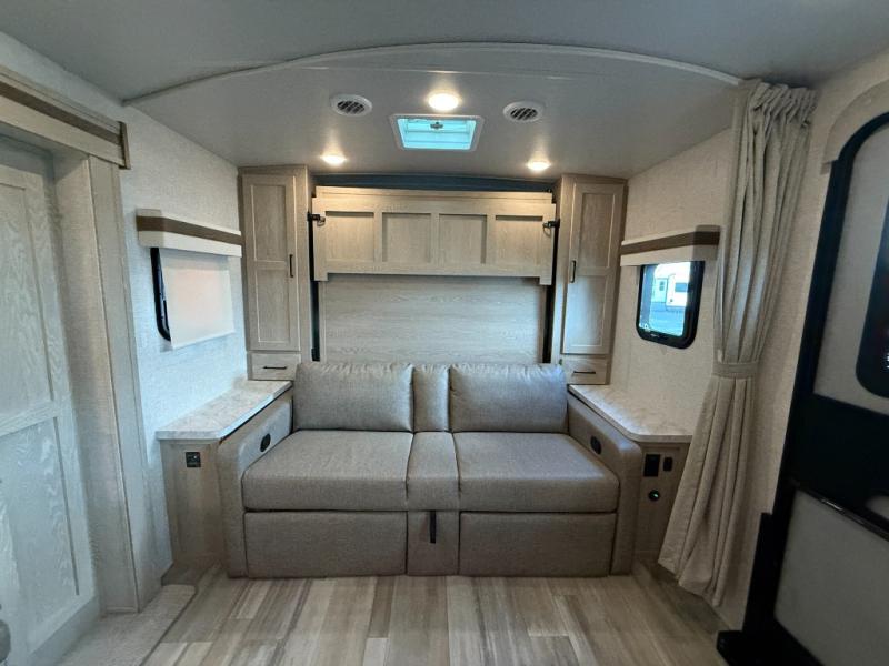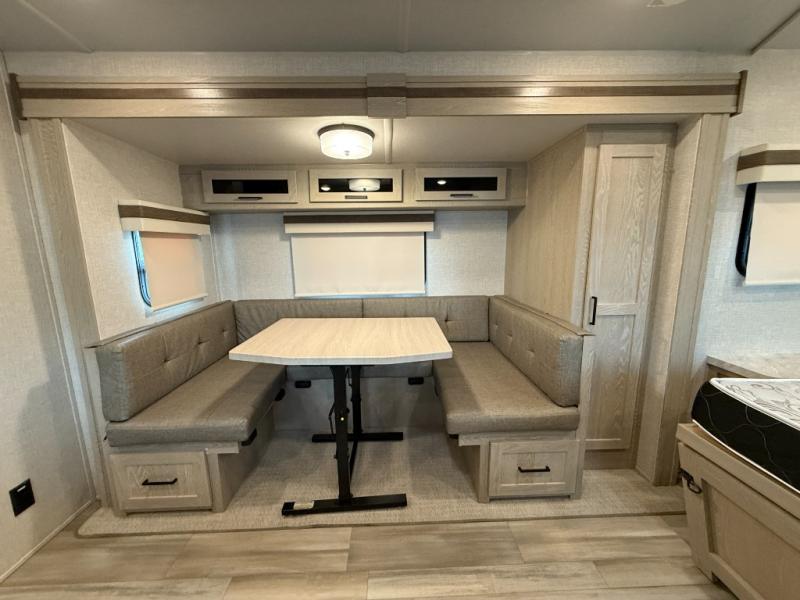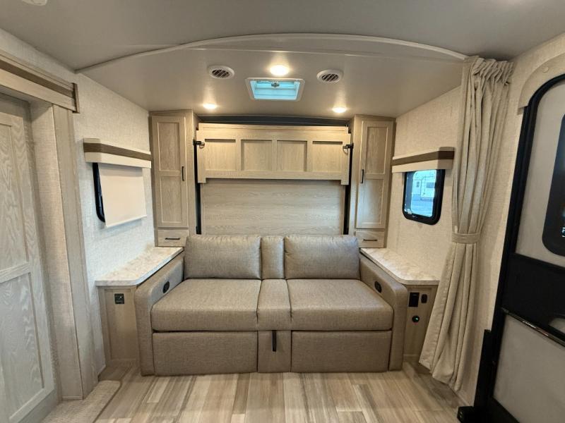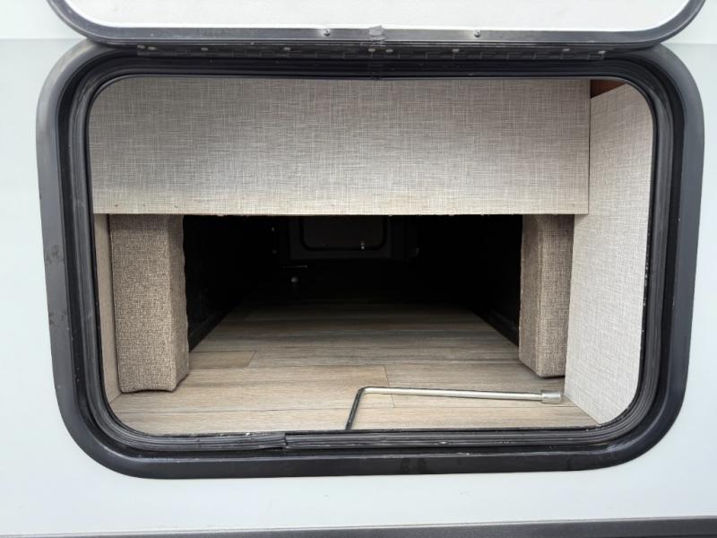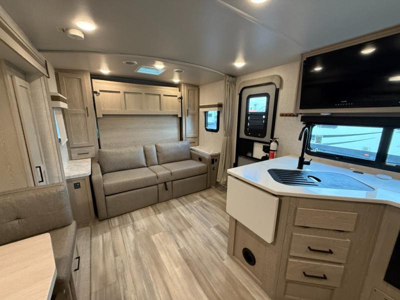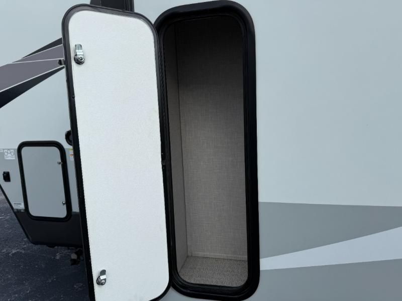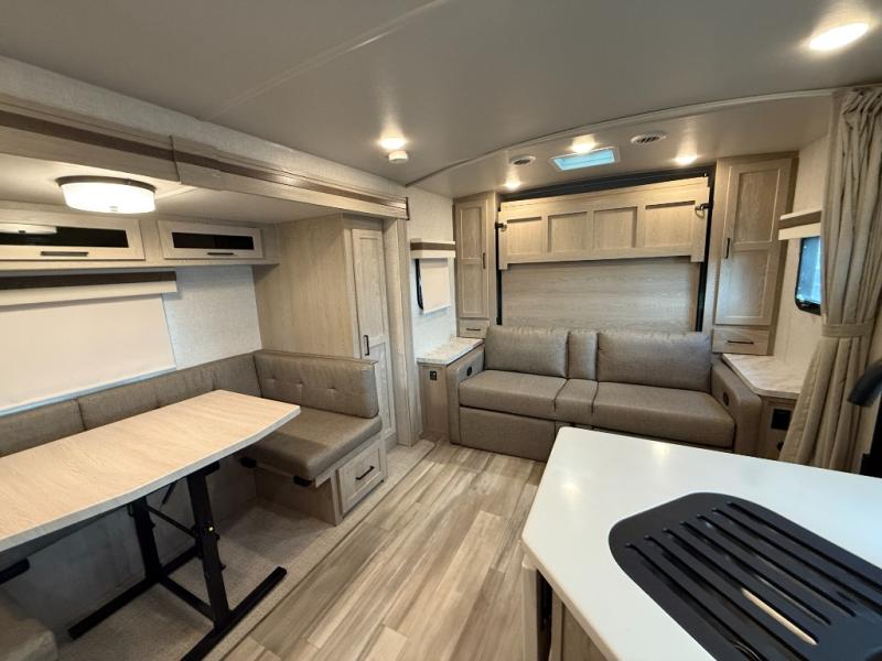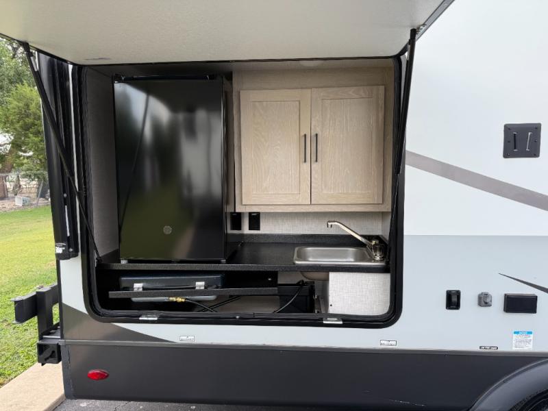 You can't beat this travel trailer with an outside kitchen, tons of exterior storage, and a versatile Murphy bed up front! When your crew isn't outside under the 19' power awning, they can head indoors to play a game around the U-shaped dinette, or watch a movie on the LED TV. There is also a 72" sofa here when the bed is folded away, and everyone will appreciate the spacious full rear bath for privacy. This model includes plenty of exterior space, but you'll be impressed by the interior storage space as well; dual bedroom wardrobes, a wardrobe within the slide out, plus a lean-in pantry in the kitchen for snacks!