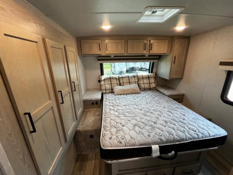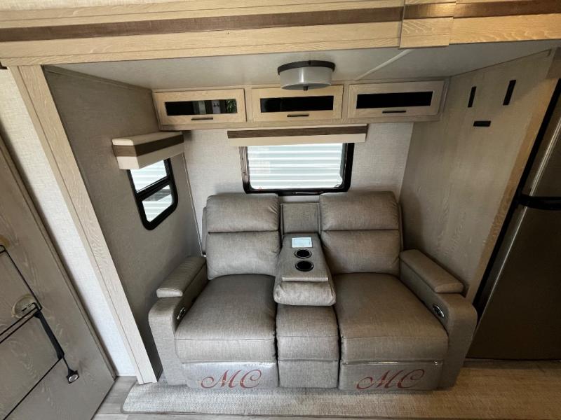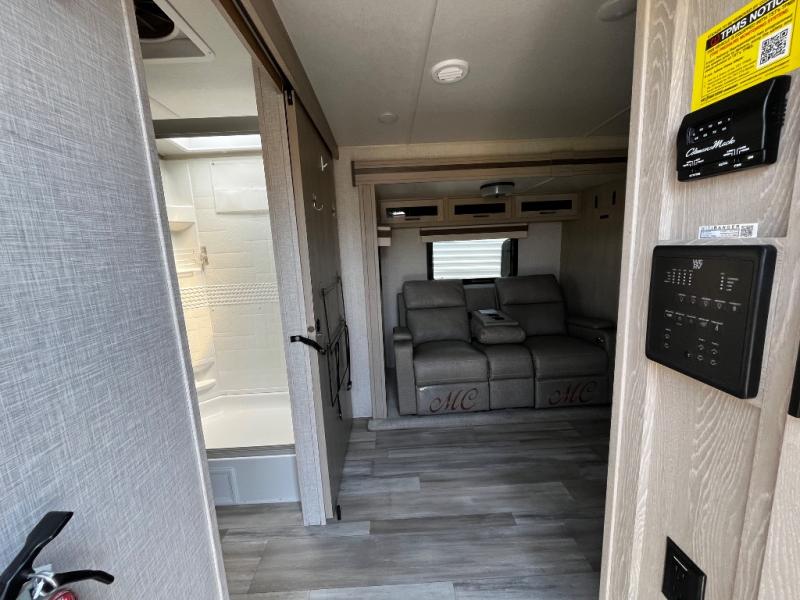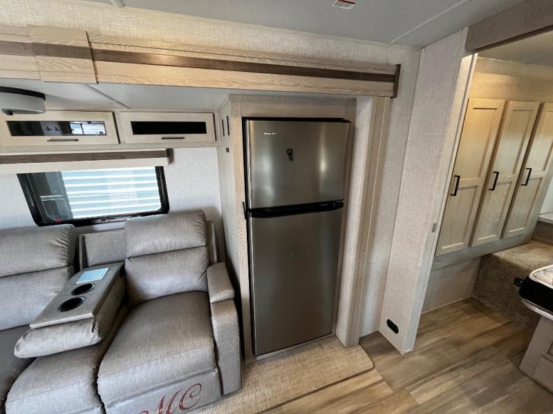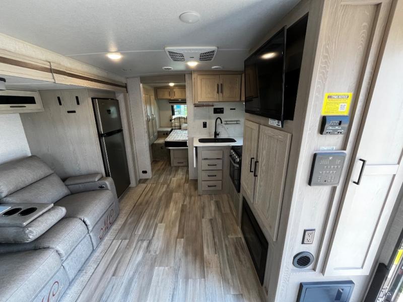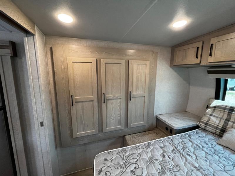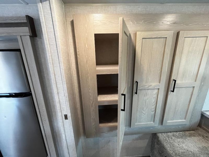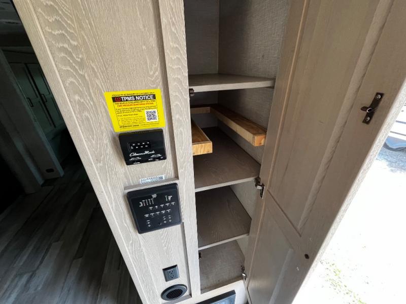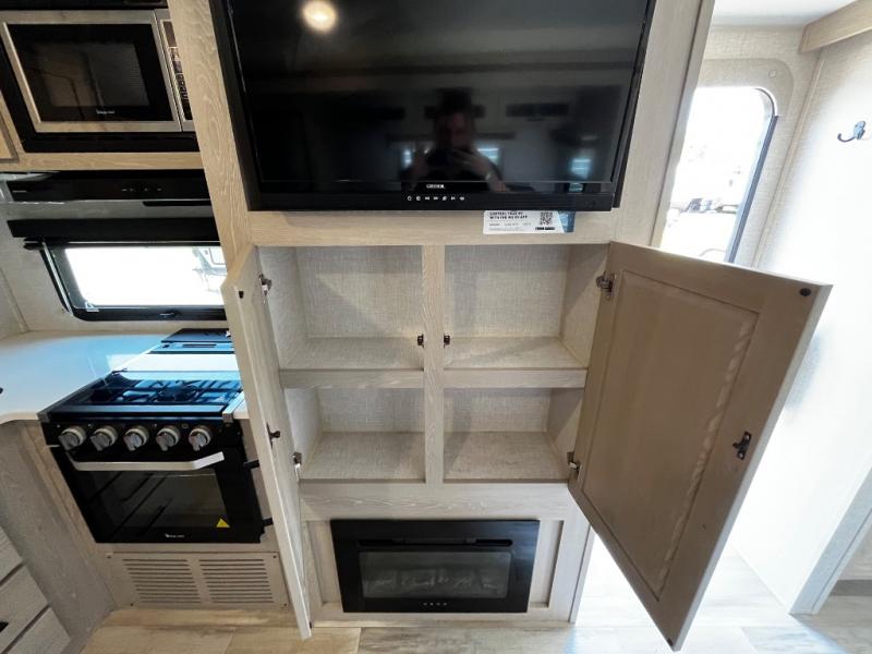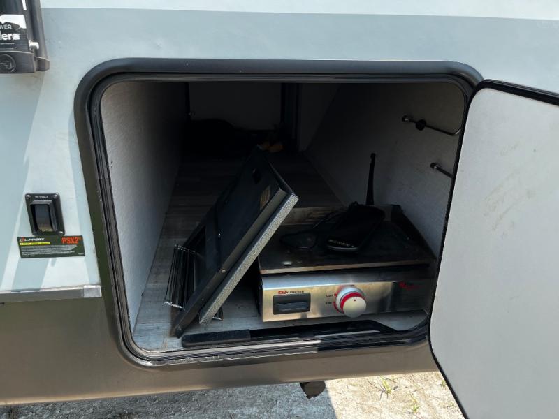 Camping trips to the lake just got sweeter with this dual slide out travel trailer in tow! Once you arrive, unload your gear from the exterior drop-frame pass-through storage, then start lunch on the exterior griddle. If you need a rest after traveling all day, the RV queen bed in the front bedroom is sure to give you comfort, or you can relax on the theater seating. The fireplace and entertainment center with an LED TV will make this space feel just like home, and check out the spacious full rear bath for added privacy. This model also includes an entryway closet/pantry for jackets, shoes, and food!