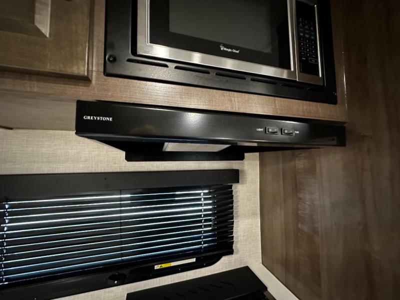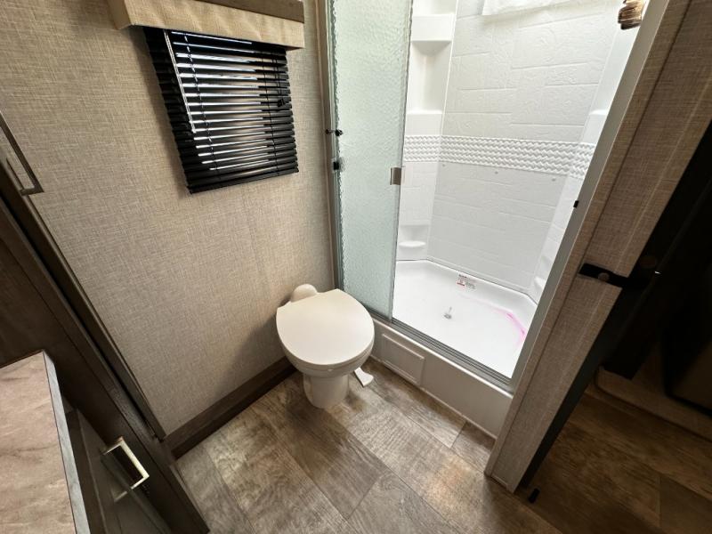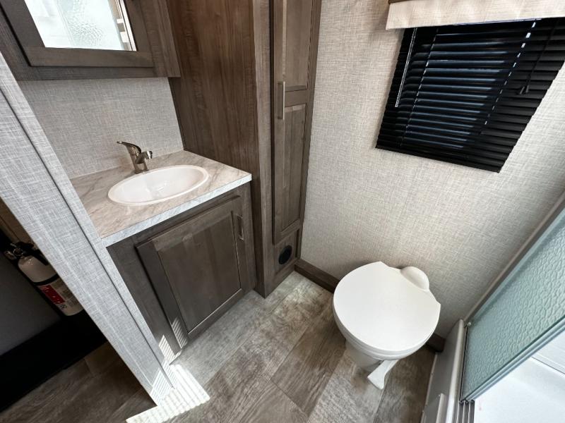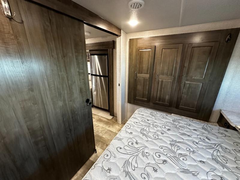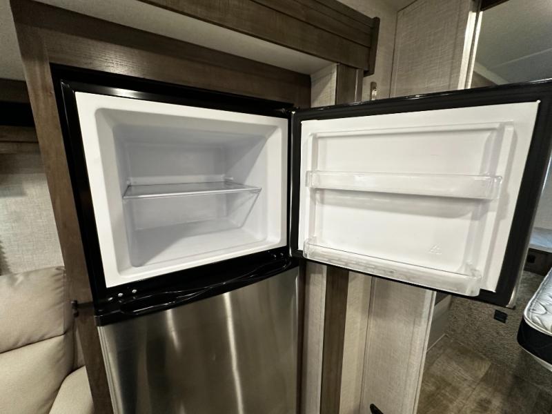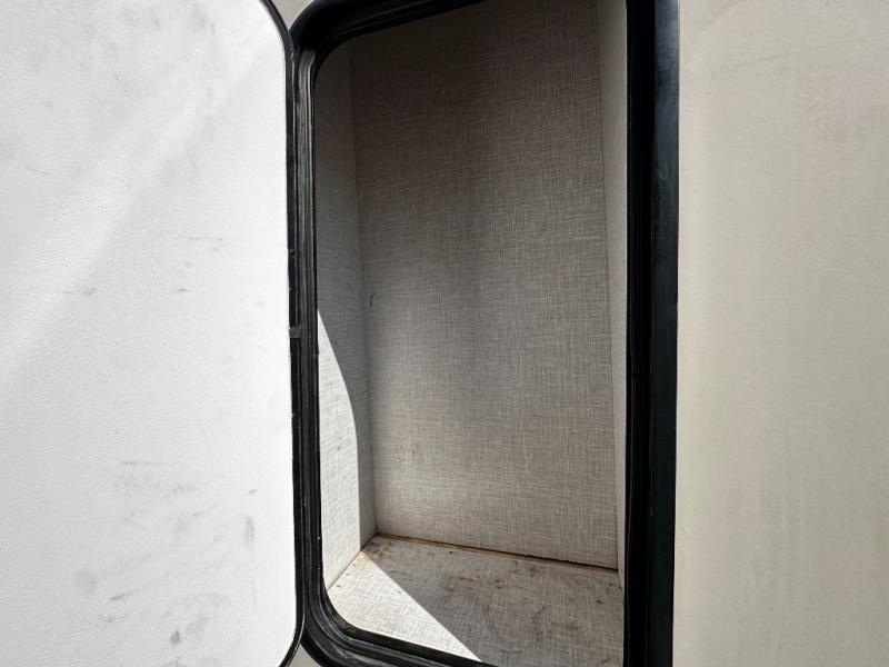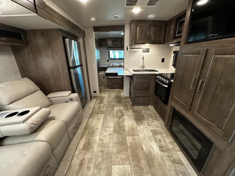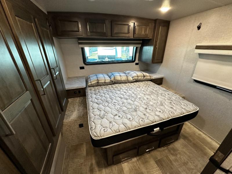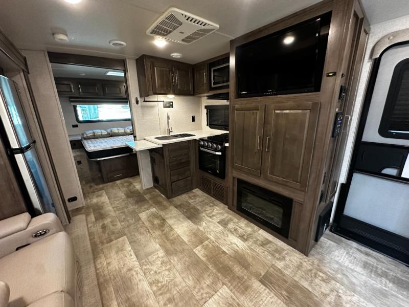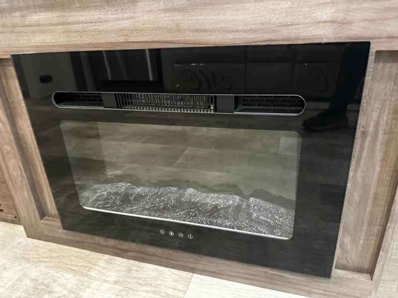 Camping trips to the lake just got sweeter with this dual slide out travel trailer in tow! Once you arrive, unload your gear from the exterior drop-frame pass-through storage, then start lunch on the exterior griddle. If you need a rest after traveling all day, the RV queen bed in the front bedroom is sure to give you comfort, or you can relax on the theater seating. The fireplace and entertainment center with an LED TV will make this space feel just like home, and check out the spacious full rear bath for added privacy. This model also includes an entryway closet/pantry for jackets, shoes, and food!
