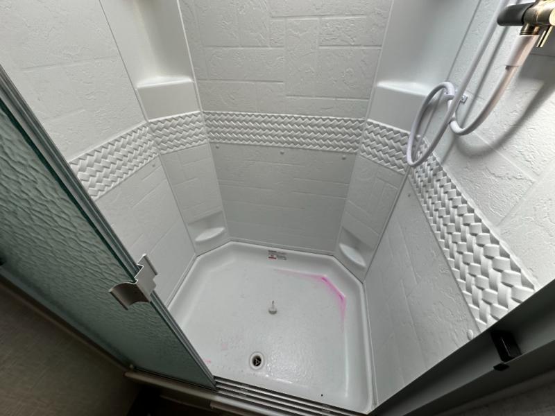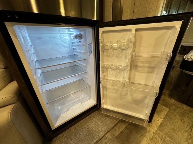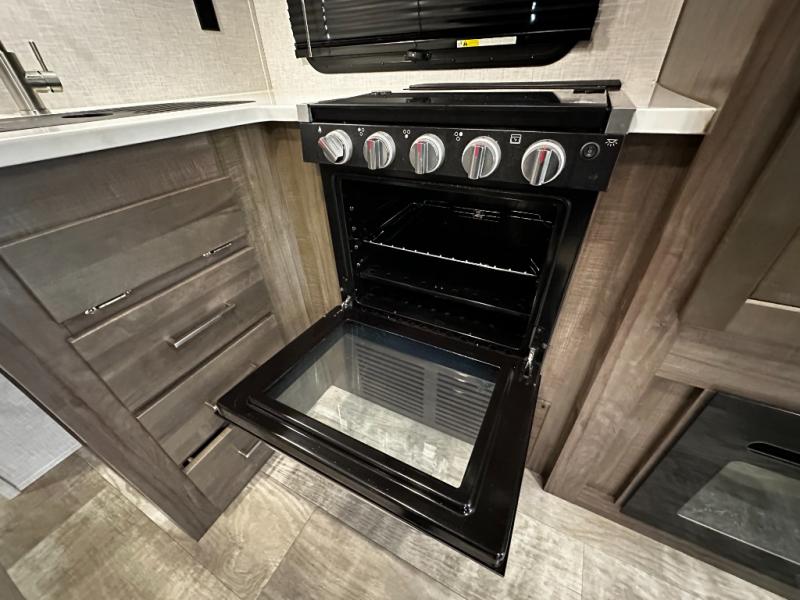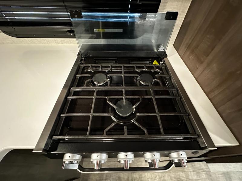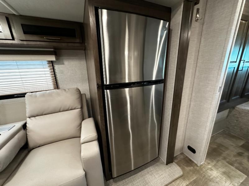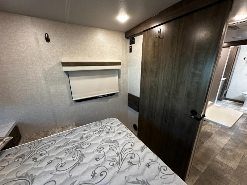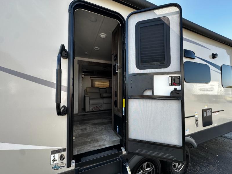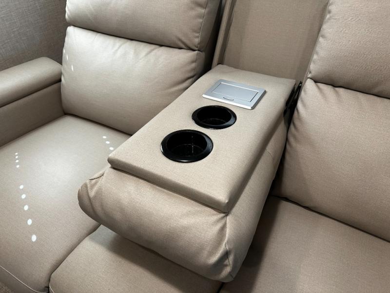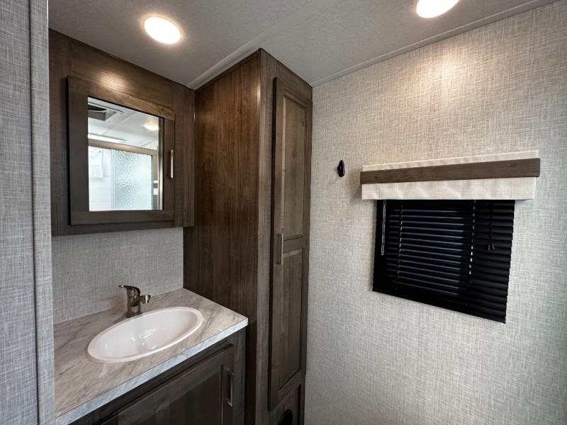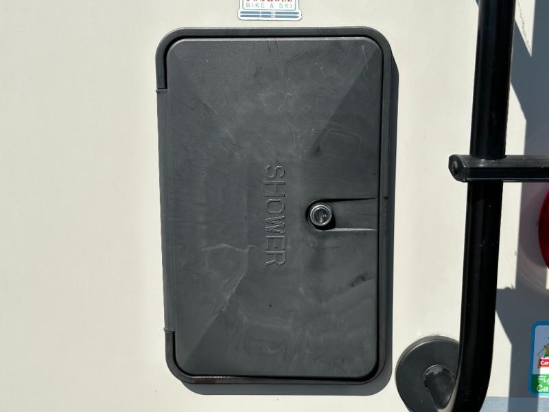 Camping trips to the lake just got sweeter with this dual slide out travel trailer in tow! Once you arrive, unload your gear from the exterior drop-frame pass-through storage, then start lunch on the exterior griddle. If you need a rest after traveling all day, the RV queen bed in the front bedroom is sure to give you comfort, or you can relax on the theater seating. The fireplace and entertainment center with an LED TV will make this space feel just like home, and check out the spacious full rear bath for added privacy. This model also includes an entryway closet/pantry for jackets, shoes, and food!