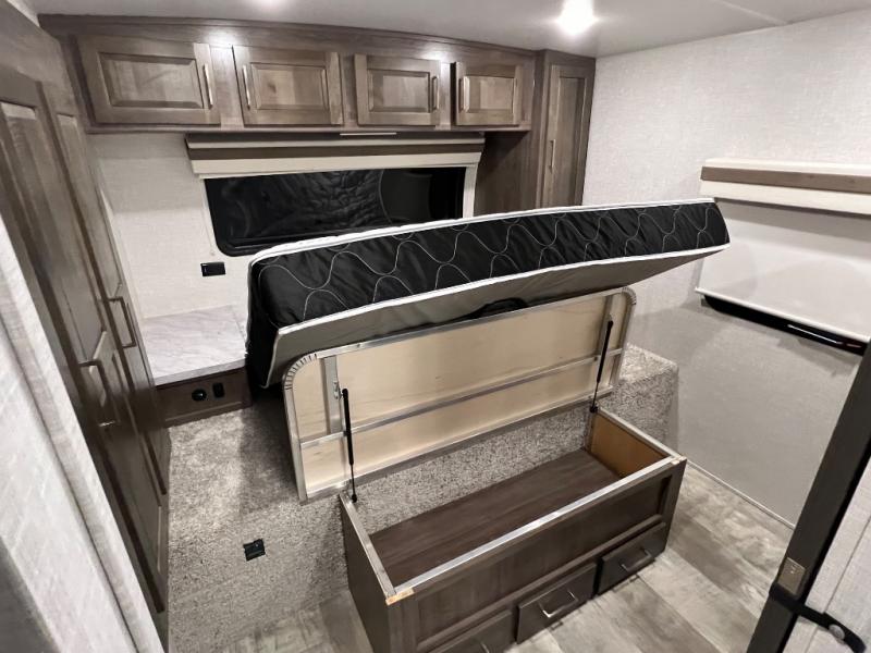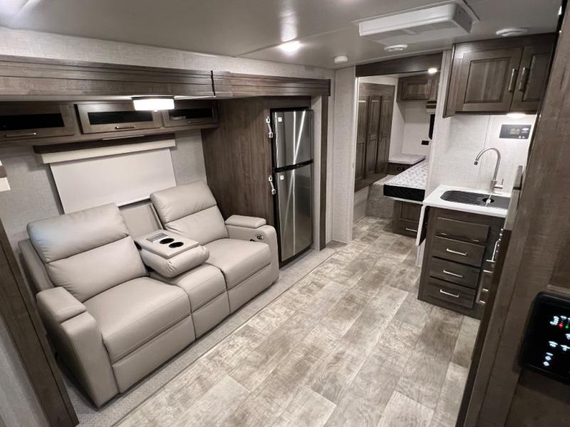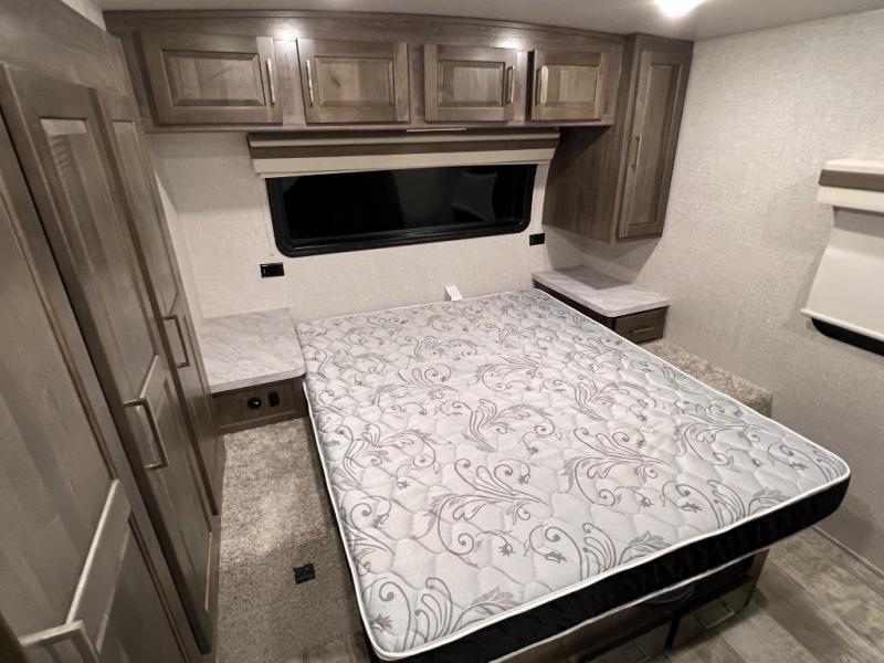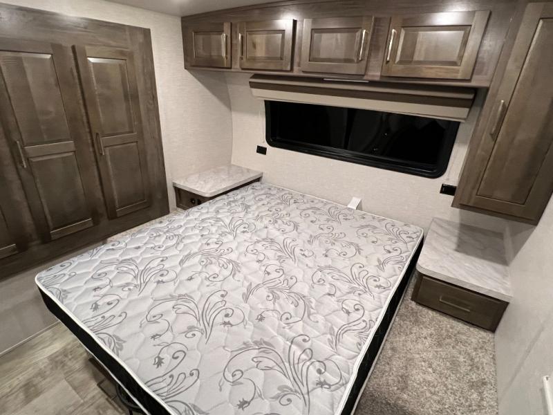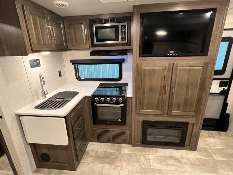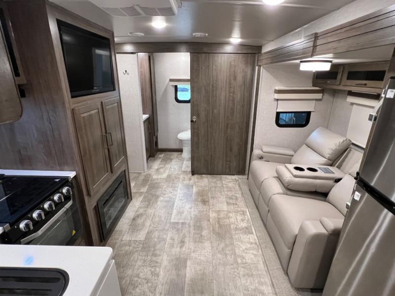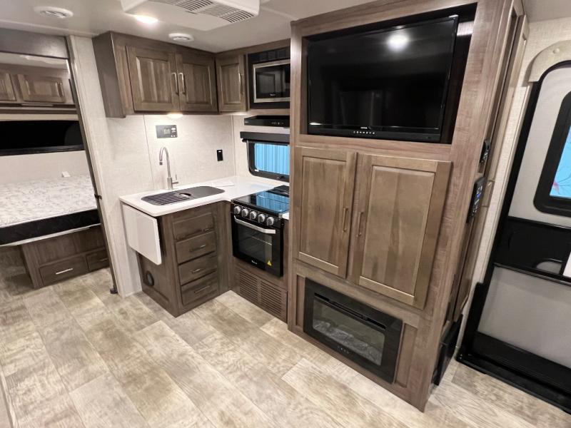 Camping trips to the lake just got sweeter with this dual slide out travel trailer in tow! Once you arrive, unload your gear from the exterior drop-frame pass-through storage, then start lunch on the exterior griddle. If you need a rest after traveling all day, the RV queen bed in the front bedroom is sure to give you comfort, or you can relax on the theater seating. The fireplace and entertainment center with an LED TV will make this space feel just like home, and check out the spacious full rear bath for added privacy. This model also includes an entryway closet/pantry for jackets, shoes, and food!