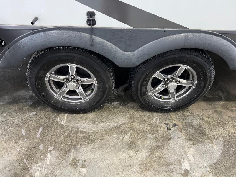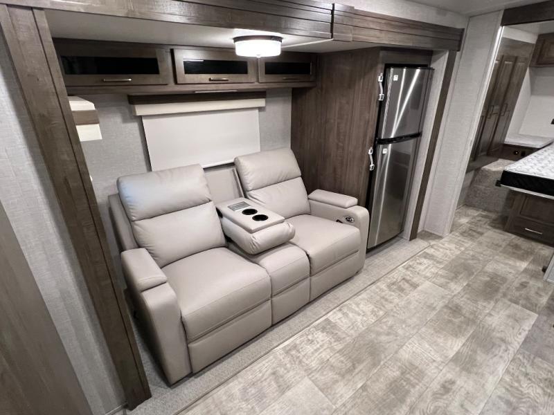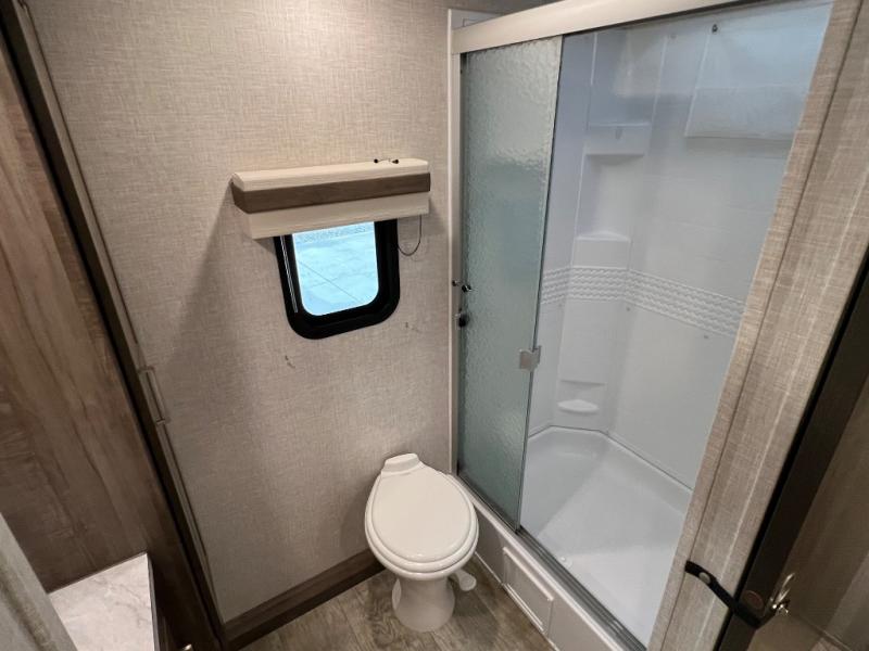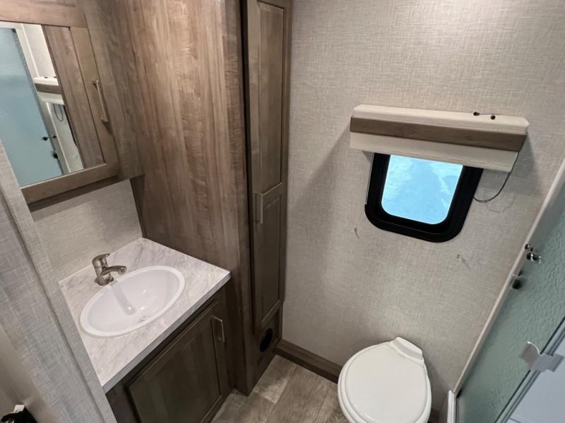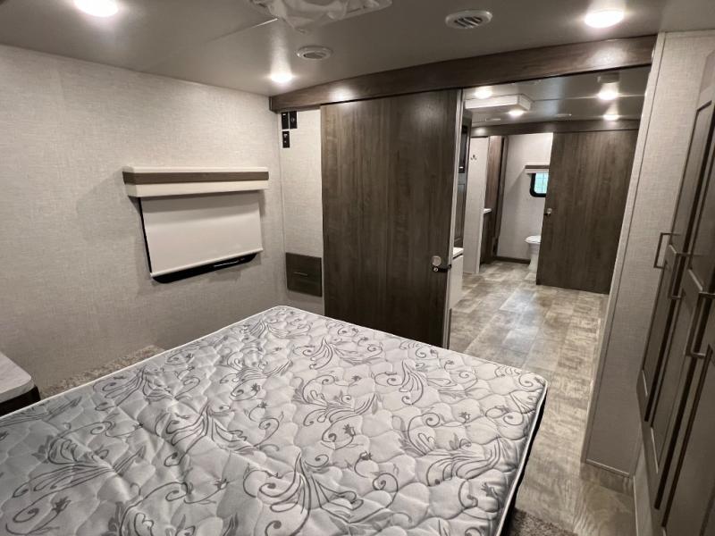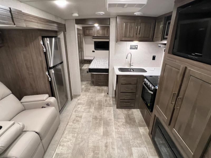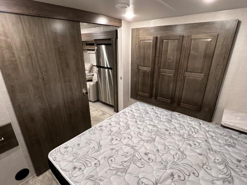 Camping trips to the lake just got sweeter with this dual slide out travel trailer in tow! Once you arrive, unload your gear from the exterior drop-frame pass-through storage, then start lunch on the exterior griddle. If you need a rest after traveling all day, the RV queen bed in the front bedroom is sure to give you comfort, or you can relax on the theater seating. The fireplace and entertainment center with an LED TV will make this space feel just like home, and check out the spacious full rear bath for added privacy. This model also includes an entryway closet/pantry for jackets, shoes, and food!