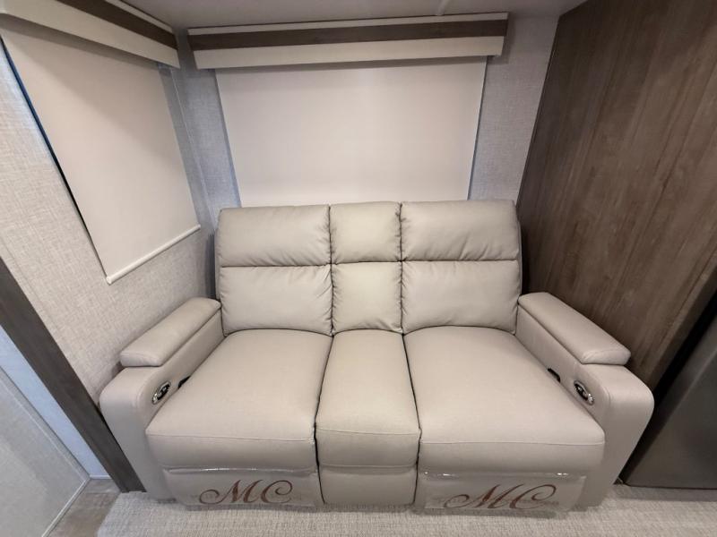 Escape the city life for weekend trips in this cozy couple's trailer. The dual entry doors will allow you to enter in through the rear private bedroom, or the front kitchen/main living area for convenience. You will enjoy relaxing on the theater seating across from the LED TV and fireplace in the evenings, or you can visit outdoors under the 19' power awning. You'll also find an exterior griddle here for quick meals and exterior storage for the fishing poles or hiking gear. This model also includes a walk-through bath with a shower skylight, a linen closet, plus a Showermiser Water Saving System. And don't worry about storage space inside since this model includes an entryway pantry/closet, a second pantry in the front kitchen, plus a large bedroom wardrobe to keep your clothes wrinkle-free!