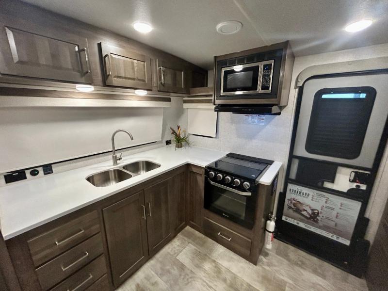 Each Rockwood Mini Lite travel trailer by Forest River is constructed with a fully laminated one-piece walkable roof, sleek frameless windows, and a six-sided full aluminum frame for strength and durability. The 12V thermostatically controlled heated tanks, plus radiant foil in the underbelly, front caps, and slide out floors will allow you to camp well into the colder months, and the 200W roof solar panel will be perfect for a little off-gridding. Each model includes solid surface kitchen countertops, solid wood cabinet doors, night roller shades, plus many more interior features. Having a Teton all in one Wi-Fi booster/LTE prep and antenna on board will allow you to get some work done if it's needed, and the power tongue jack provides hassle-free set up, so you can enjoy more time relaxing!