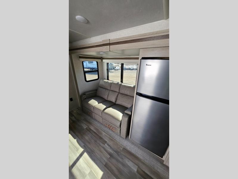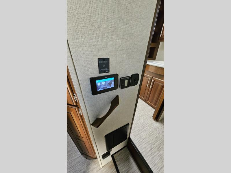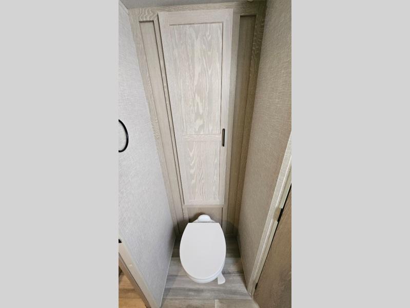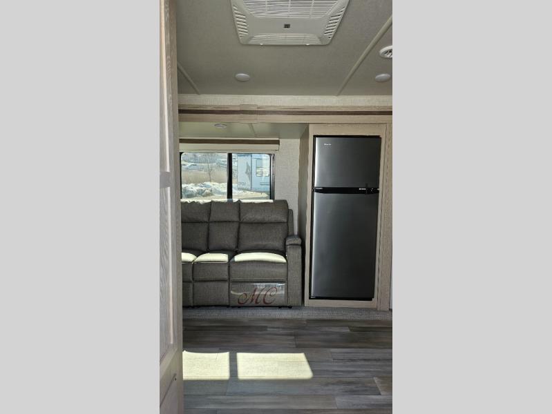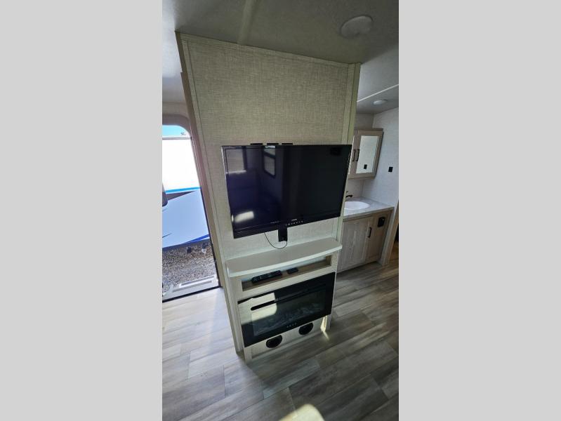 Escape the city life for weekend trips in this cozy couple's trailer. The dual entry doors will allow you to enter in through the rear private bedroom, or the front kitchen/main living area for convenience. You will enjoy relaxing on the theater seating across from the LED TV and fireplace in the evenings, or you can visit outdoors under the 19' power awning. You'll also find an exterior griddle here for quick meals and exterior storage for the fishing poles or hiking gear. This model also includes a walk-through bath with a shower skylight, a linen closet, plus a Showermiser Water Saving System. And don't worry about storage space inside since this model includes an entryway pantry/closet, a second pantry in the front kitchen, plus a large bedroom wardrobe to keep your clothes wrinkle-free!