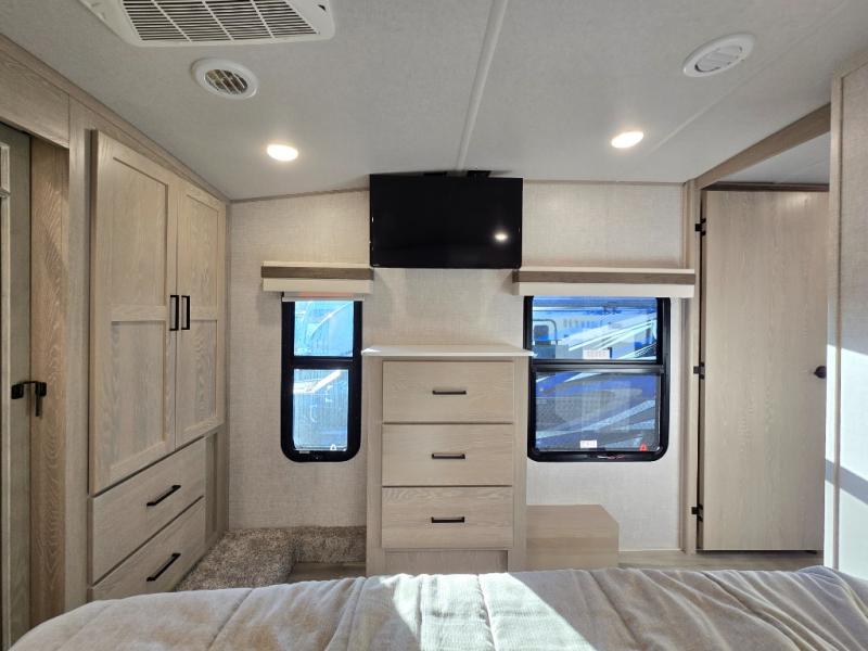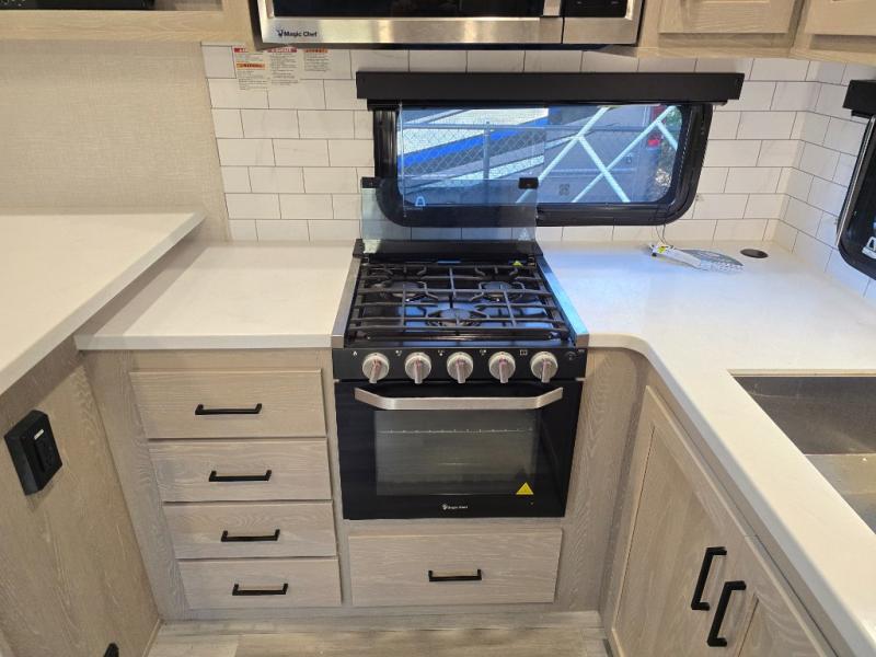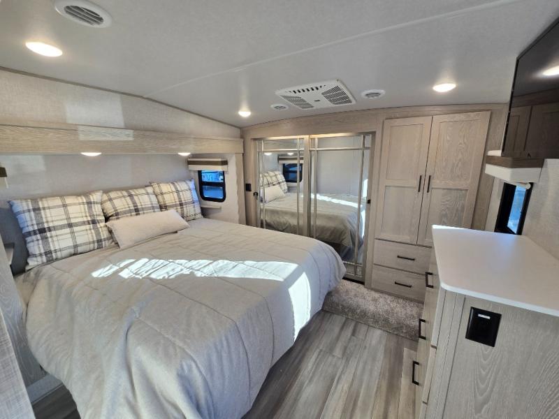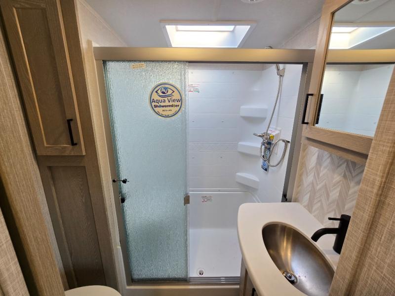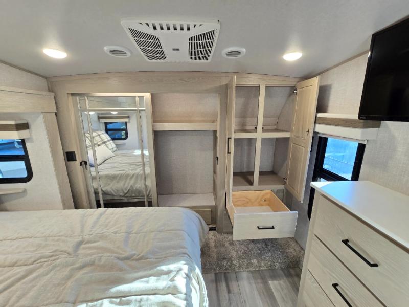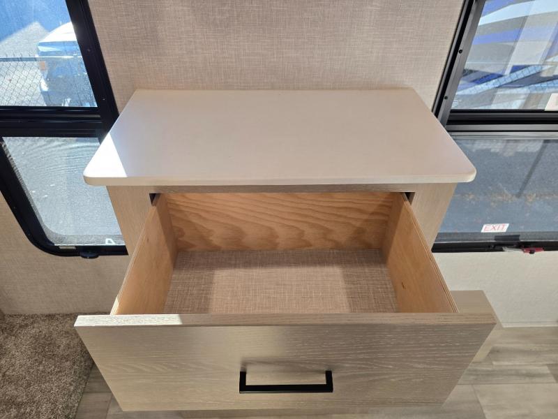 Looking for a spacious bedroom and bathroom for the perfect couple's RV with extra sleeping space for guests? This model provides a queen bed slide out for more interior floor space to get to the front wardrobe with shelves, and the dresser with a window above for great views of your campsite. The bathroom offers a shower with a seat, linen storage, and counter space for your toiletries. The main living and kitchen combined area has a hide-a-bed sofa slide that allows two guests to stay the night or you can choose the optional theater seat. There is also a breakfast bar with stools to dine at, and a U-shaped counter including appliances to make meals and store leftovers. And you will find exterior storage to bring along camping chairs and extra gear.