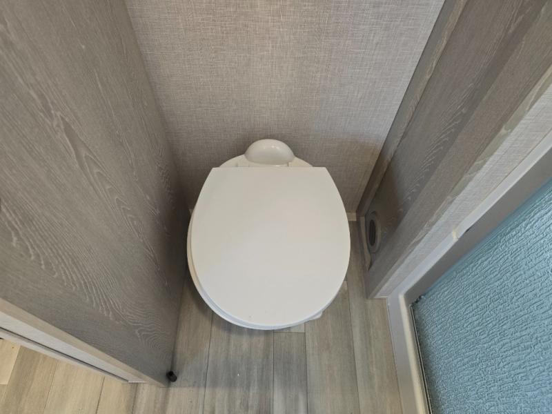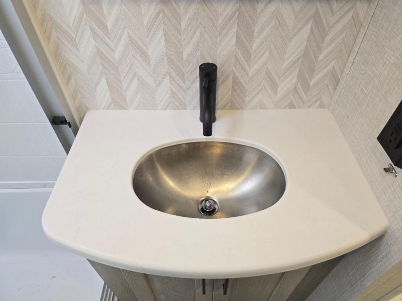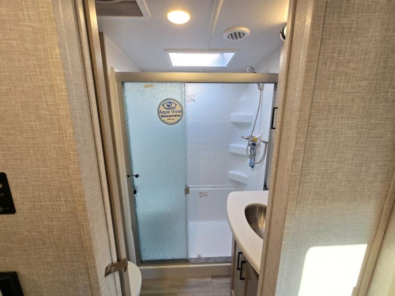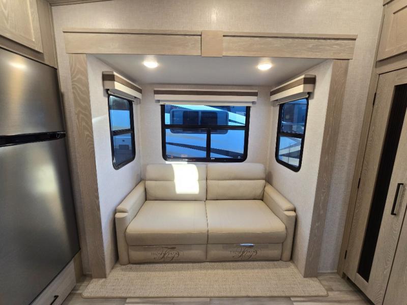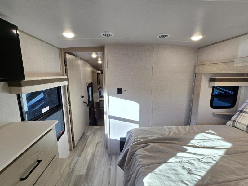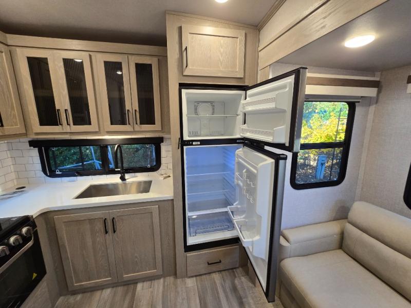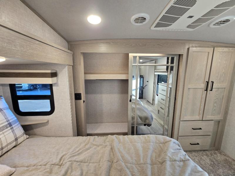 Looking for a spacious bedroom and bathroom for the perfect couple's RV with extra sleeping space for guests? This model provides a queen bed slide out for more interior floor space to get to the front wardrobe with shelves, and the dresser with a window above for great views of your campsite. The bathroom offers a shower with a seat, linen storage, and counter space for your toiletries. The main living and kitchen combined area has a hide-a-bed sofa slide that allows two guests to stay the night or you can choose the optional theater seat. There is also a breakfast bar with stools to dine at, and a U-shaped counter including appliances to make meals and store leftovers. And you will find exterior storage to bring along camping chairs and extra gear.