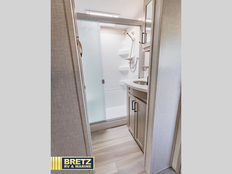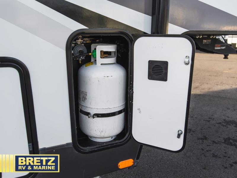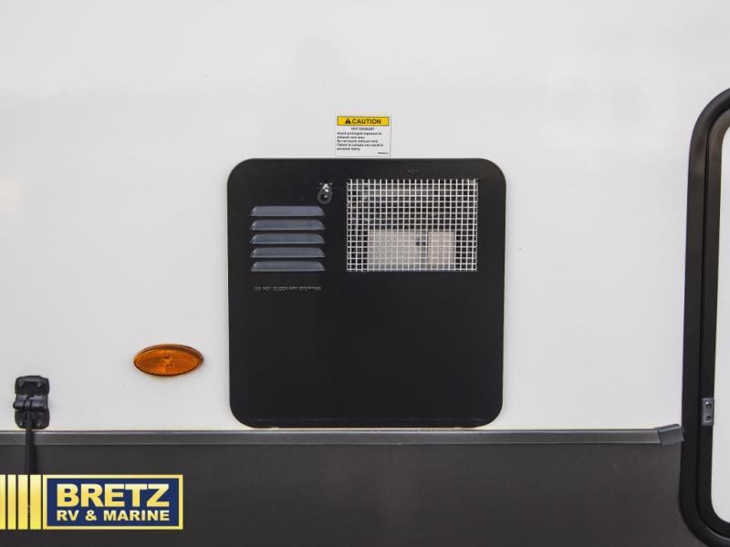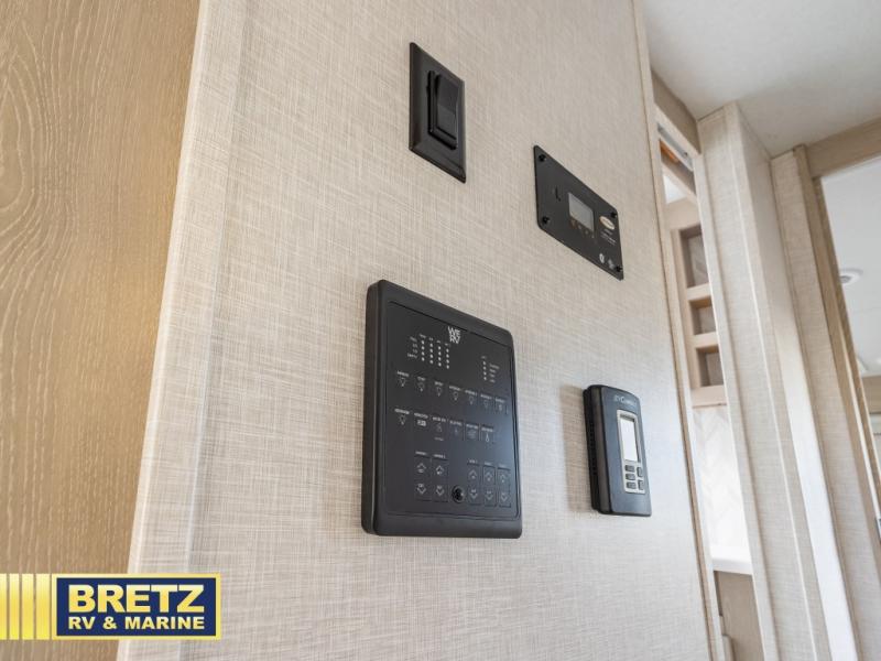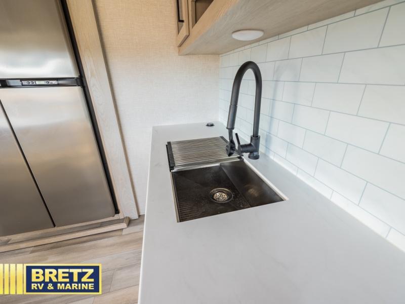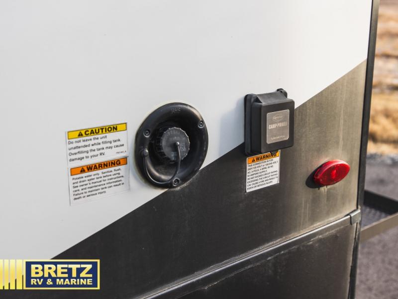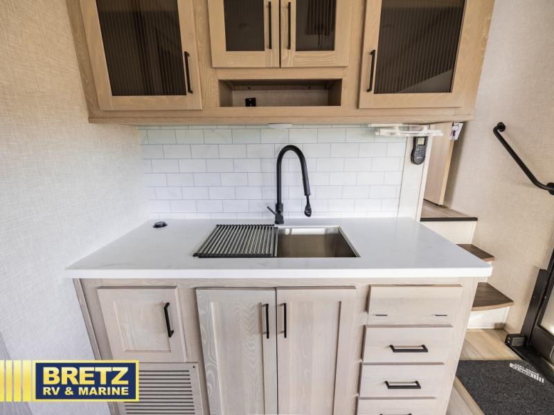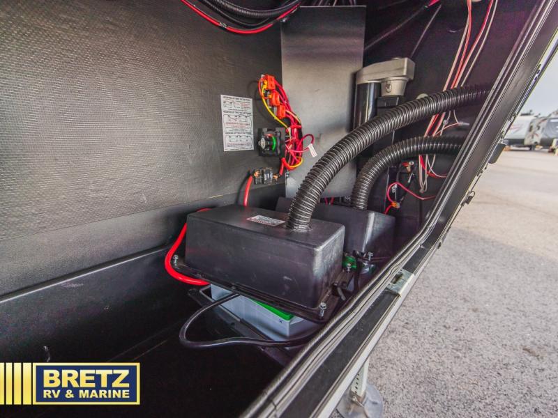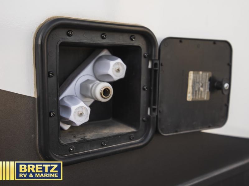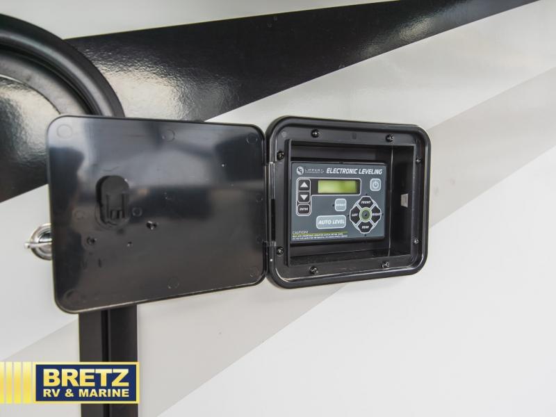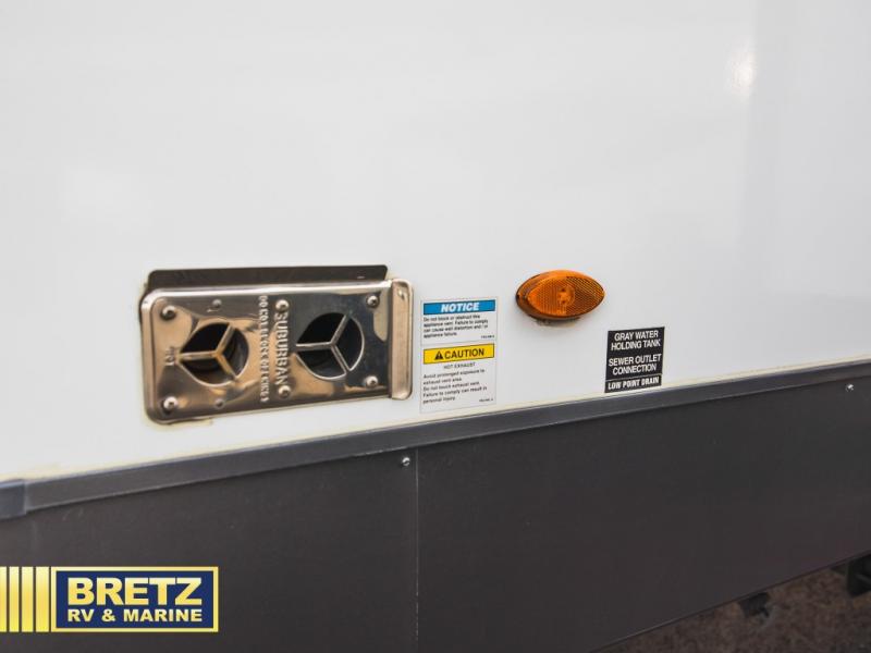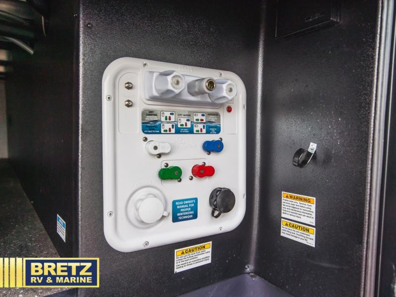 You can enjoy views from inside or outside each day once this RV is set up at the campgrounds! The large windows in the furniture slide and the windows throughout allow you to take in the scenery, and the three slide outs give you a spacious main living and kitchen area as well as front bedroom. You will find lots of seating for guests on the hide-a-bed sofa in the rear, and on the theater seats and booth dinette in the slide, plus there are two stools to use at the kitchen island. The cook will love the residential refrigerator and large pantry to store lots of food, and everyone can enjoy the LED TV and fireplace when visiting and relaxing. And the front bedroom offers a queen bed slide, a front wardrobe, a shirt closet and a space prepped for a washer/dryer option, plus a dresser.