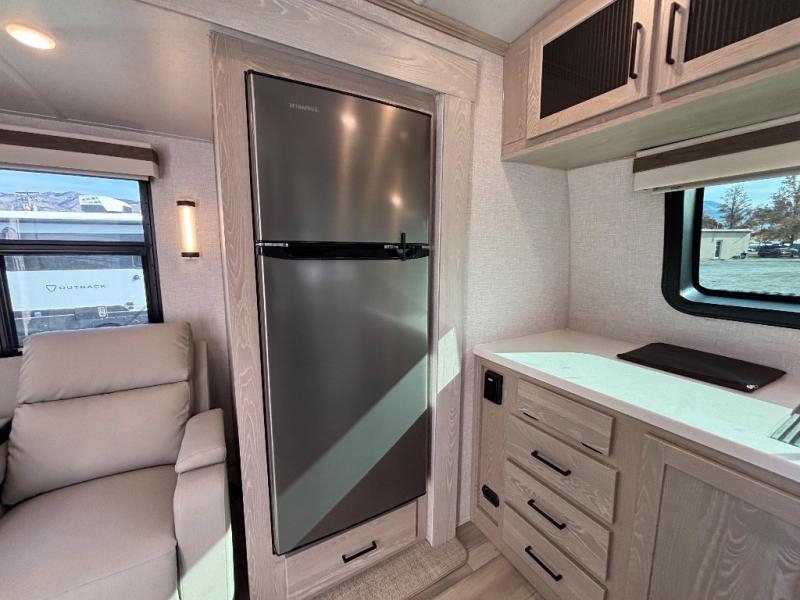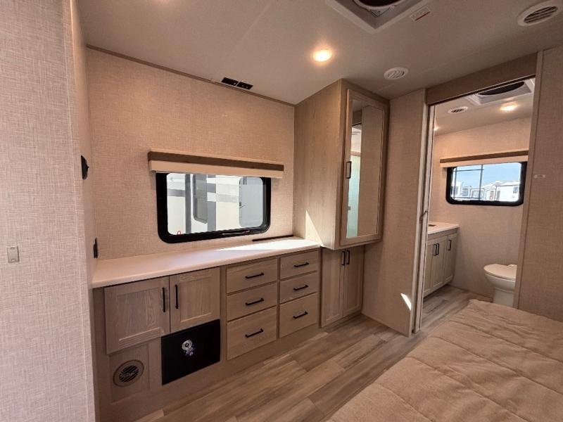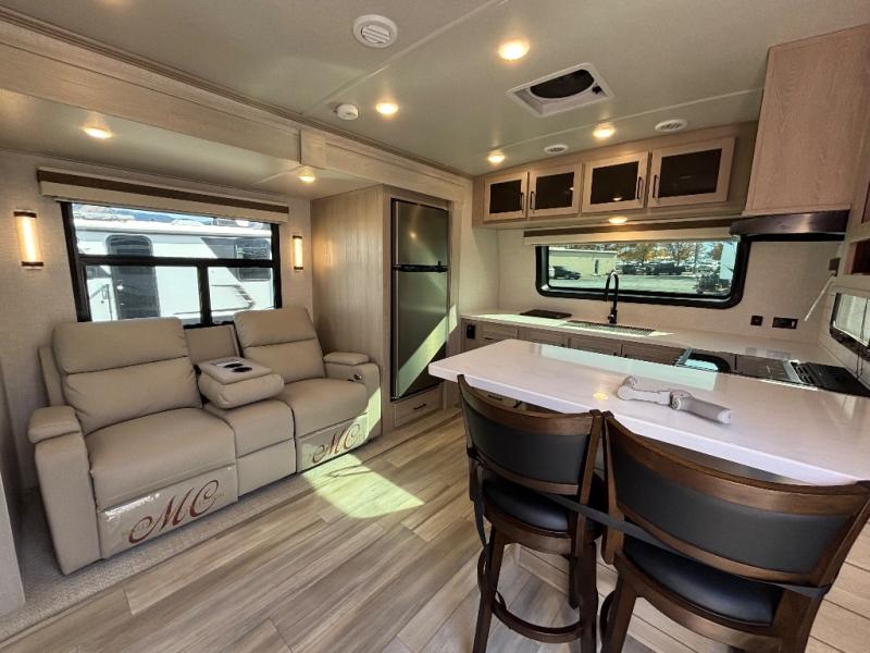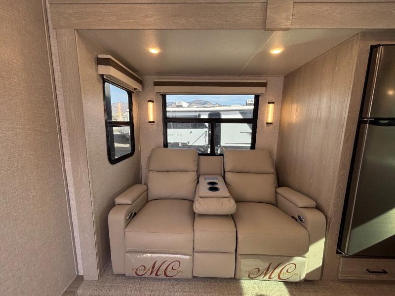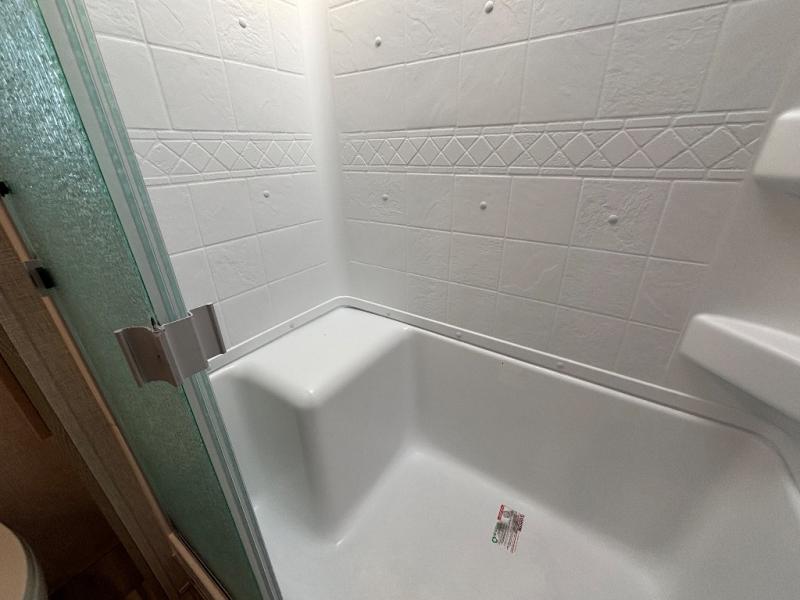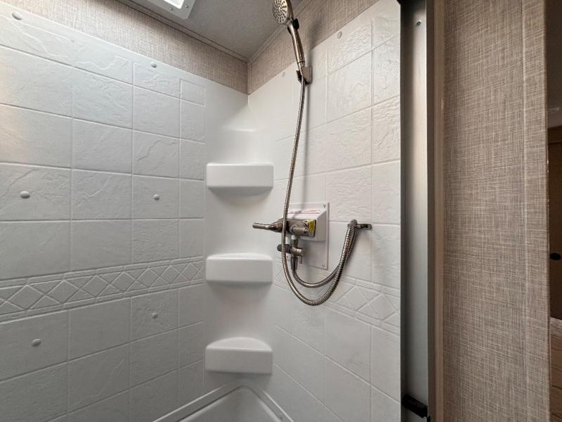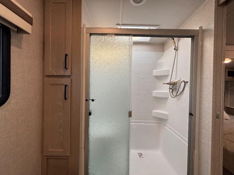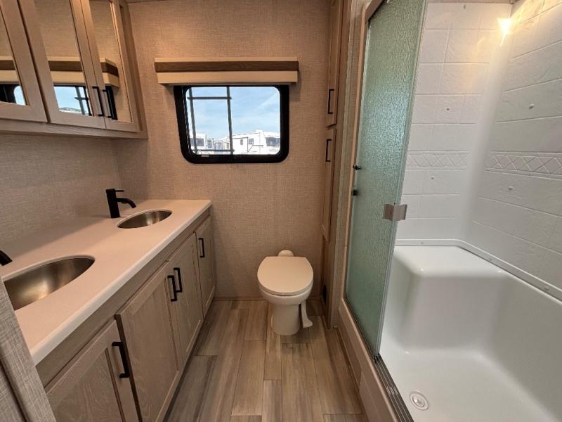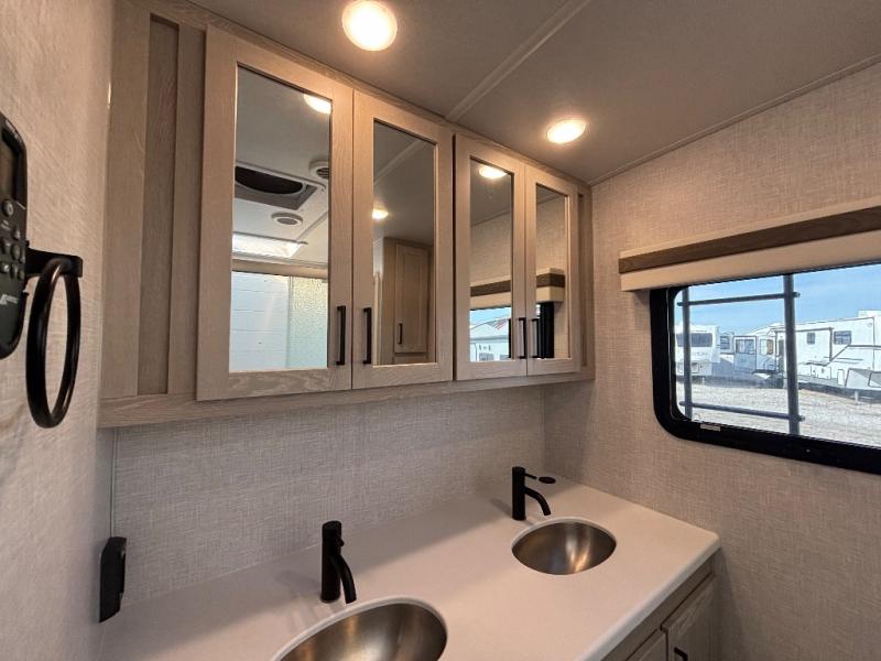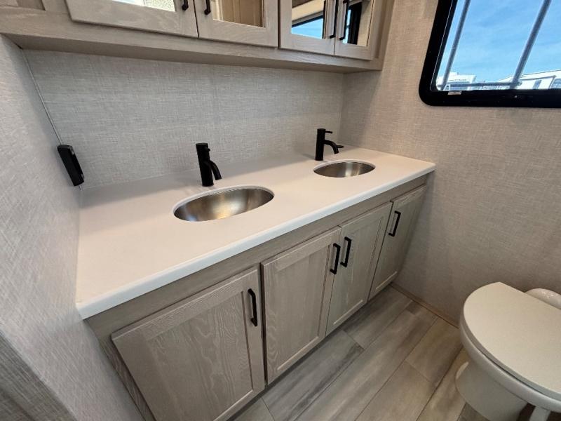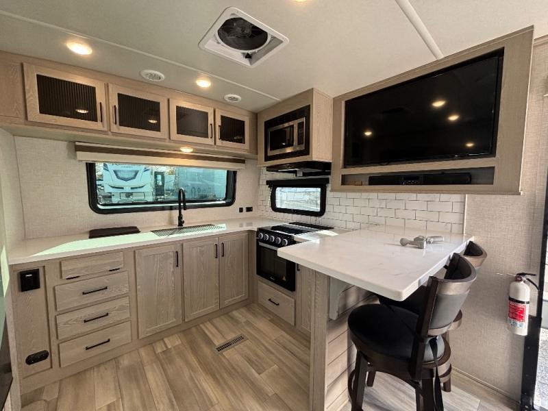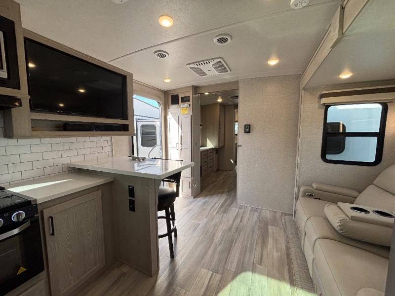 This front kitchen, couple's trailer is ready for adventure when you are! Once you arrive at your destination, prepare a quick lunch on the outside griddle, and enjoy the shade provided by the 19' power awning. You can eat outside, or inside at the counter with stools. The theatre seat will make this travel trailer feel more like home, and the double slides provide more space to stretch out. Within the master bedroom you'll find a king bed, a large wardrobe and a dresser, plus an optional TV. And check out the full rear bath with dual bath sinks and a shower with a seat! Now, that's what I call comfort!