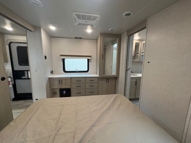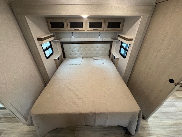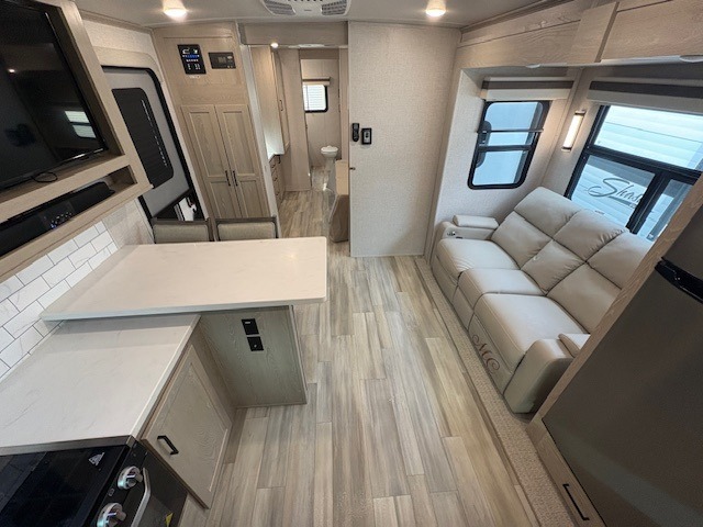 This front kitchen, couple's trailer is ready for adventure when you are! Once you arrive at your destination, prepare a quick lunch on the outside griddle, and enjoy the shade provided by the 19' power awning. You can eat outside, or inside at the counter with stools. The theatre seat will make this travel trailer feel more like home, and the double slides provide more space to stretch out. Within the master bedroom you'll find a king bed, a large wardrobe and a dresser, plus an optional TV. And check out the full rear bath with dual bath sinks and a shower with a seat! Now, that's what I call comfort!
