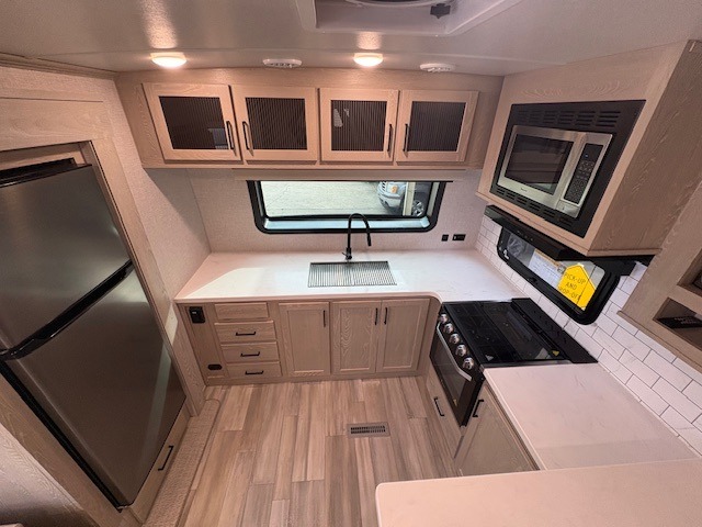 With any Rockwood Signature fifth wheel or travel trailer by Forest River RV, the superior construction includes white or champagne fiberglass sidewalls, a one piece seamless roof membrane, 6-sided aluminum framed walls, floors and roof, plus radiant foil insulation and an enclosed underbelly for use in all types of weather. Some safety standards include Dexter torsion axles, MORryde strut assist steps, and the TST tire pressure monitor system. The interior offers a One Touch OneControl panel with WeRV app control, for lights, awning, slides, water heater and more. You will also appreciate the interior vaulted ceilings, residential soft close doors and drawers, plus solid surface kitchen countertops, a designer kitchen backsplash, plus many more features depending on which Rockwood Signature unit you choose!