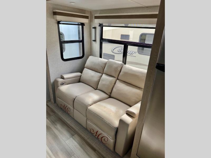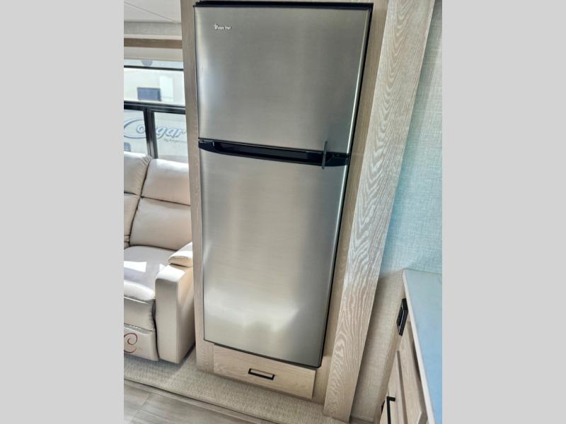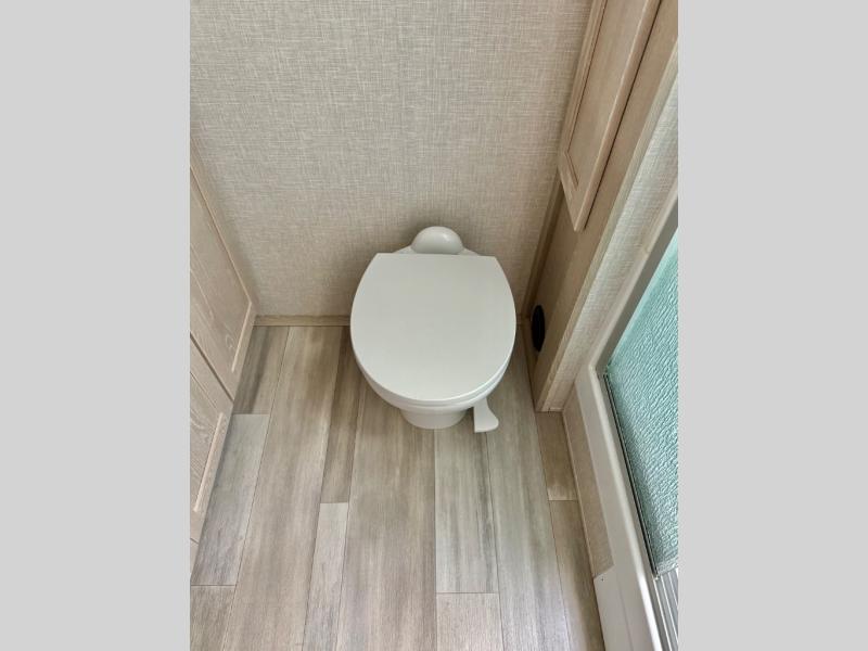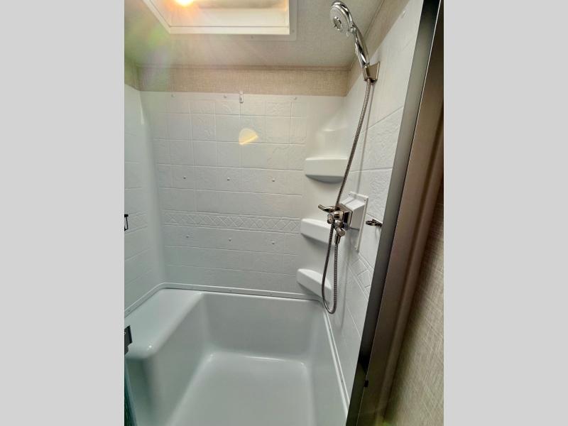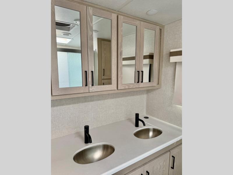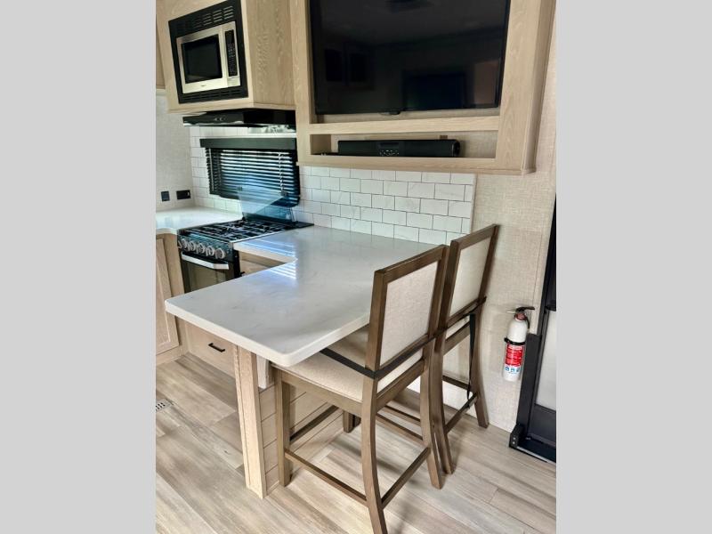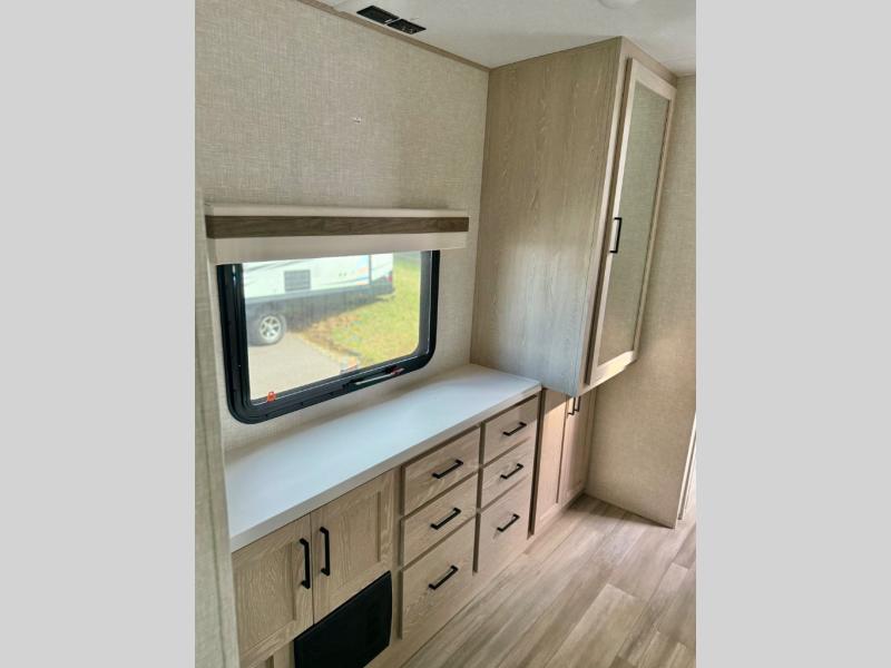 This front kitchen, couple's trailer is ready for adventure when you are! Once you arrive at your destination, prepare a quick lunch on the outside griddle, and enjoy the shade provided by the 19' power awning. You can eat outside, or inside at the counter with stools. The theatre seat will make this travel trailer feel more like home, and the double slides provide more space to stretch out. Within the master bedroom you'll find a king bed, a large wardrobe and a dresser, plus an optional TV. And check out the full rear bath with dual bath sinks and a shower with a seat! Now, that's what I call comfort!