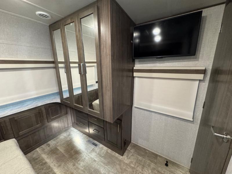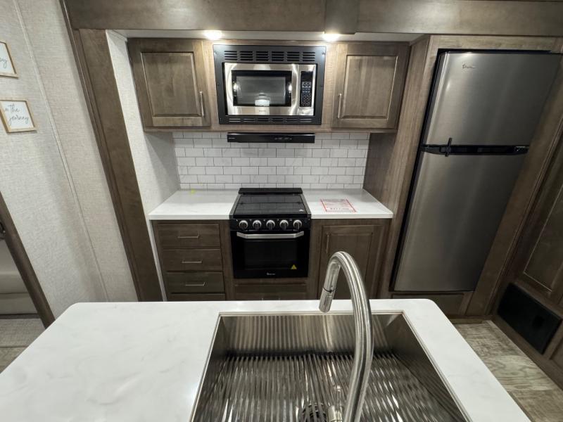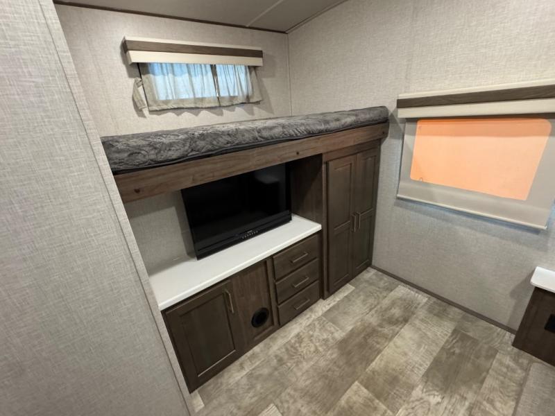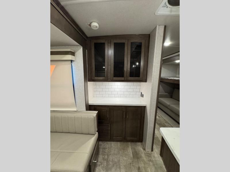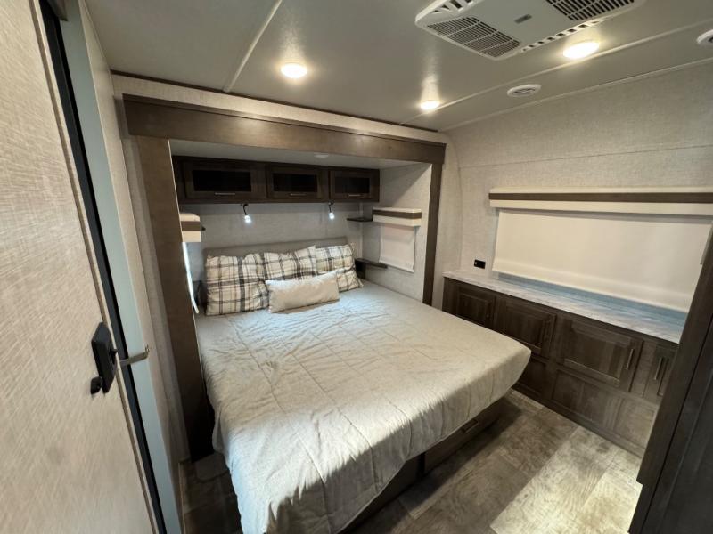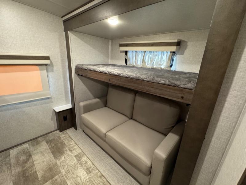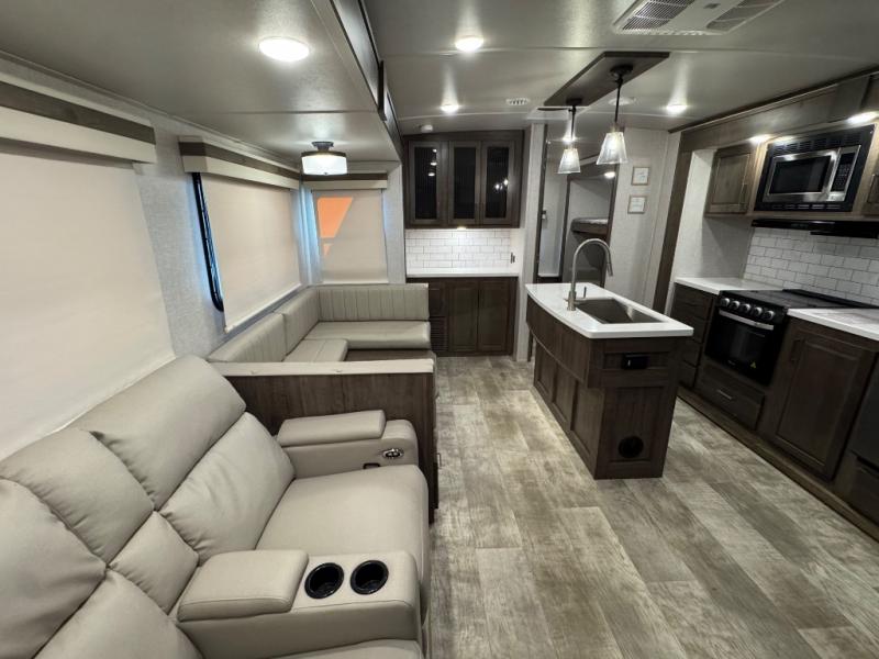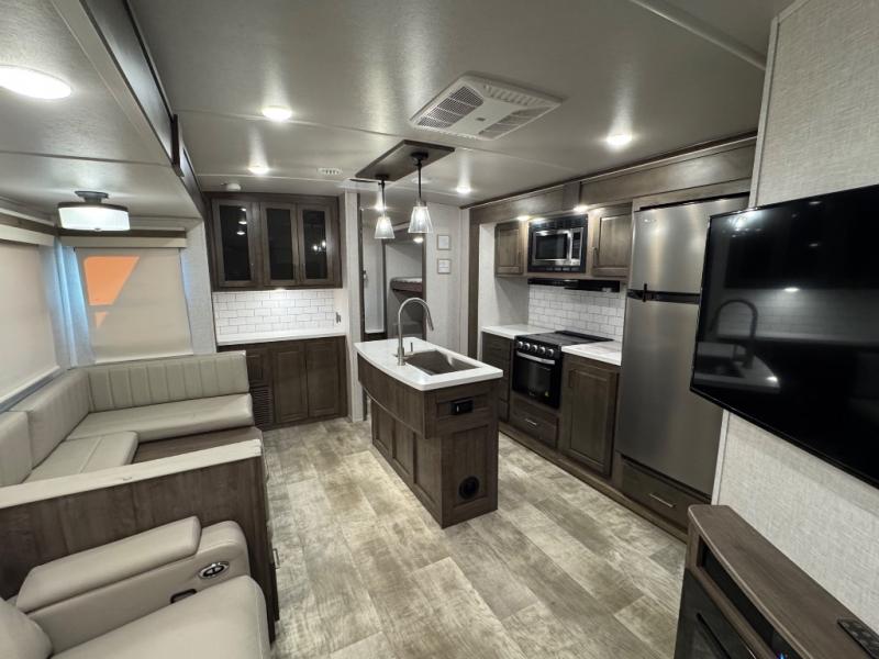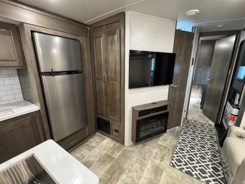 Family vacations and weekend excursions with friends just got sweeter with this travel trailer in tow. The rear private bunkhouse includes a slide out for more space, two bunks, a hide-a-bed sofa. Head to the main living area to relax on the hide-a-bed sofa by the fireplace, or prepare lunch at the kitchen island. If the weather is nice, you may just want to go outdoors to cook on the outside kitchen. There are two power awnings here, and Solid Step entry steps for a sturdy entrance into the trailer. When it's time to call it a night, head to the front master bedroom to enjoy your queen bed slide out, large wardrobe, plus a large front counter with cabinets for more storage.