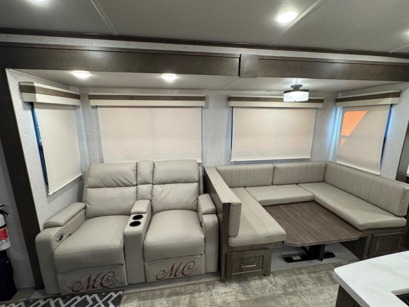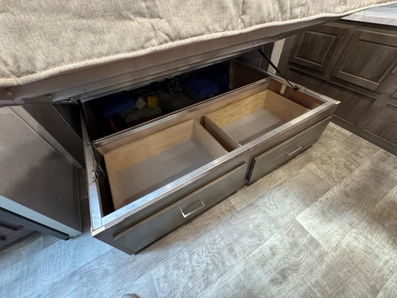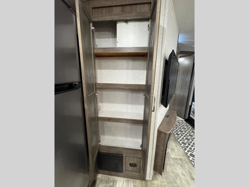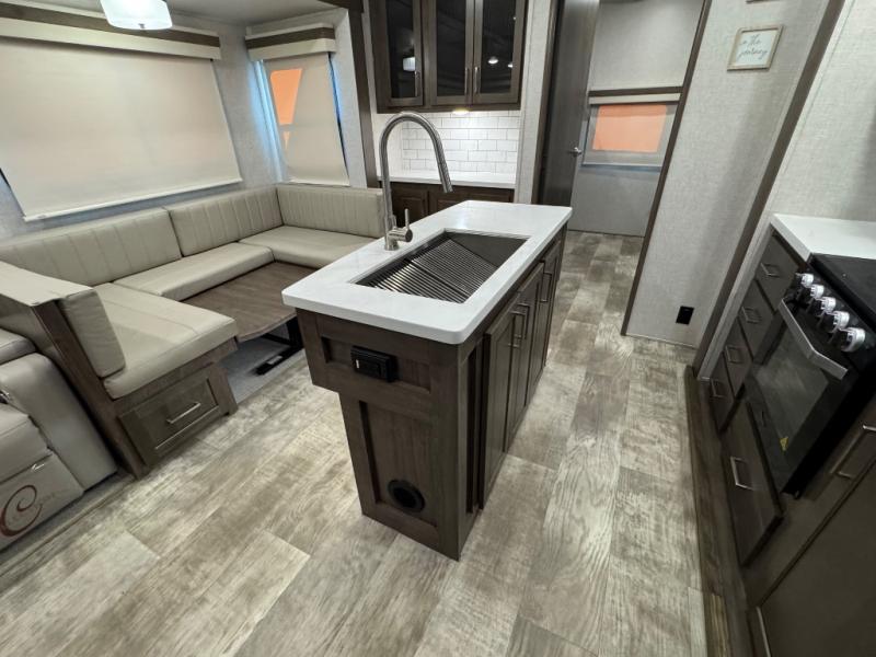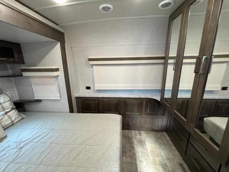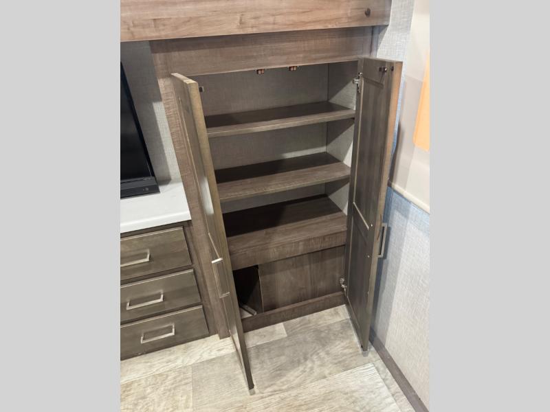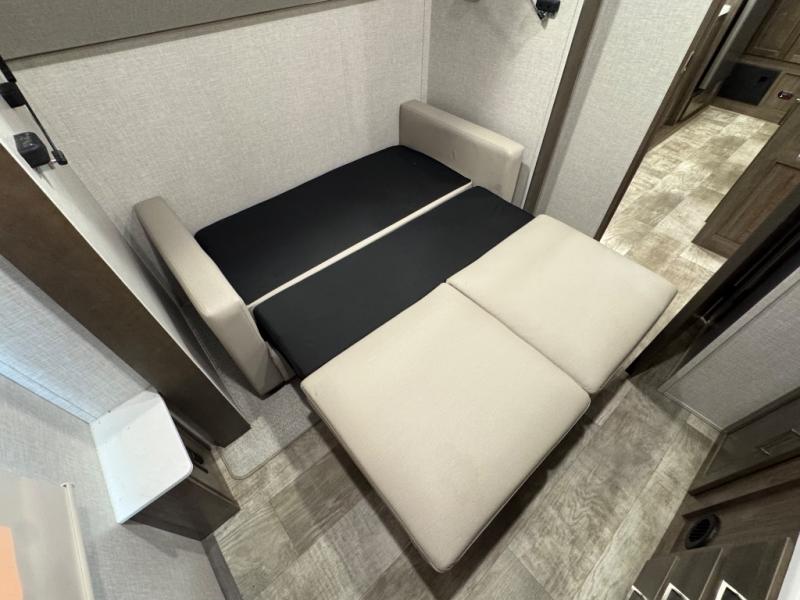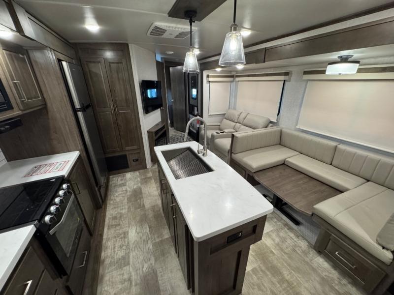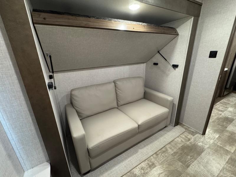 Family vacations and weekend excursions with friends just got sweeter with this travel trailer in tow. The rear private bunkhouse includes a slide out for more space, two bunks, a hide-a-bed sofa. Head to the main living area to relax on the hide-a-bed sofa by the fireplace, or prepare lunch at the kitchen island. If the weather is nice, you may just want to go outdoors to cook on the outside kitchen. There are two power awnings here, and Solid Step entry steps for a sturdy entrance into the trailer. When it's time to call it a night, head to the front master bedroom to enjoy your queen bed slide out, large wardrobe, plus a large front counter with cabinets for more storage.