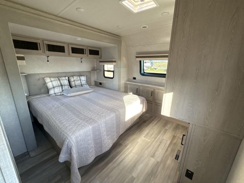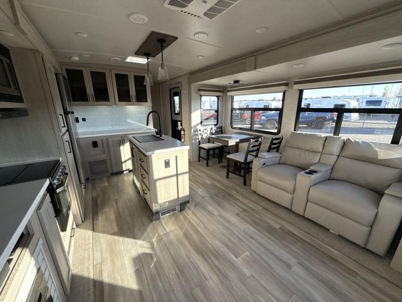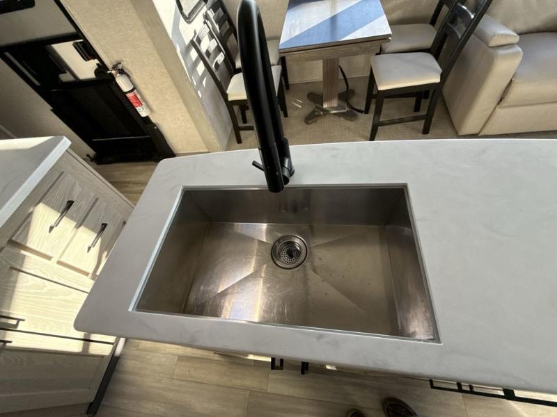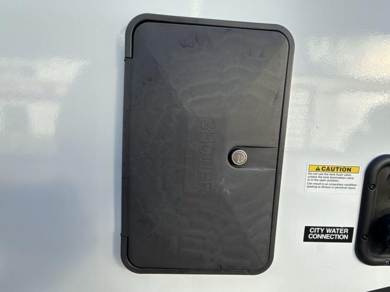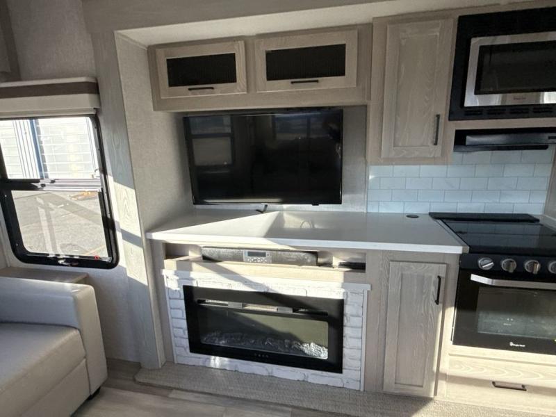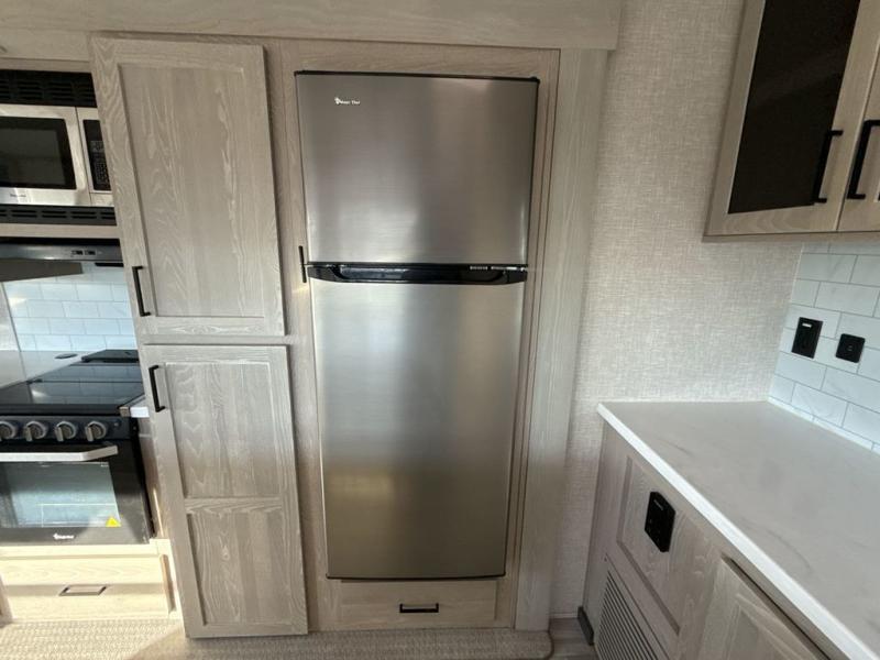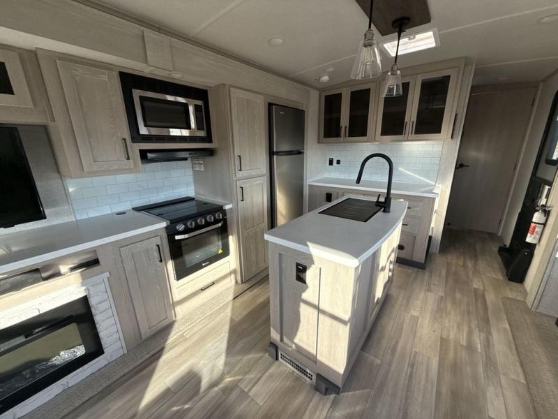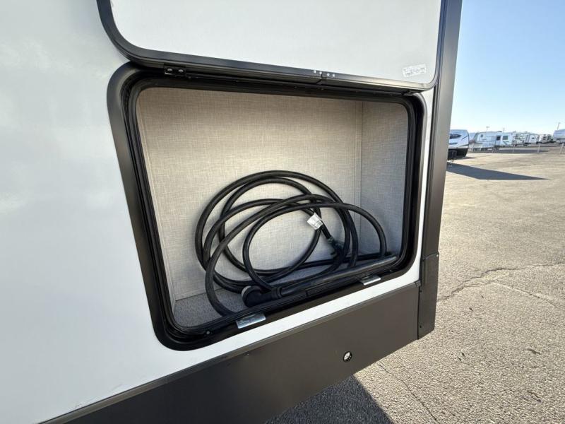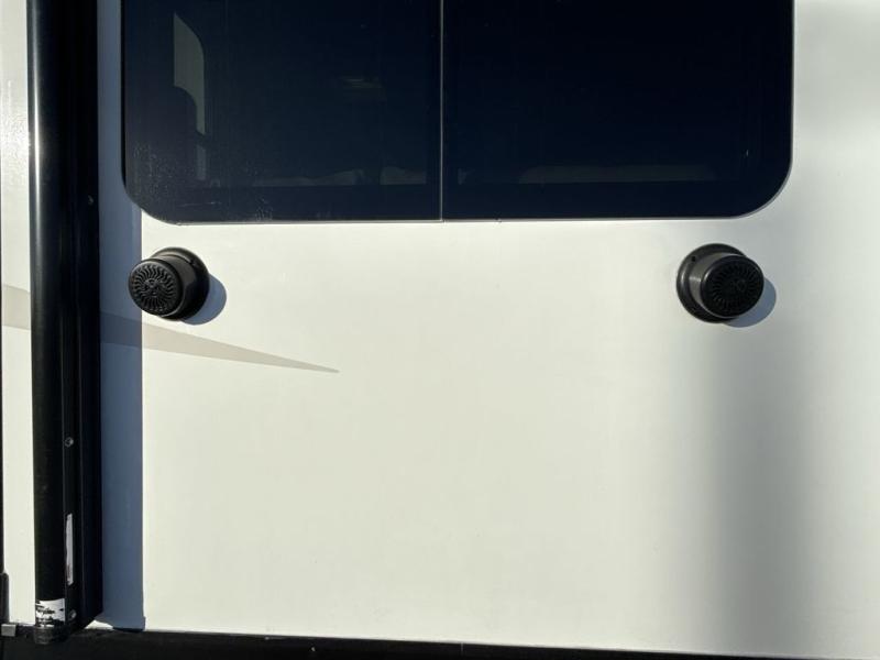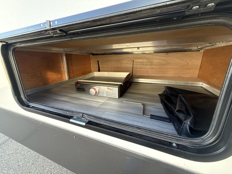 You're going to love the amount of natural light in this model with large windows in the back and the door side. The chef of the group will love the kitchen island, and there is tons of storage space for dishes, food, and knickknacks. The entertainment center with LED TV will allow you to watch movies at night, or you may just find yourselves outside under the two power awnings with LED lights. There is also an outside griddle here to cook pancakes in the morning. The king bed is sure to bring comfort, and you'll appreciate the large wardrobe to keep your clothes tidy. There is even a space that has been prepped to add an optional washer and dryer!