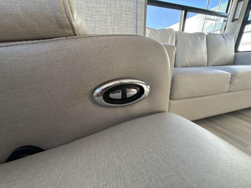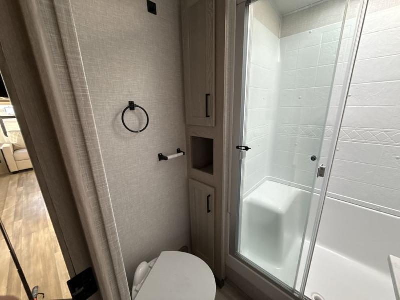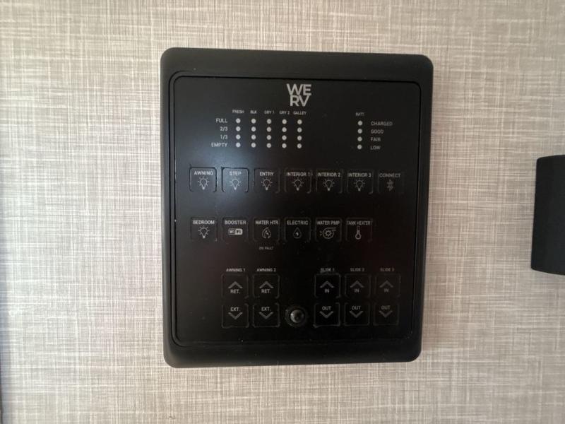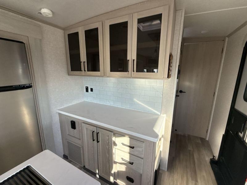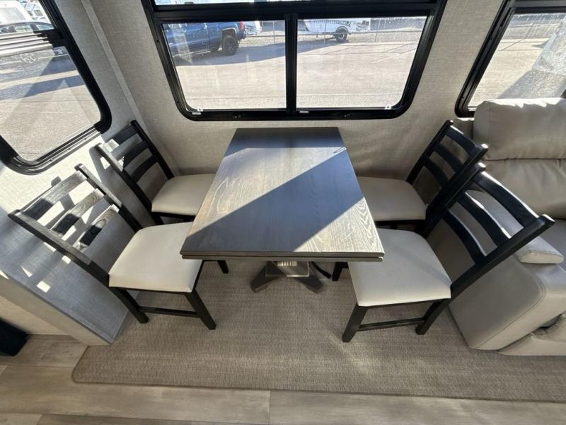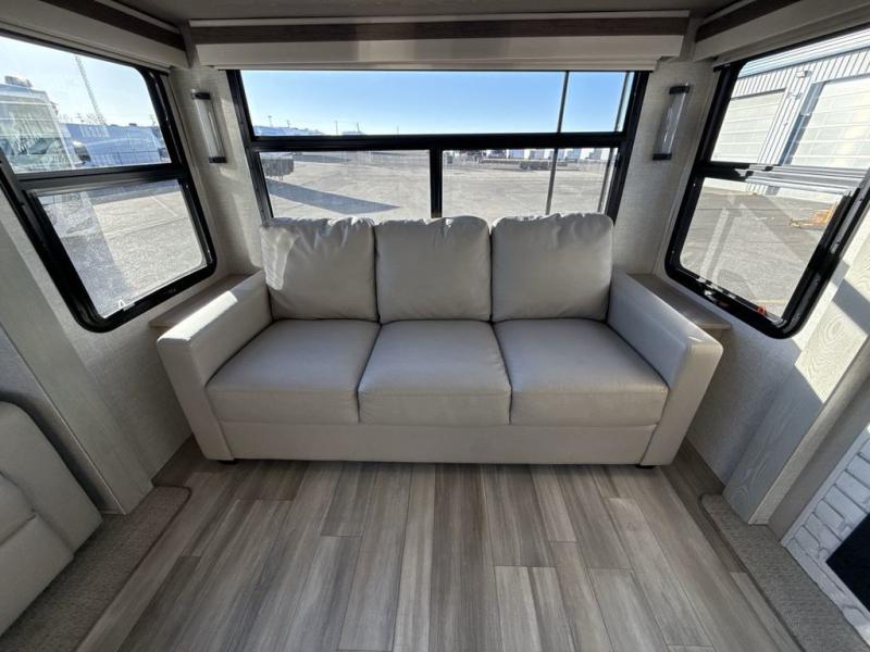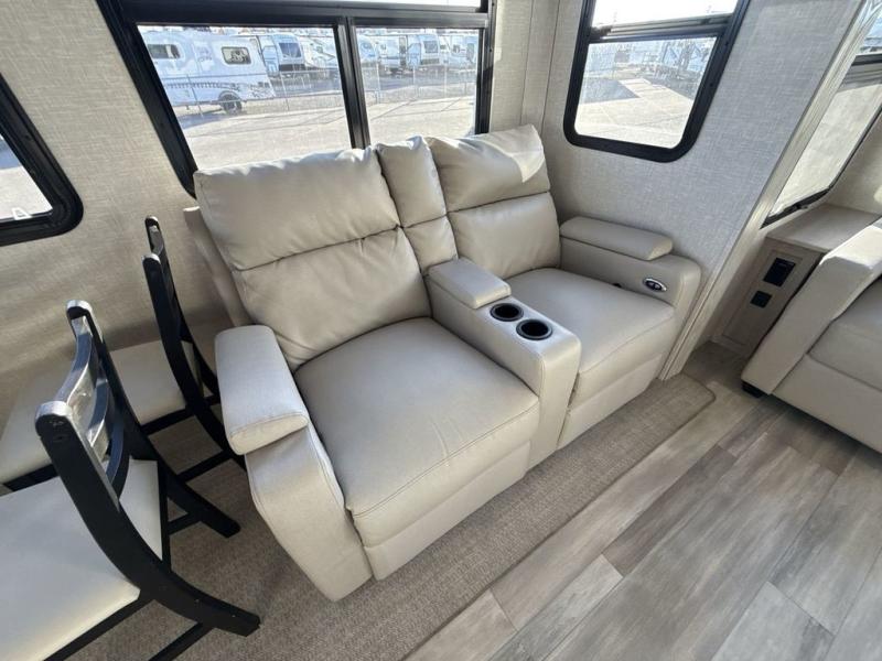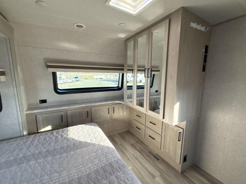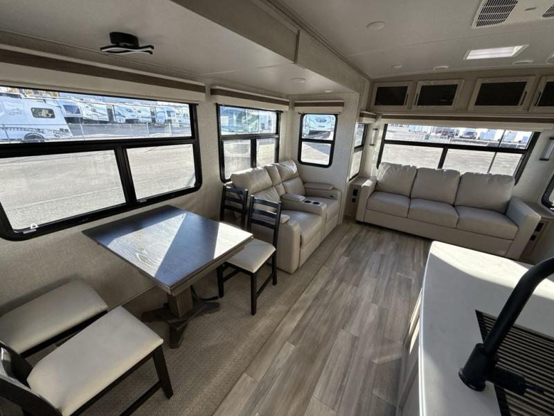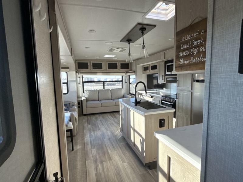 You're going to love the amount of natural light in this model with large windows in the back and the door side. The chef of the group will love the kitchen island, and there is tons of storage space for dishes, food, and knickknacks. The entertainment center with LED TV will allow you to watch movies at night, or you may just find yourselves outside under the two power awnings with LED lights. There is also an outside griddle here to cook pancakes in the morning. The king bed is sure to bring comfort, and you'll appreciate the large wardrobe to keep your clothes tidy. There is even a space that has been prepped to add an optional washer and dryer!