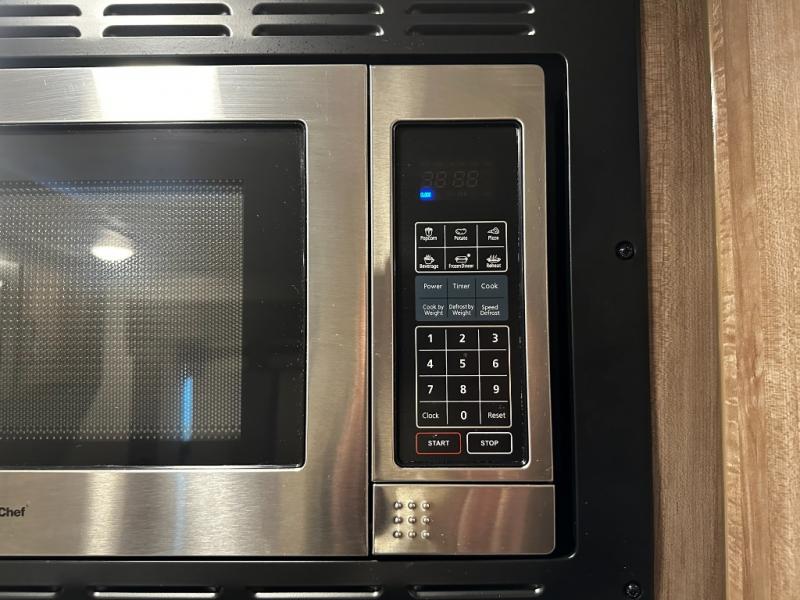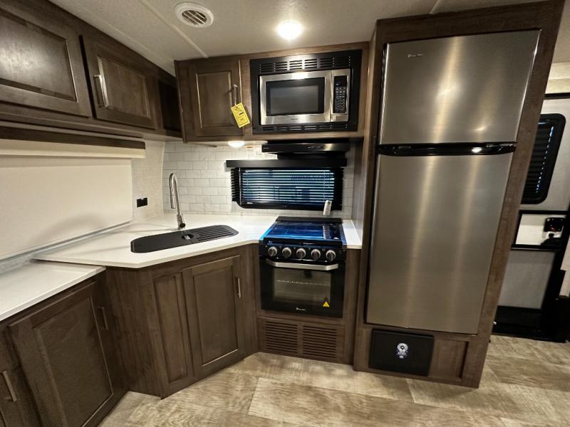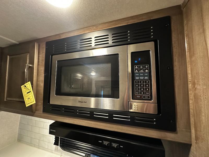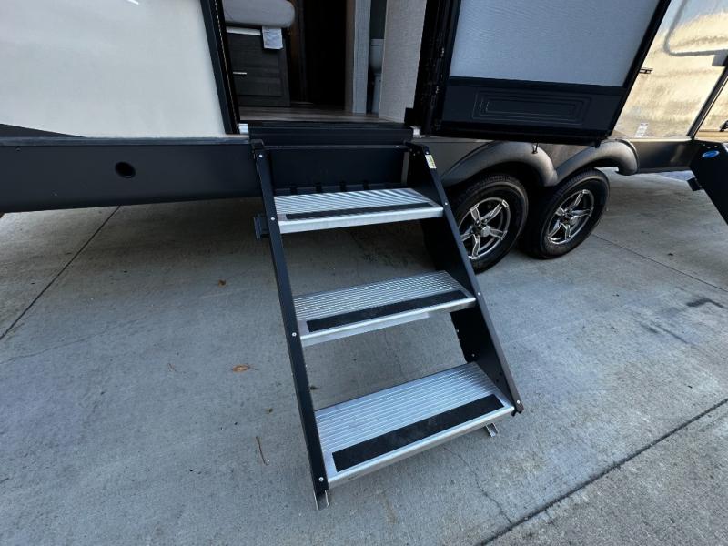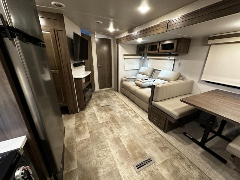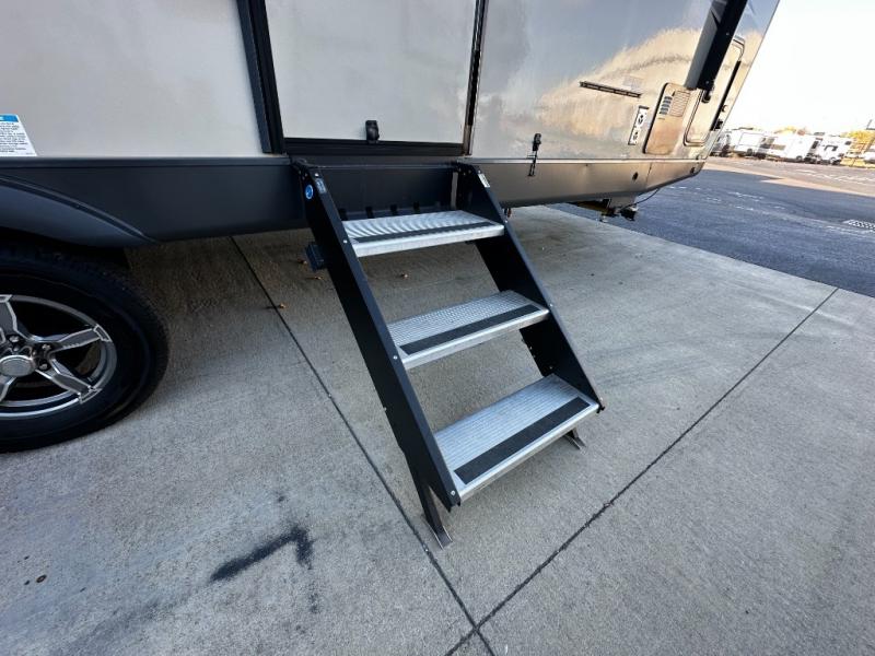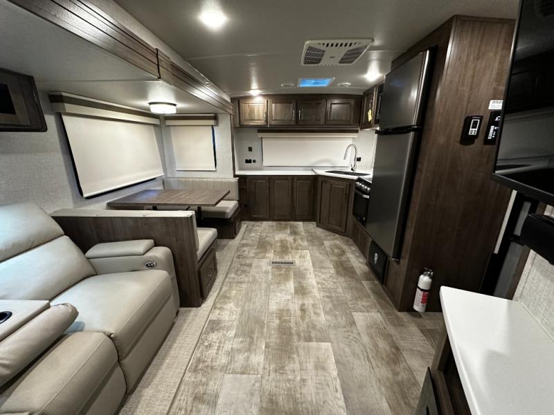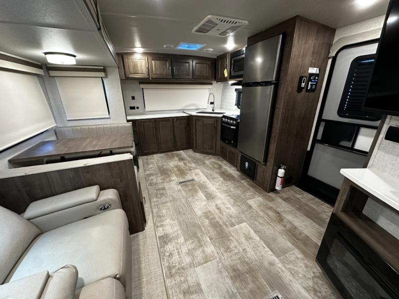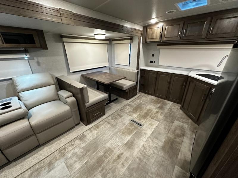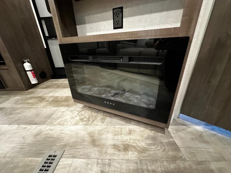 When you are outside this trailer you can enjoy the protection from the 21' power awning, and whip up a meal using the outside griddle. You will find exterior storage for your extra gear, and a ladder on the rear. You get to choose which entrance to step up into, be it the spacious rear bedroom with a queen bed slide and a wardrobe, or the main entry into the kitchen and living area. The furniture slide includes a booth dinette to eat your meals at, and theater seating to watch the LED TV with fireplace below. And the cook will love the front kitchen with extra counter space, and the appliances are nearby to make warm meals, and the pantry is next to the entry allowing you to grab a snack on your way out for a hike.