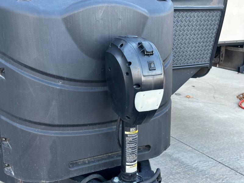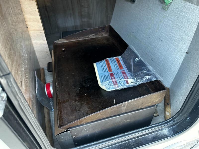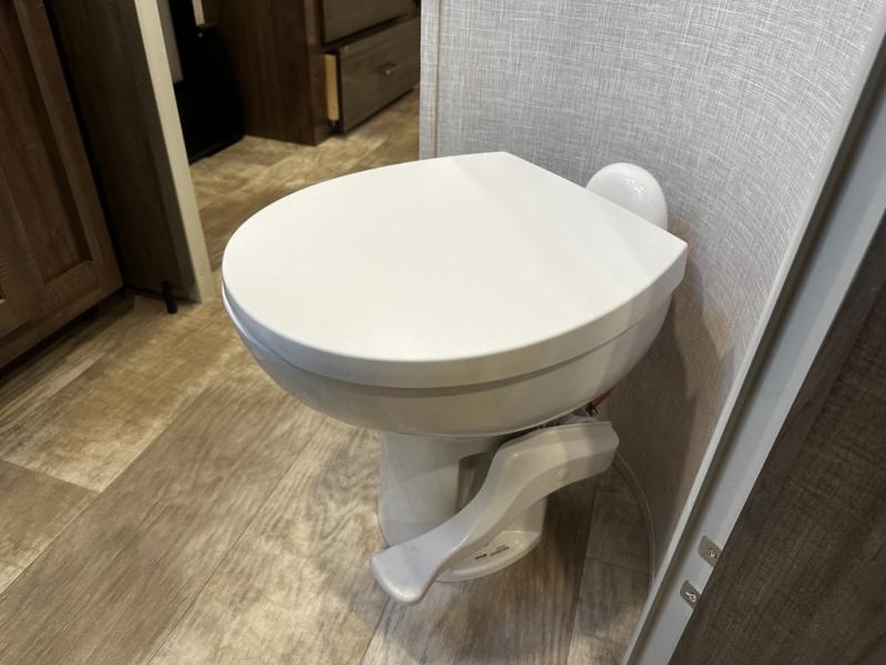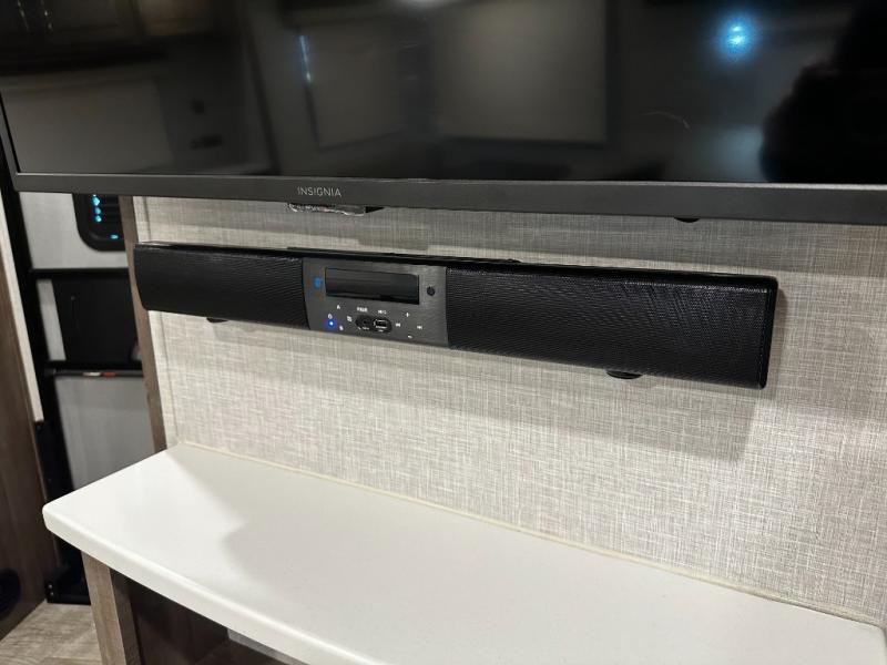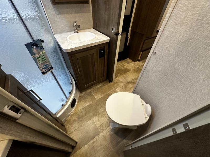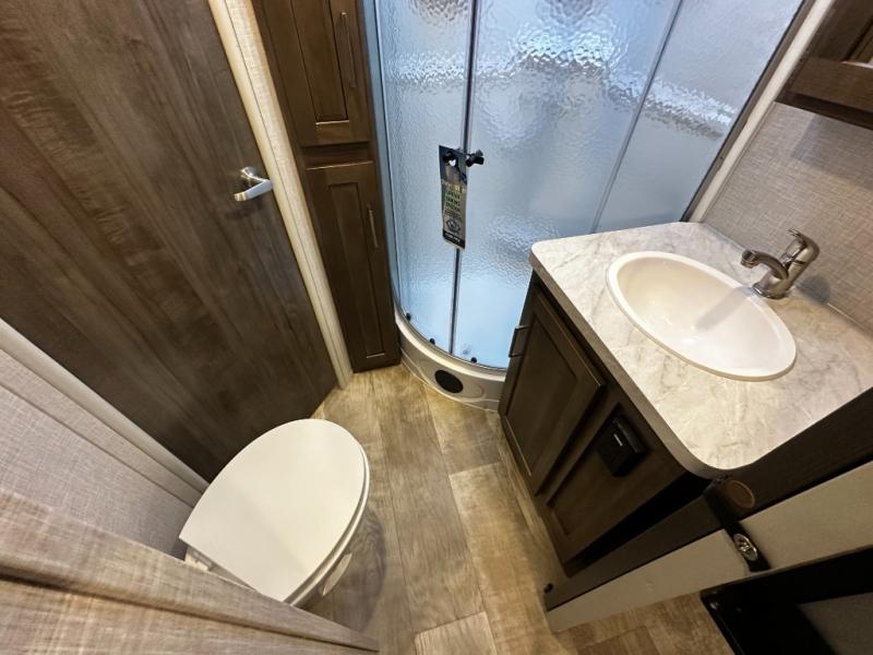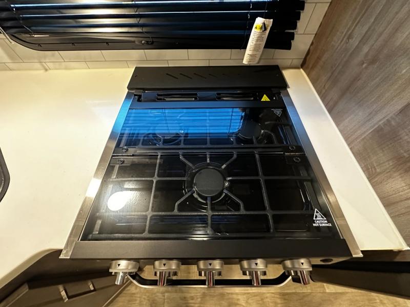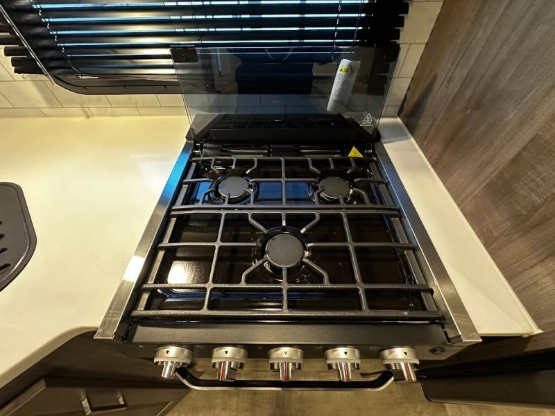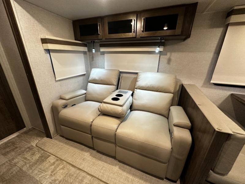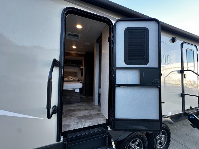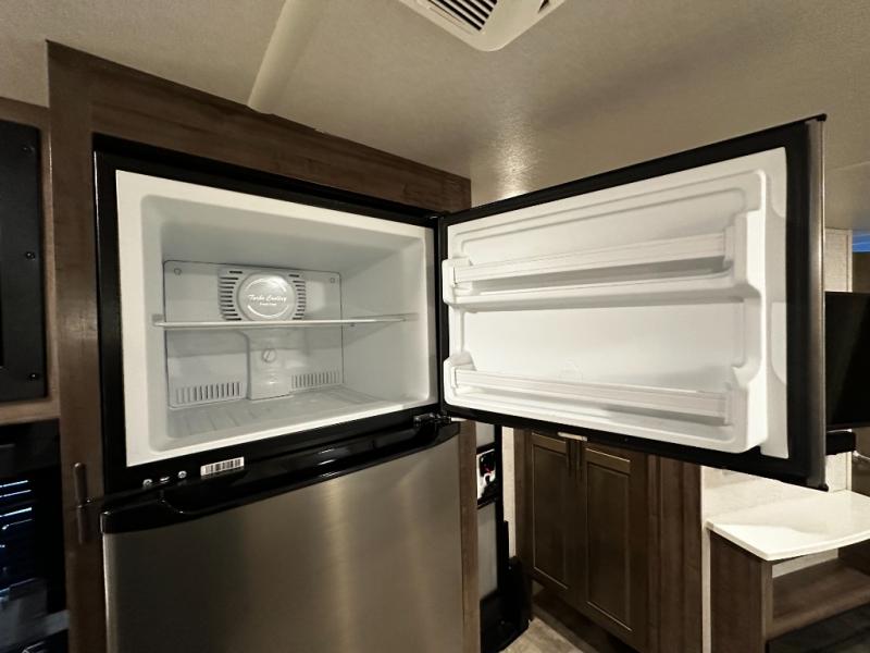 When you are outside this trailer you can enjoy the protection from the 21' power awning, and whip up a meal using the outside griddle. You will find exterior storage for your extra gear, and a ladder on the rear. You get to choose which entrance to step up into, be it the spacious rear bedroom with a queen bed slide and a wardrobe, or the main entry into the kitchen and living area. The furniture slide includes a booth dinette to eat your meals at, and theater seating to watch the LED TV with fireplace below. And the cook will love the front kitchen with extra counter space, and the appliances are nearby to make warm meals, and the pantry is next to the entry allowing you to grab a snack on your way out for a hike.