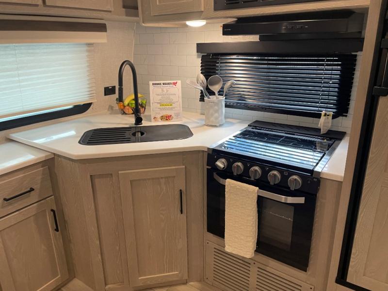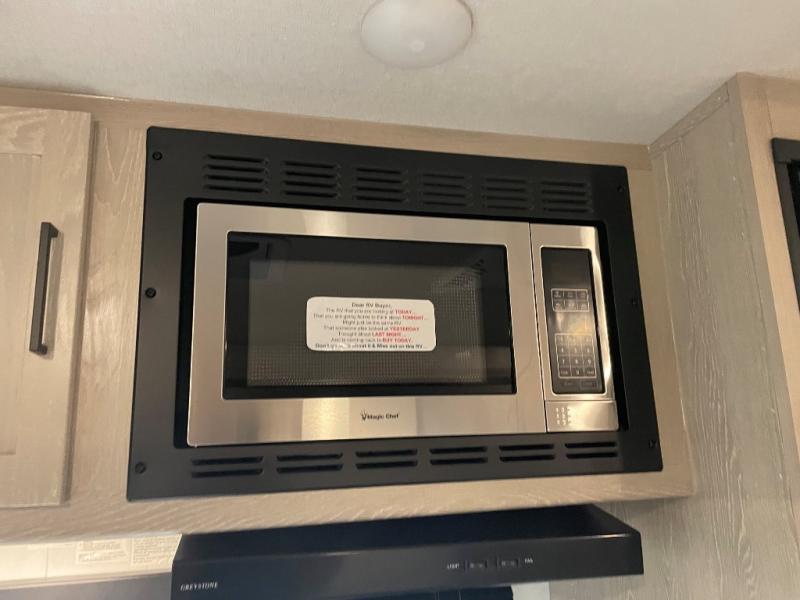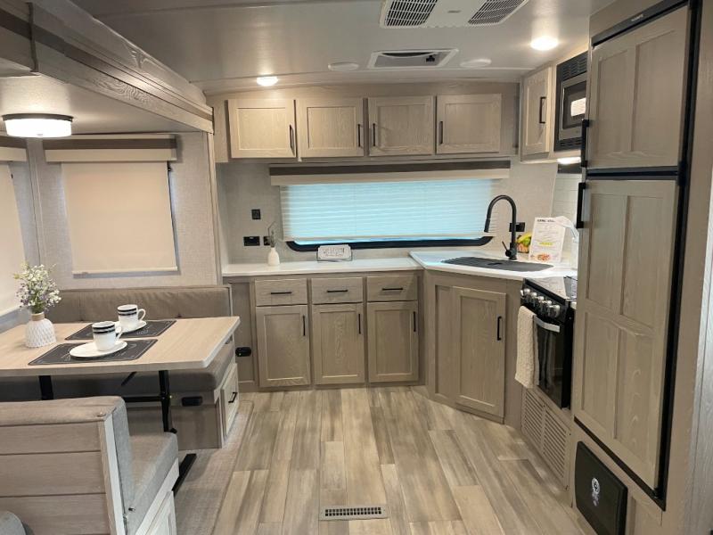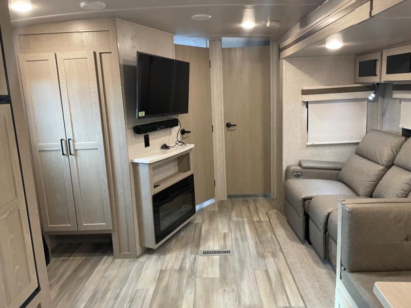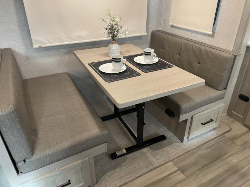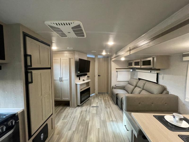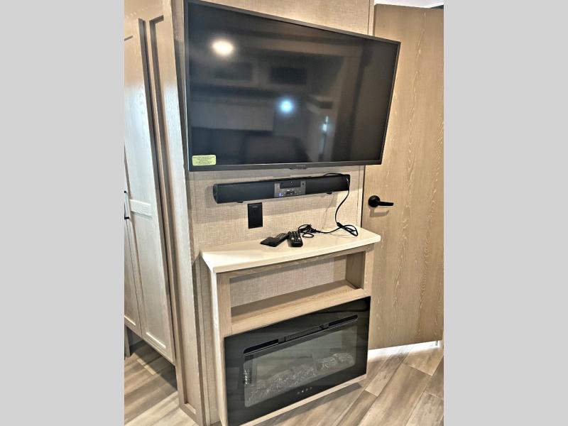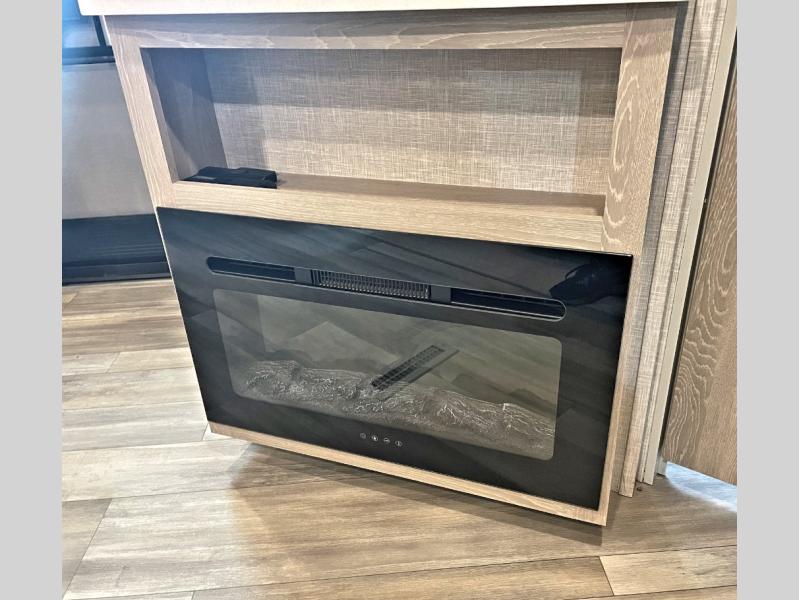 When you are outside this trailer you can enjoy the protection from the 21' power awning, and whip up a meal using the outside griddle. You will find exterior storage for your extra gear, and a ladder on the rear. You get to choose which entrance to step up into, be it the spacious rear bedroom with a queen bed slide and a wardrobe, or the main entry into the kitchen and living area. The furniture slide includes a booth dinette to eat your meals at, and theater seating to watch the LED TV with fireplace below. And the cook will love the front kitchen with extra counter space, and the appliances are nearby to make warm meals, and the pantry is next to the entry allowing you to grab a snack on your way out for a hike.
