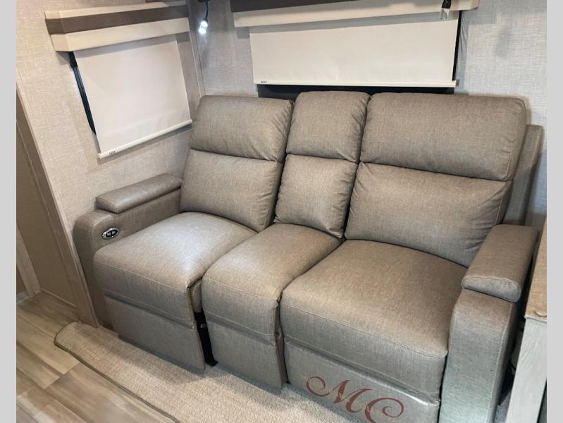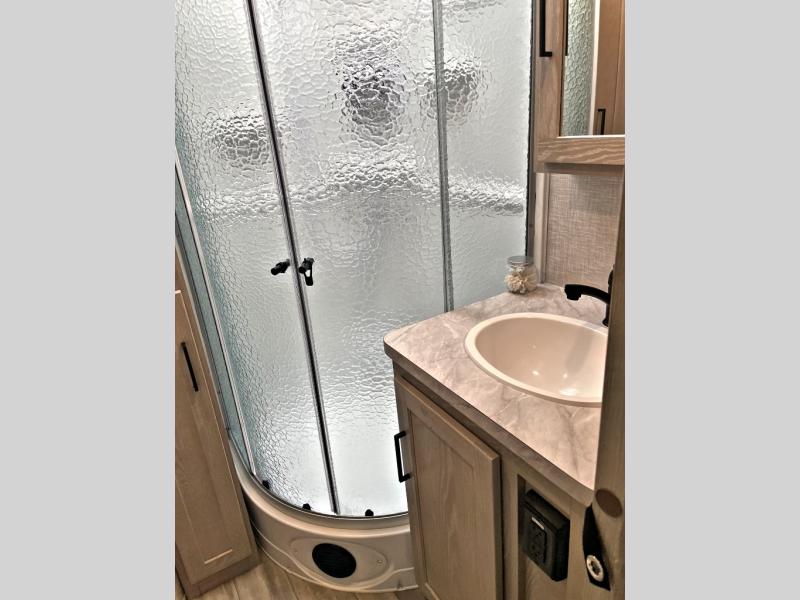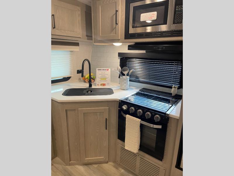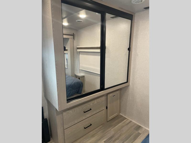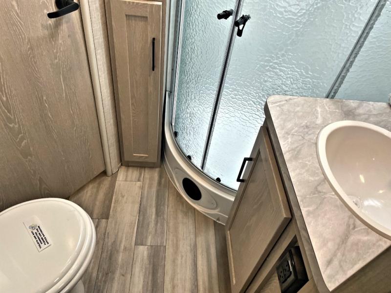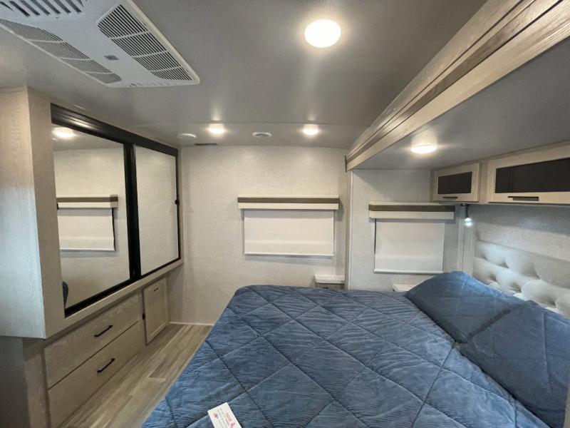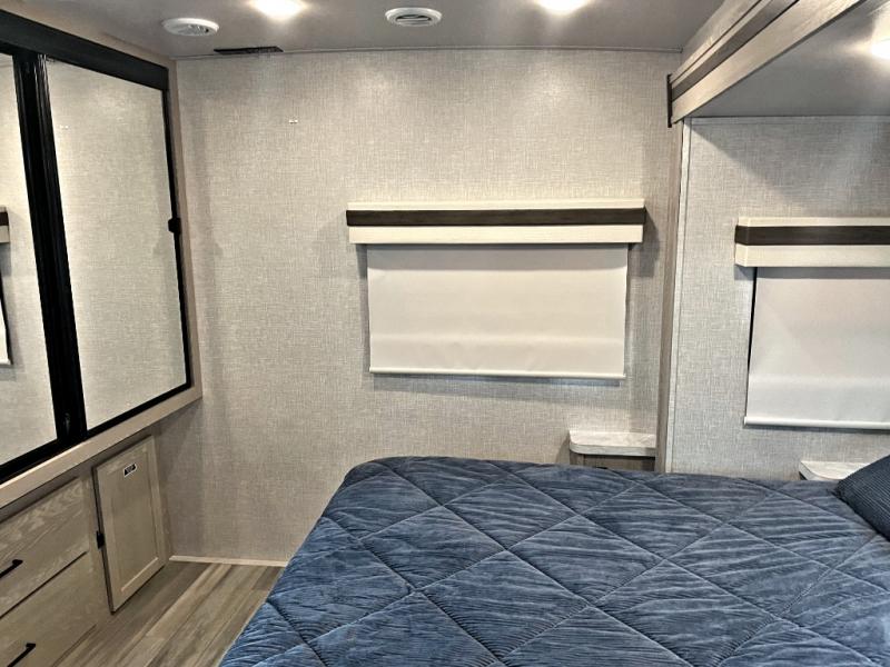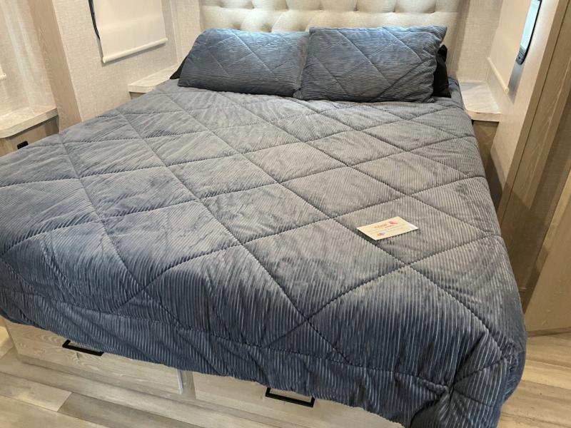When you are outside this trailer you can enjoy the protection from the 21' power awning, and whip up a meal using the outside griddle. You will find exterior storage for your extra gear, and a ladder on the rear. You get to choose which entrance to step up into, be it the spacious rear bedroom with a queen bed slide and a wardrobe, or the main entry into the kitchen and living area. The furniture slide includes a booth dinette to eat your meals at, and theater seating to watch the LED TV with fireplace below. And the cook will love the front kitchen with extra counter space, and the appliances are nearby to make warm meals, and the pantry is next to the entry allowing you to grab a snack on your way out for a hike.