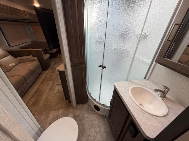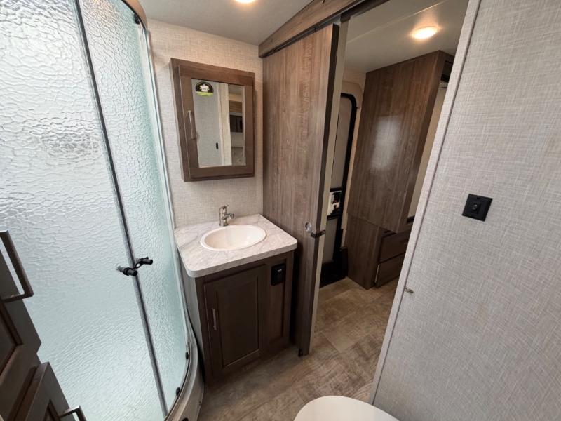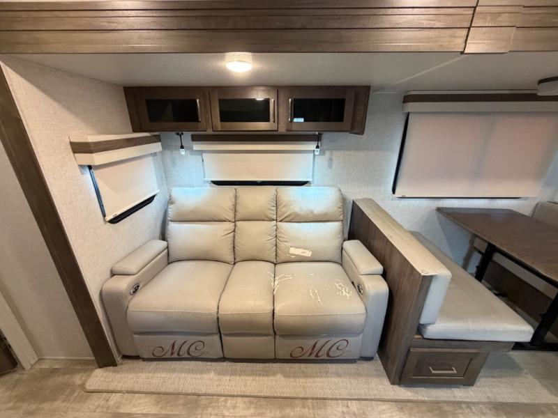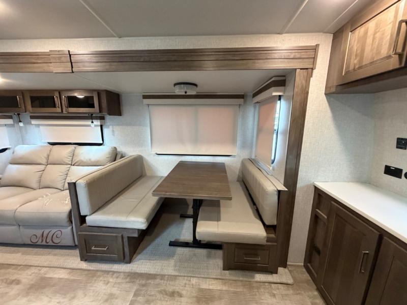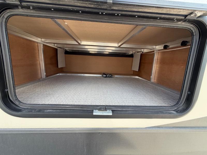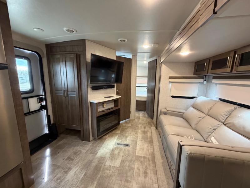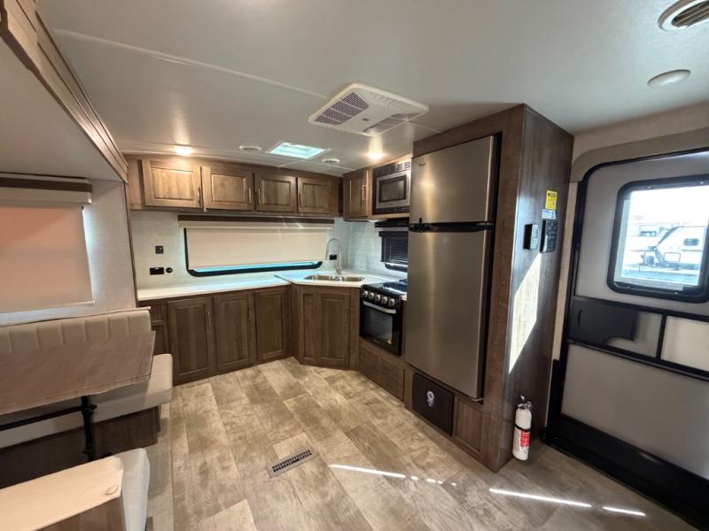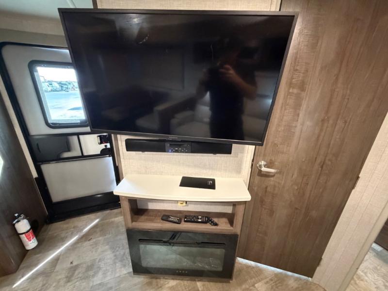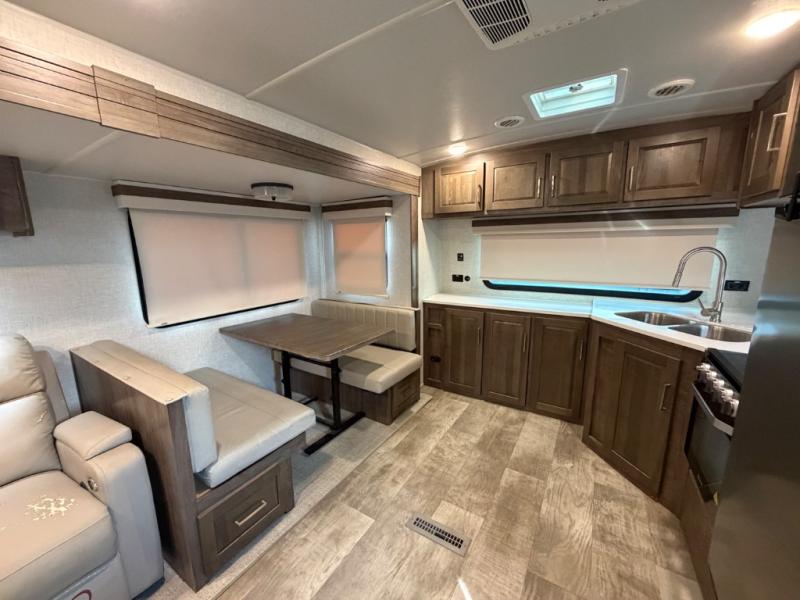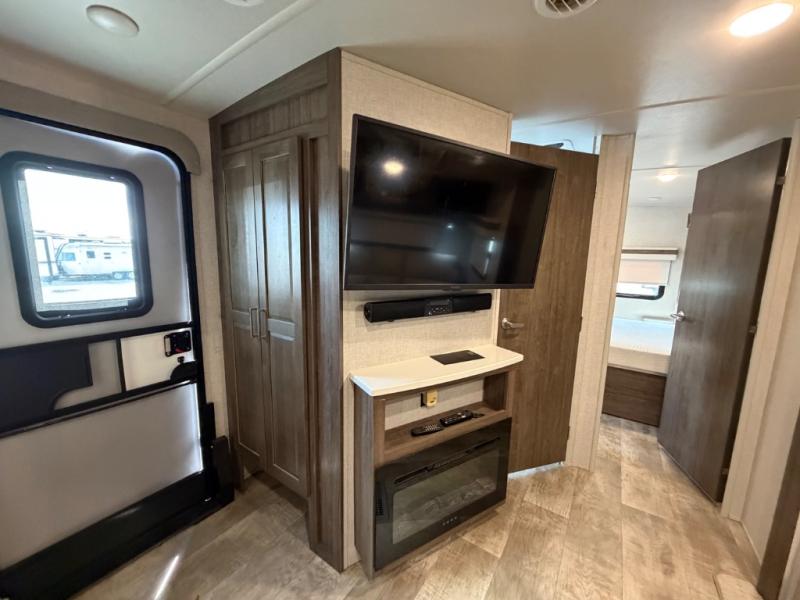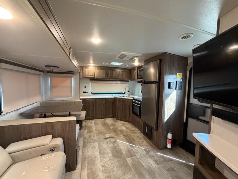 When you are outside this trailer you can enjoy the protection from the 21' power awning, and whip up a meal using the outside griddle. You will find exterior storage for your extra gear, and a ladder on the rear. You get to choose which entrance to step up into, be it the spacious rear bedroom with a queen bed slide and a wardrobe, or the main entry into the kitchen and living area. The furniture slide includes a booth dinette to eat your meals at, and theater seating to watch the LED TV with fireplace below. And the cook will love the front kitchen with extra counter space, and the appliances are nearby to make warm meals, and the pantry is next to the entry allowing you to grab a snack on your way out for a hike.