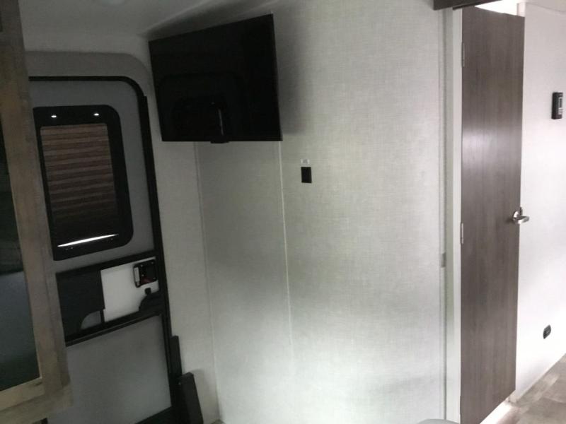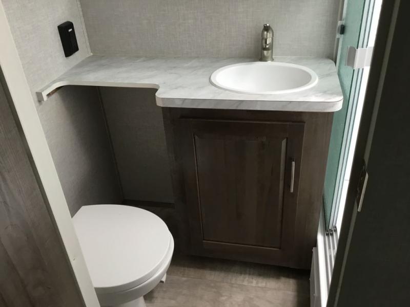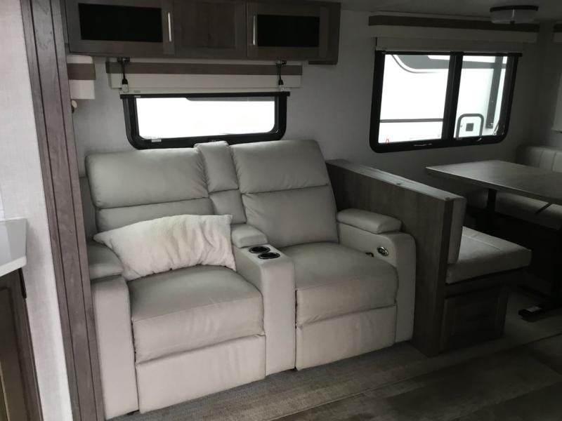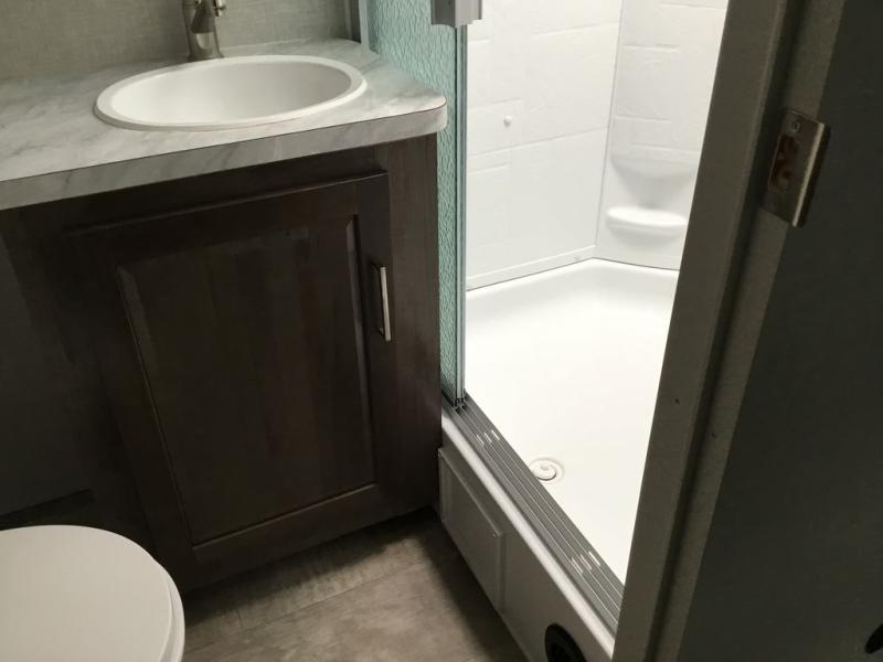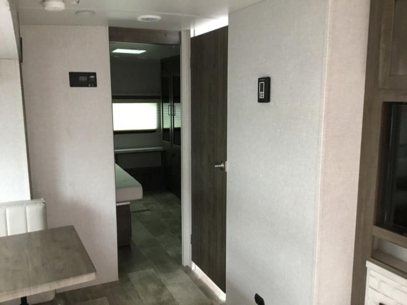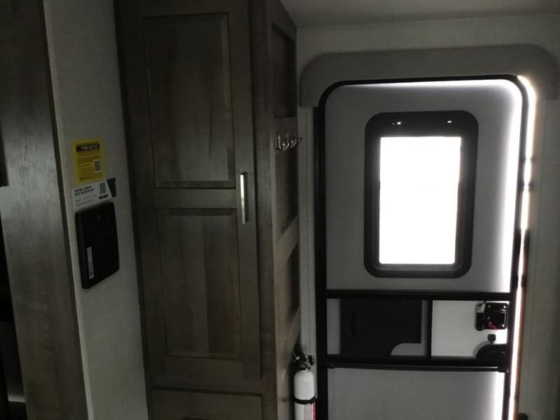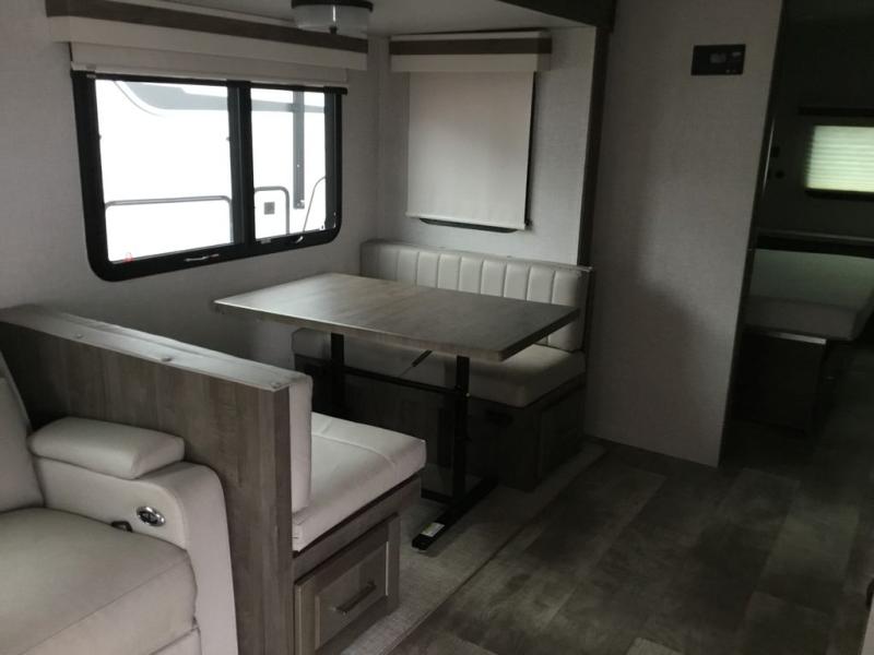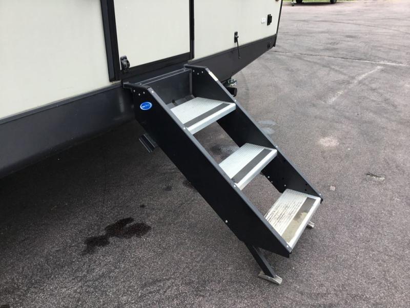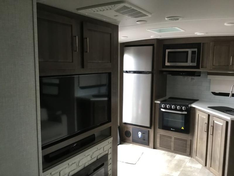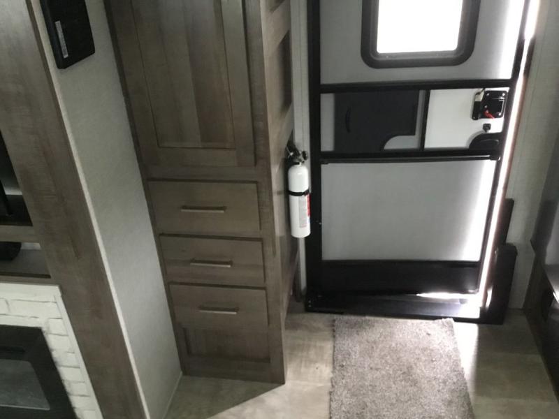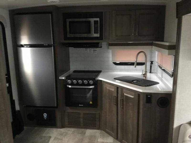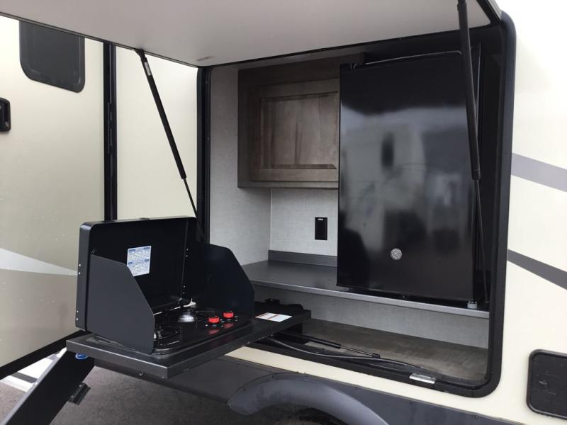 Whether you camp to relax or seek adventure, this trailer will be available for you to be comfortable indoors or outdoors! And you will find there are many convenient features throughout including the dual entry doors, the refrigerator and the pantry being next to the main entry for easy access, and the outside kitchen gives the cook choices when making meals. The interior rear kitchen includes full amenities, the theater seating and booth dinette slide offer seating and sleeping space, and the full bathroom gives you counter space to place your toiletries and such plus a shower to get cleaned up in each night before bedtime. And the front bedroom offers privacy, a queen bed slide, clothing storage and the second entry door.