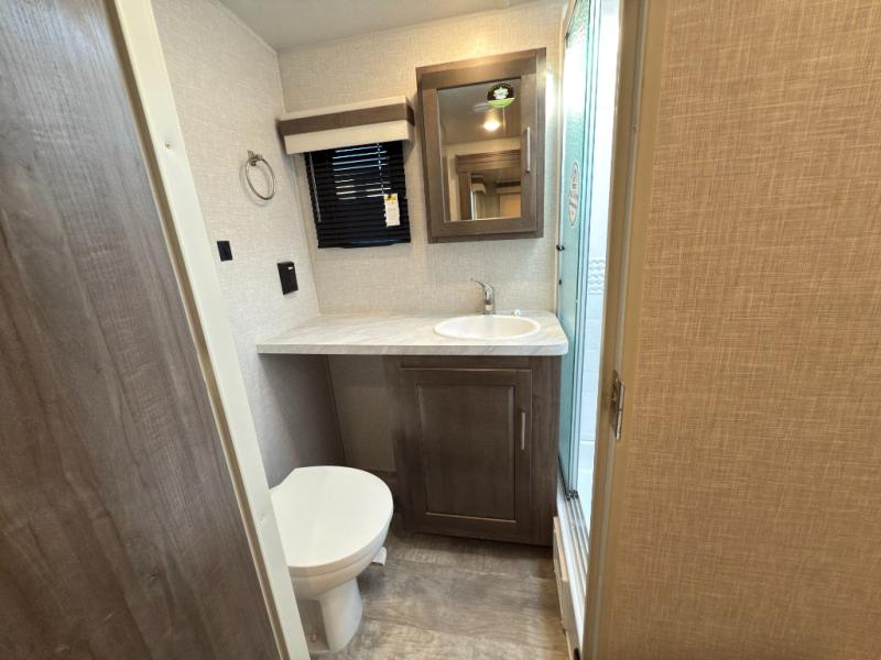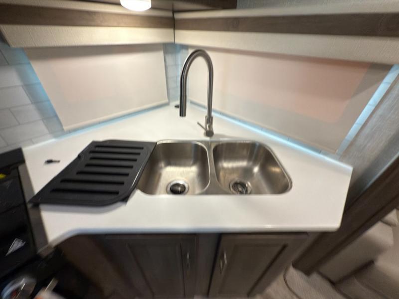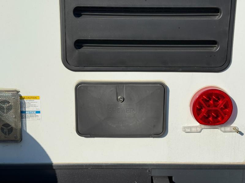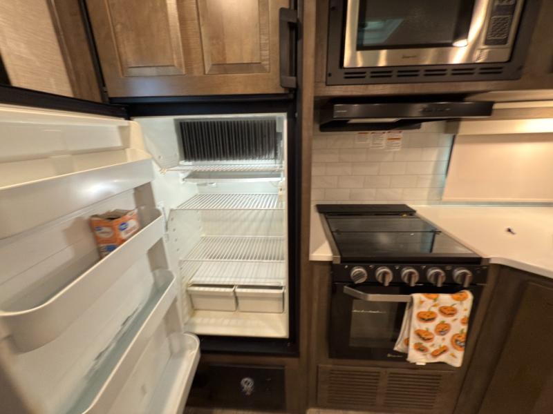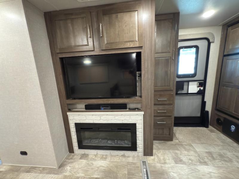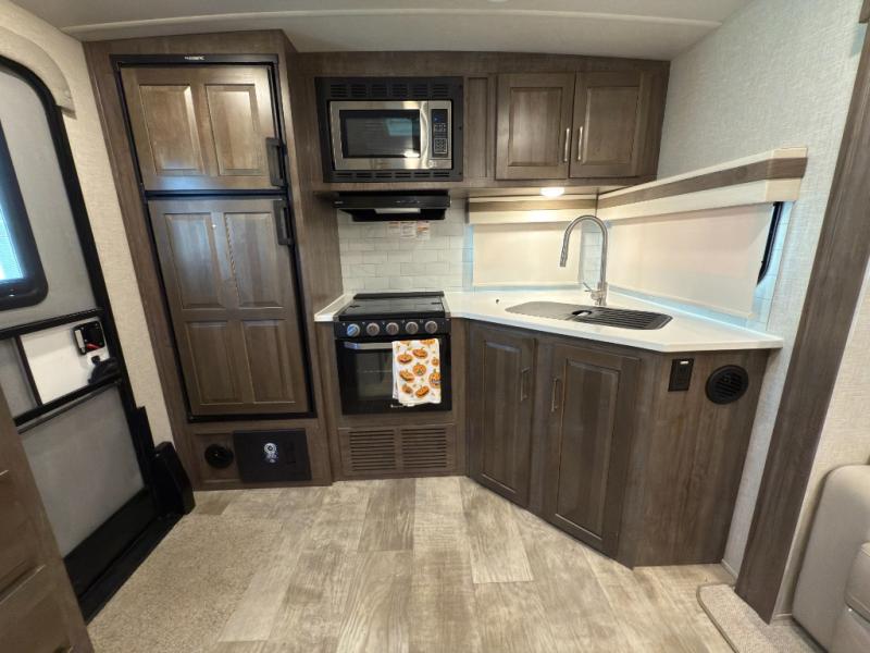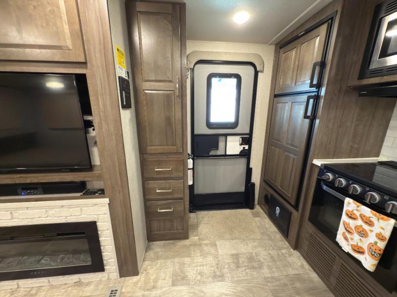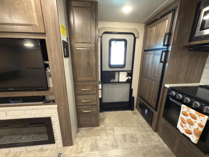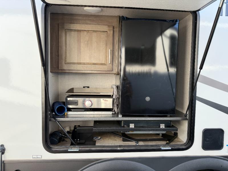 Whether you camp to relax or seek adventure, this trailer will be available for you to be comfortable indoors or outdoors! And you will find there are many convenient features throughout including the dual entry doors, the refrigerator and the pantry being next to the main entry for easy access, and the outside kitchen gives the cook choices when making meals. The interior rear kitchen includes full amenities, the theater seating and booth dinette slide offer seating and sleeping space, and the full bathroom gives you counter space to place your toiletries and such plus a shower to get cleaned up in each night before bedtime. And the front bedroom offers privacy, a queen bed slide, clothing storage and the second entry door.