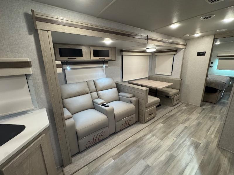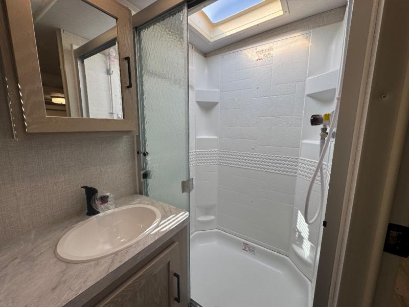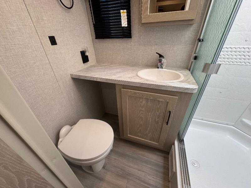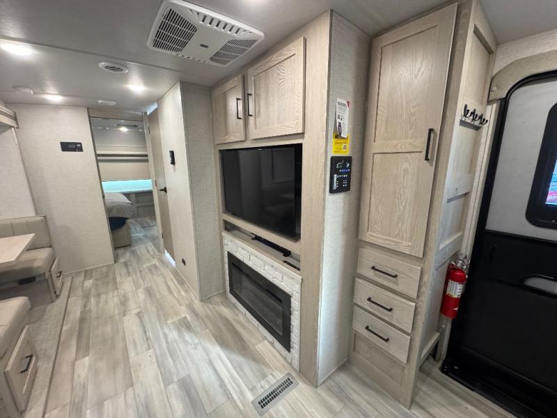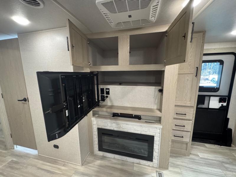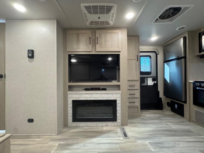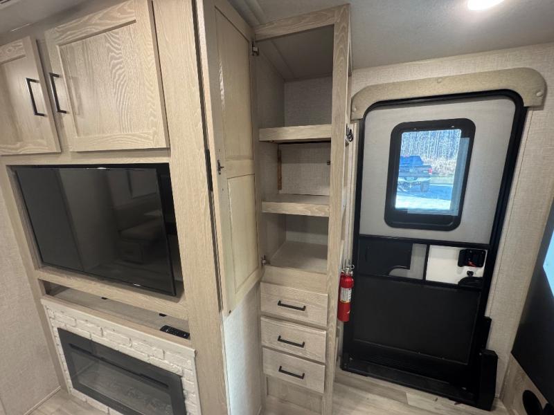 Whether you camp to relax or seek adventure, this trailer will be available for you to be comfortable indoors or outdoors! And you will find there are many convenient features throughout including the dual entry doors, the refrigerator and the pantry being next to the main entry for easy access, and the outside kitchen gives the cook choices when making meals. The interior rear kitchen includes full amenities, the theater seating and booth dinette slide offer seating and sleeping space, and the full bathroom gives you counter space to place your toiletries and such plus a shower to get cleaned up in each night before bedtime. And the front bedroom offers privacy, a queen bed slide, clothing storage and the second entry door.
