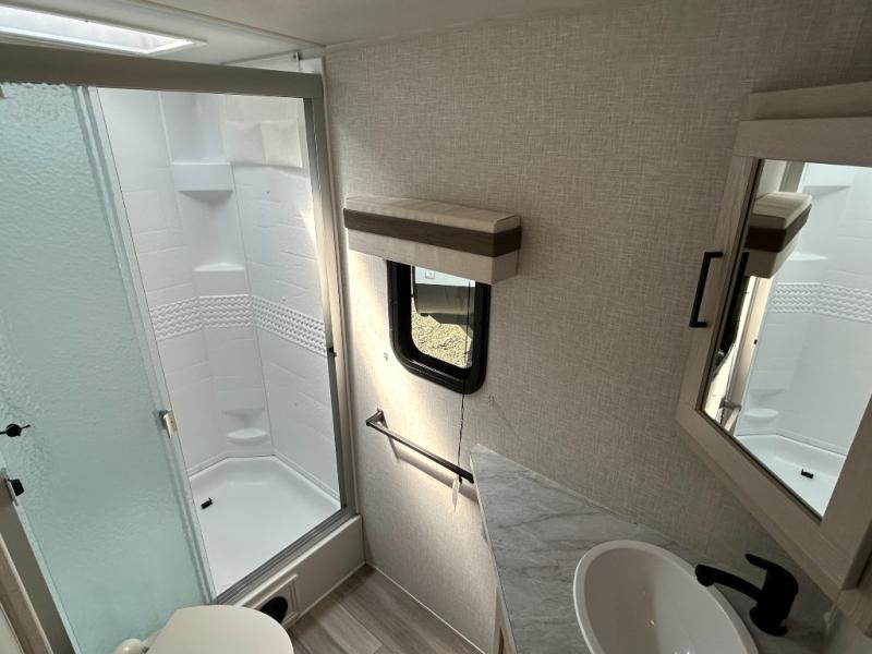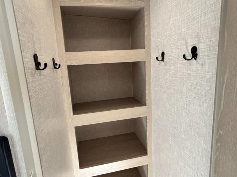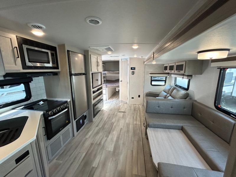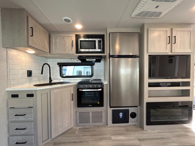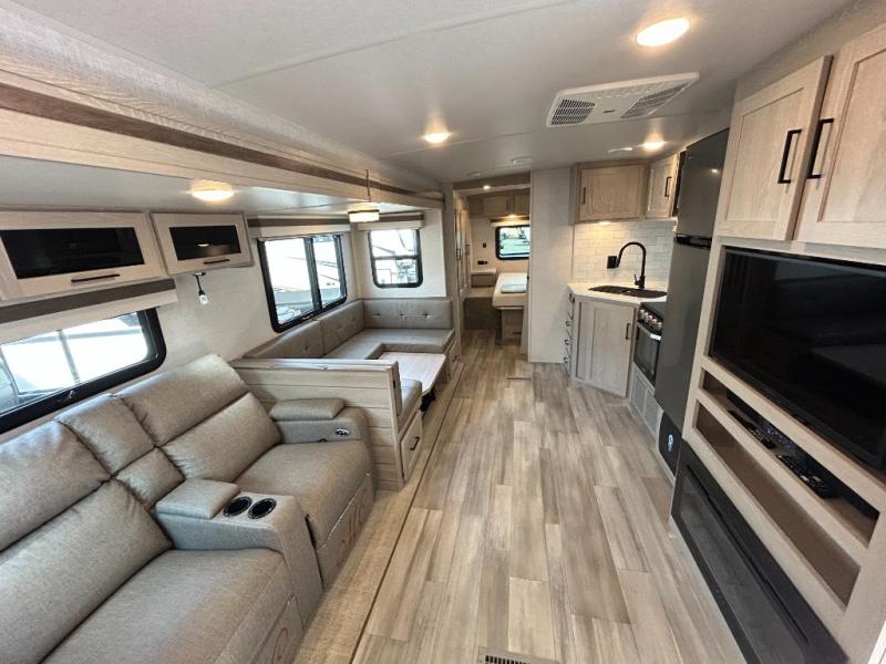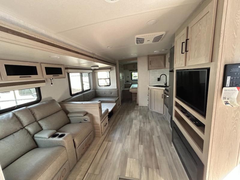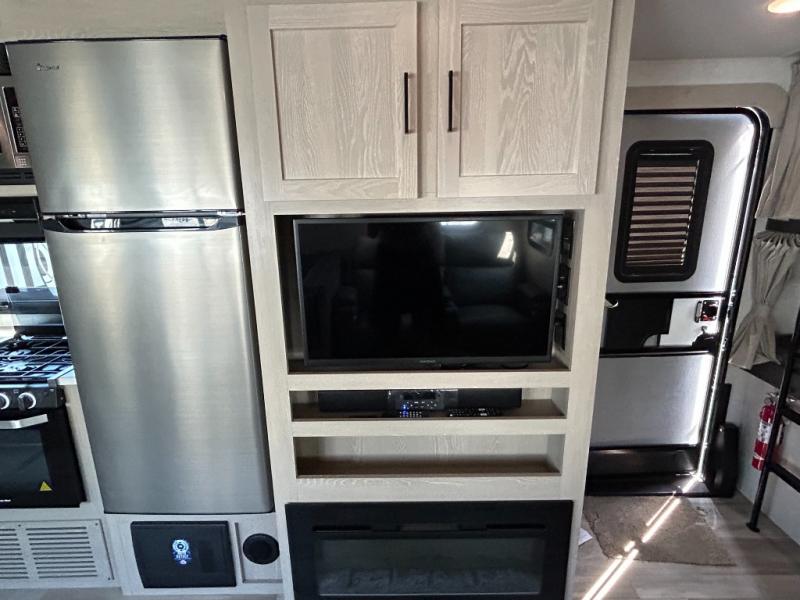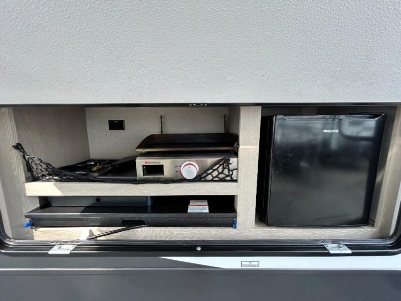 Looking for a trailer that sleeps eight, allows you to cook indoors or outdoors, and offers dual entry for convenience when you travel with a bigger group? This trailer provides for those wants and needs, and offers even more! The outside camp kitchen gives you more choices when feeding the masses along with the outside griddle, and the interior kitchen includes an L-shaped area for the cook to have their own space with full amenities including a counter extension and a walk-in pantry to bring along everything they need. The full bathroom will keep everyone refreshed, and the theater seating along with the U-shaped dinette offer seating inside to enjoy the LED TV and fireplace. There is plenty of storage found throughout the interior, and along the exterior you will find several places to stow your outdoor items including in the drop frame storage.