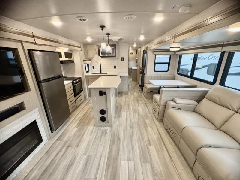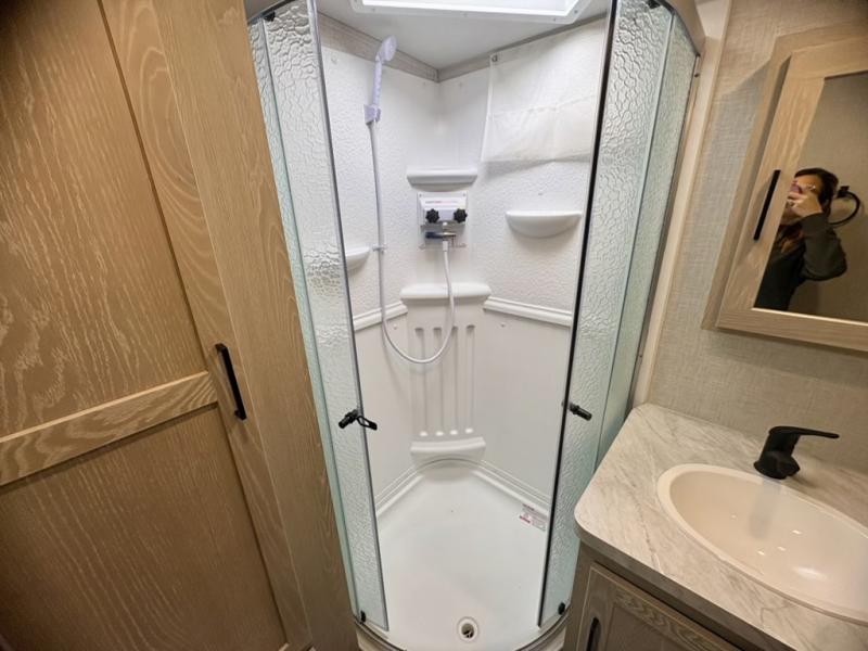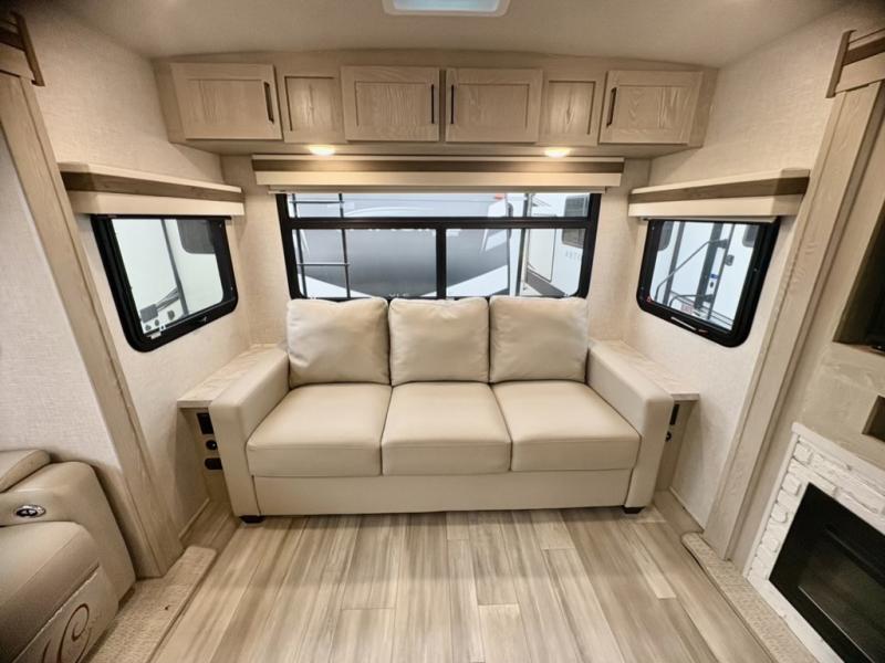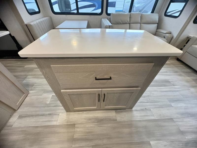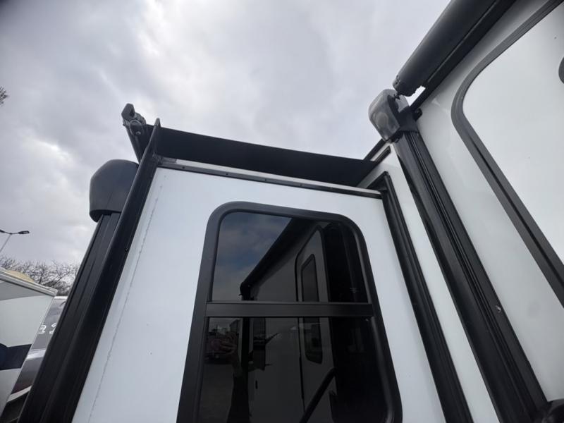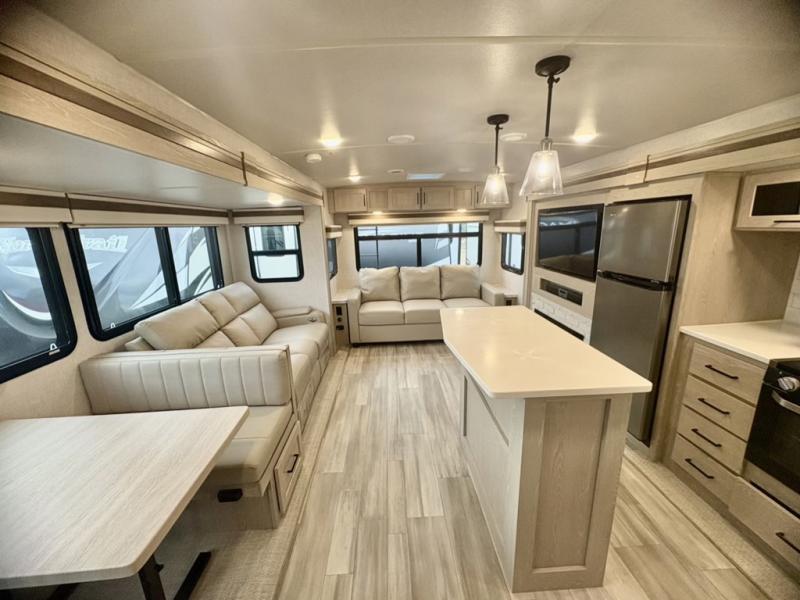 This trailer allows you to seat nine people, and the kitchen island provides a great place to place for the snacks and beverages. The dual opposing slides give the main living and kitchen area lots of floor space for everyone to move around, and the double entry bath is convenient with access from the hallway and the master suite. The front bedroom offers a queen bed slide, a wardrobe and storage along the front wall, plus you can choose to add a TV option. And the two 11' power awnings give you an outdoor living area protected from the elements, just add your camping chairs.