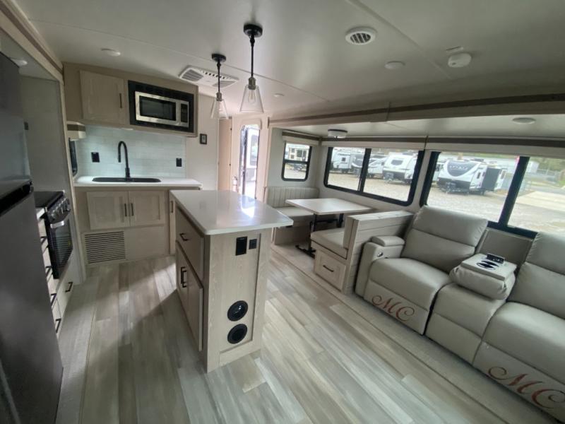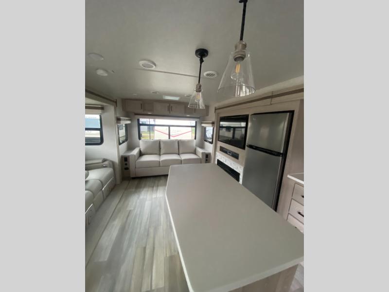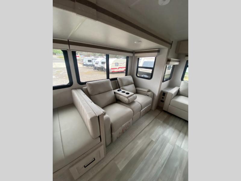 This trailer allows you to seat nine people, and the kitchen island provides a great place to place for the snacks and beverages. The dual opposing slides give the main living and kitchen area lots of floor space for everyone to move around, and the double entry bath is convenient with access from the hallway and the master suite. The front bedroom offers a queen bed slide, a wardrobe and storage along the front wall, plus you can choose to add a TV option. And the two 11' power awnings give you an outdoor living area protected from the elements, just add your camping chairs.