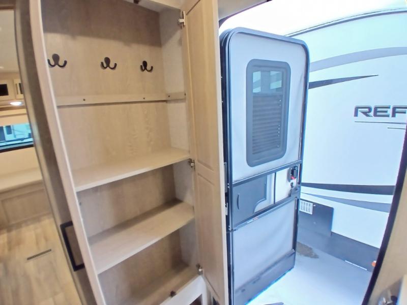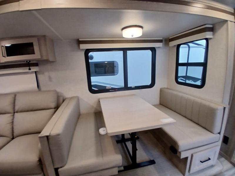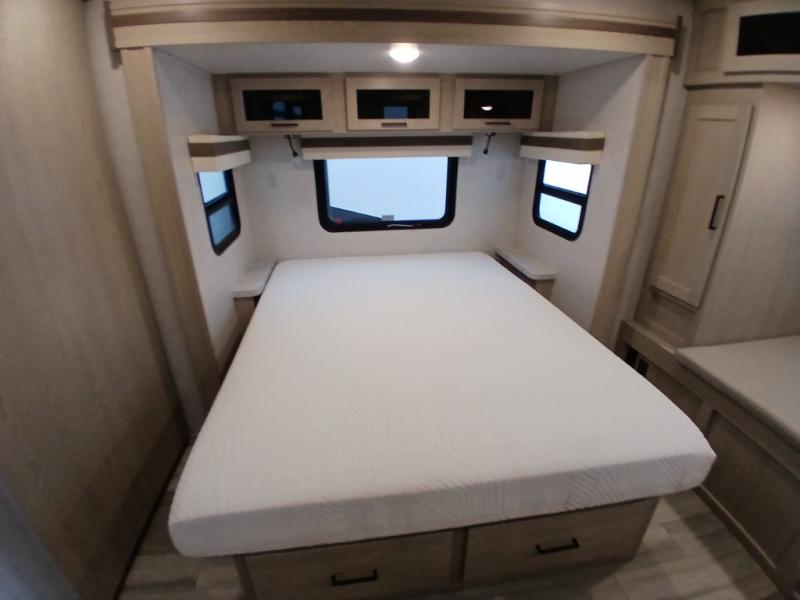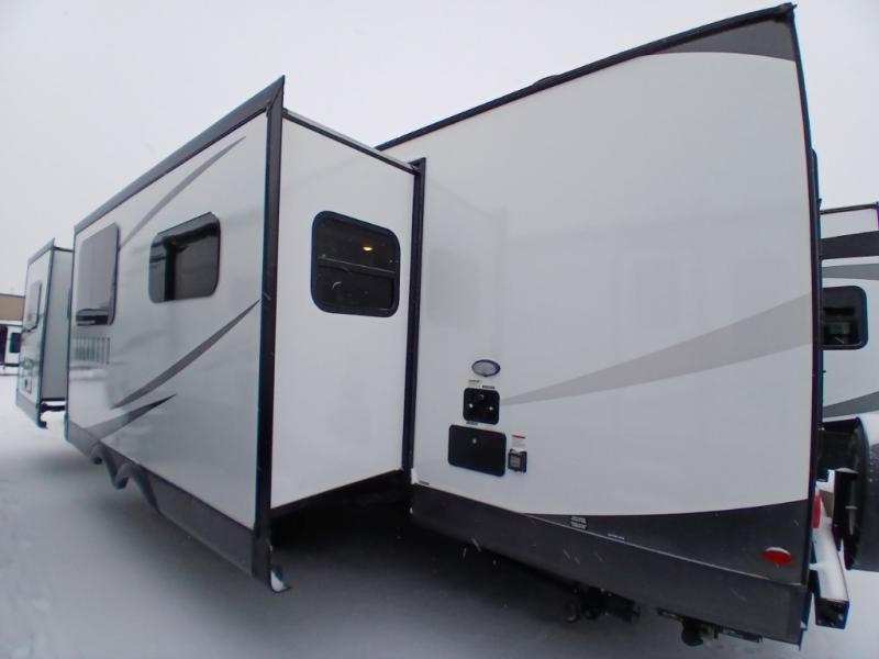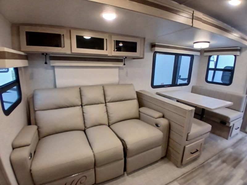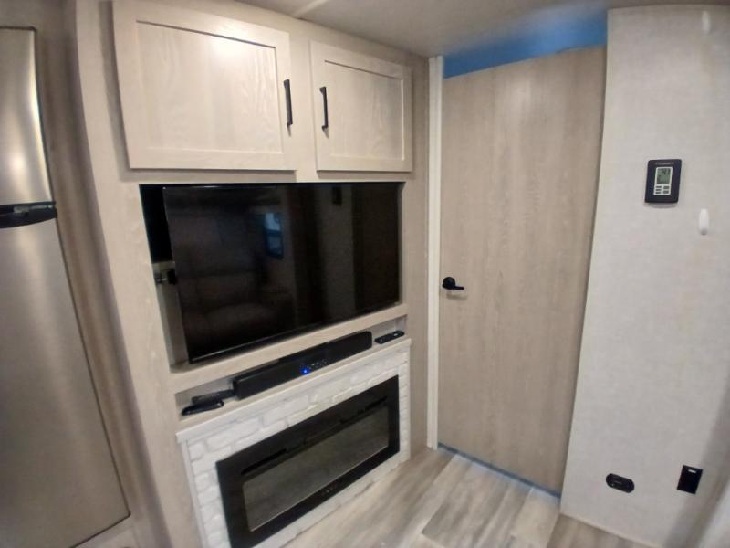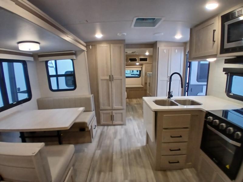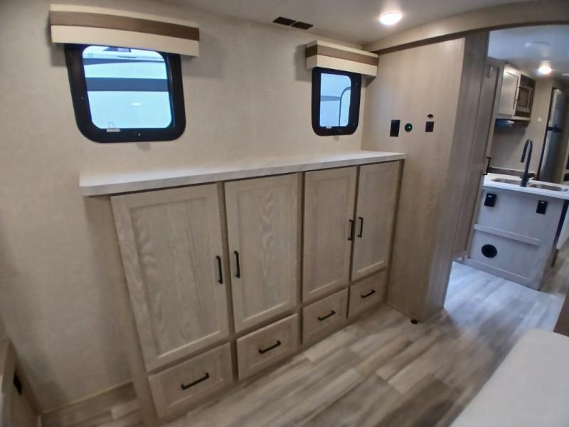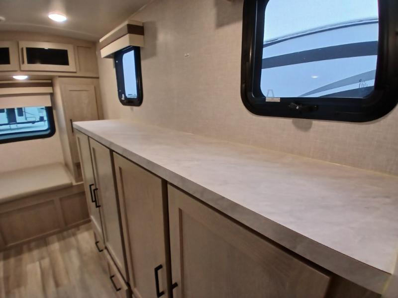 Looking for a trailer that you might like to take extended trips in? This trailer offers a spacious rear full bathroom with a closet as well as a large walk-in-closet that you can add a washer/dryer option. The main living and kitchen area includes a slide out with theater seating and 44" booth dinette that you can enjoy sitting on while watching the LED TV with a fireplace below. The cook will have a choice to make meals using the interior kitchen with full amenities including a counter extension for more prep space, and a large pantry and entry closet for storage, or the outside kitchen and griddle. The front master bedroom offers unique window seating that allows you to sit while putting on your shoes or relax while reading a book. And the 21' power awning includes LED lighting so you can enjoy the outdoors either during the day or night with some protection from the elements.