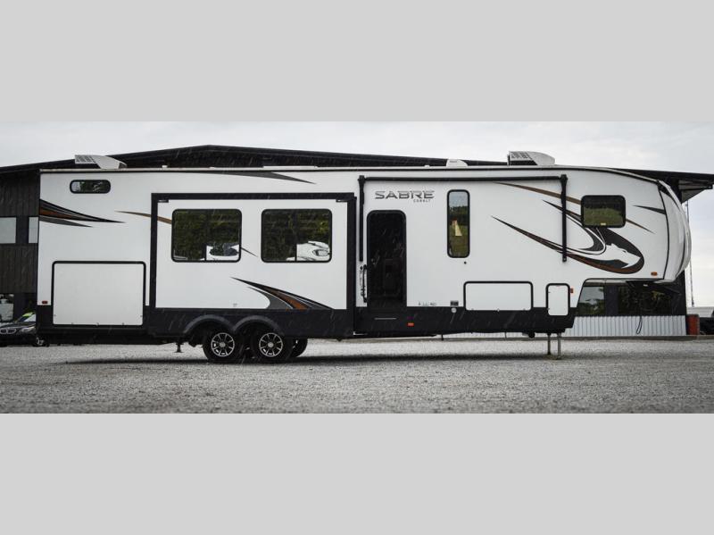 You will experience luxurious camping trips at an affordable price with any one of these Forest River Sabre fifth wheels! These models are durable and ready to travel anytime of the year thanks to features like the high-gloss gel-coat front cap with LED lighting, the PVC roof membrane, and the forced air underbelly with enclosed gate valves. The electric auto-leveling system makes setting up easy and safe, and the adjustable power awning with LED lighting will create an inviting outdoor living space. Each model includes a universal docking station which includes a black tank flush and an outside shower, and the backlit "Secure Step" landing for you to enter and exit the unit safely. Inside, you will love the design of the ambient accent lighting above the crown molding in the living area, the real wood lumbercore cabinetry, and the vintage gaslight decorative lighting!