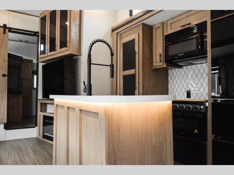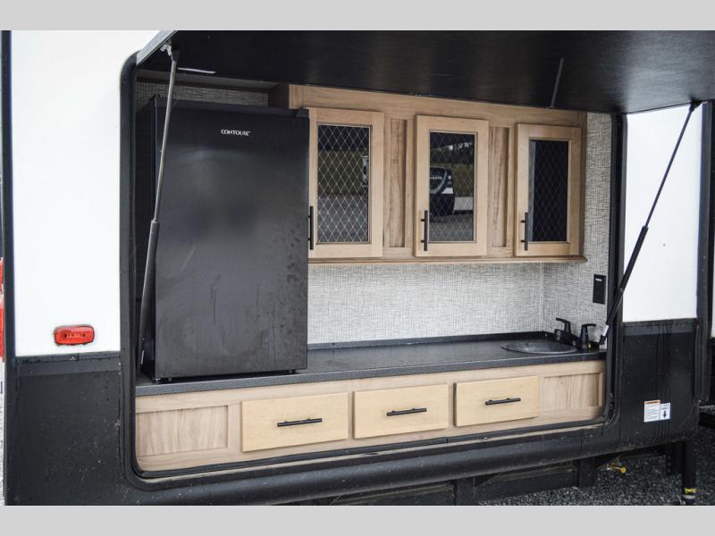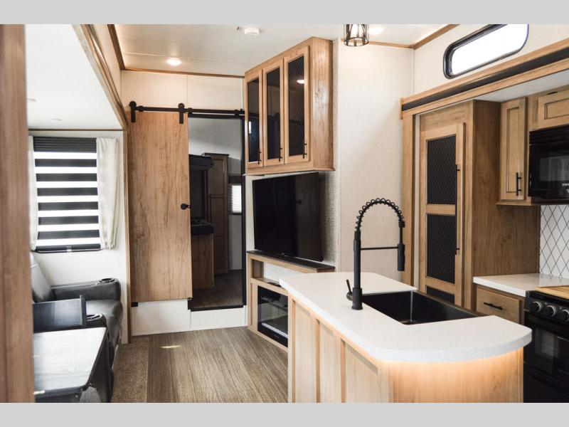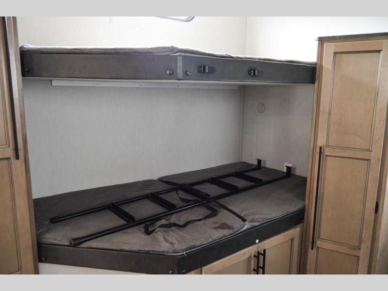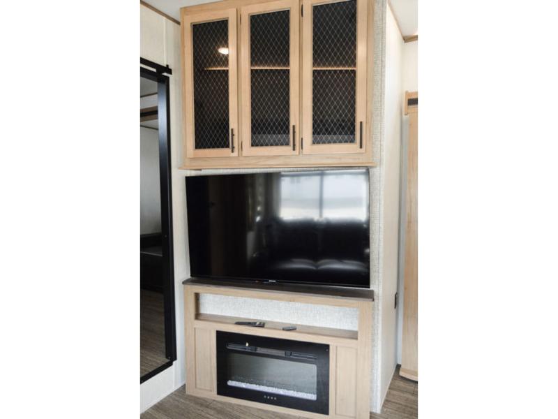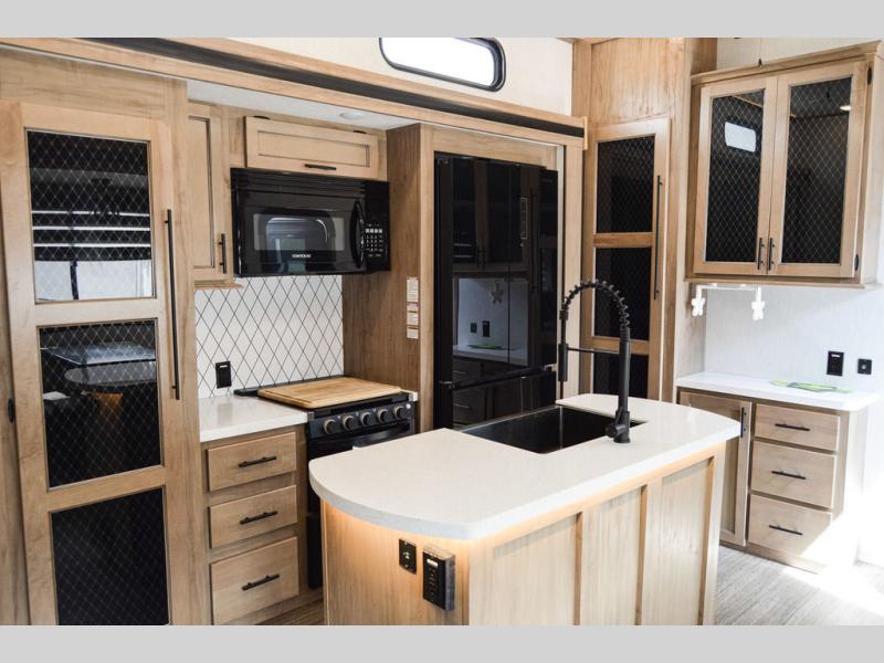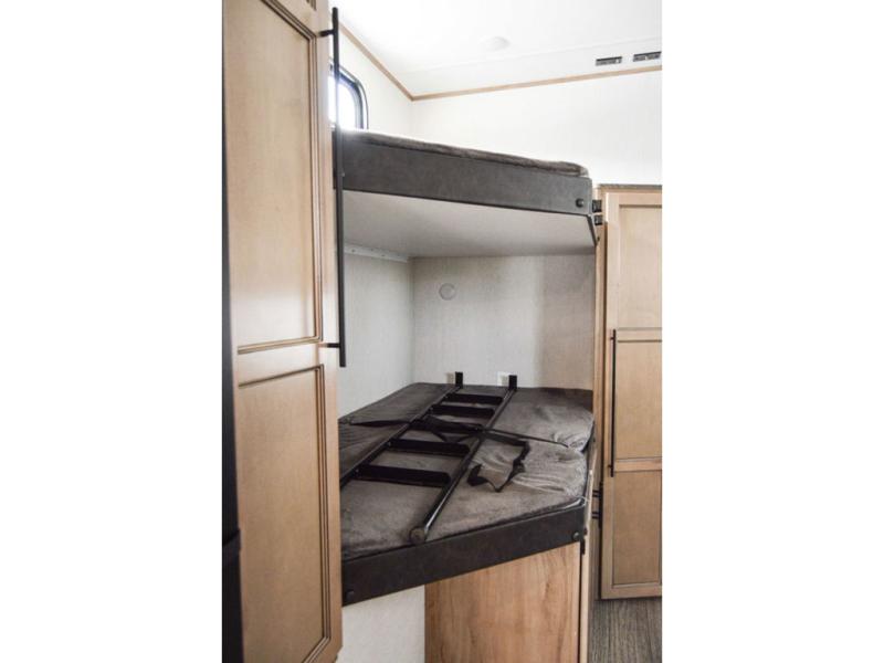One look at this fifth wheel and you'll be ready to take it home! The rear private bunkhouse includes bunk beds, a tri-fold sofa, a half bath, plus basement storage below for luggage, coolers, or yard games. You'll enjoy your own space up front in the private bedroom that includes a king bed slide out, a shelf for a CPAP machine, plus a front wardrobe with washer and dryer prep if you choose to go full-time. The main living and kitchen area will be a favorite place to meet together since there is a Smart TV, a fireplace, and theater seating as well. The chef will love the extra counter space provided by the kitchen island, and there is a ceiling fan here to cool them off when they're cooking.