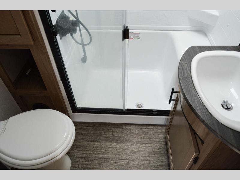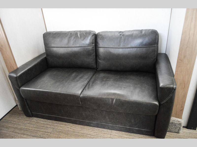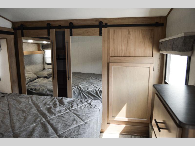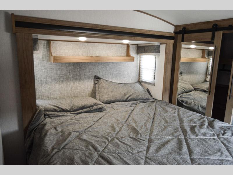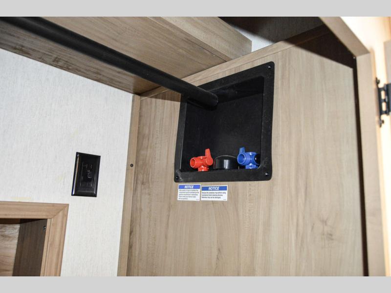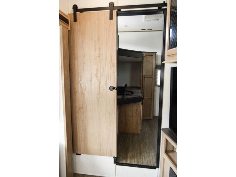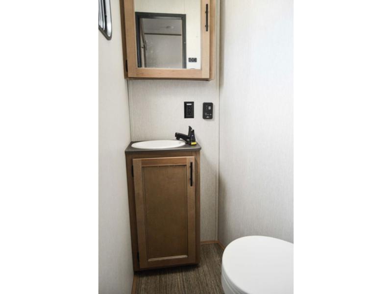 One look at this fifth wheel and you'll be ready to take it home! The rear private bunkhouse includes bunk beds, a tri-fold sofa, a half bath, plus basement storage below for luggage, coolers, or yard games. You'll enjoy your own space up front in the private bedroom that includes a king bed slide out, a shelf for a CPAP machine, plus a front wardrobe with washer and dryer prep if you choose to go full-time. The main living and kitchen area will be a favorite place to meet together since there is a Smart TV, a fireplace, and theater seating as well. The chef will love the extra counter space provided by the kitchen island, and there is a ceiling fan here to cool them off when they're cooking.