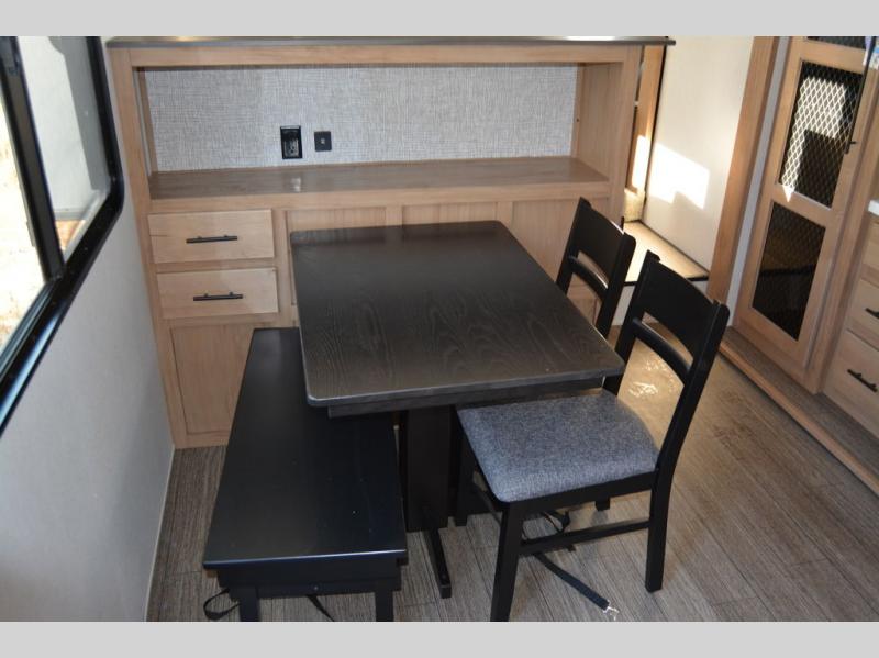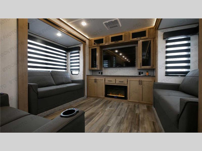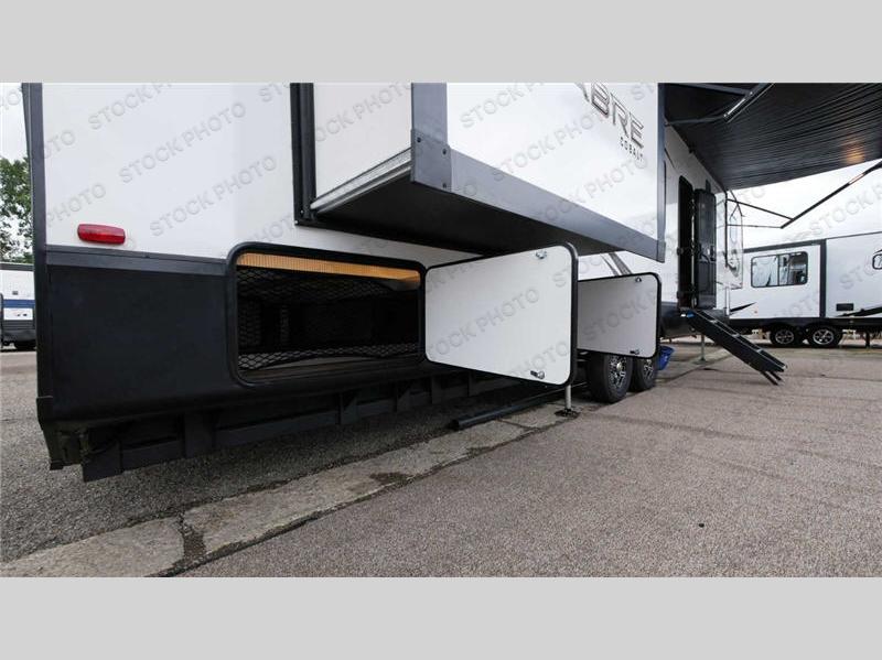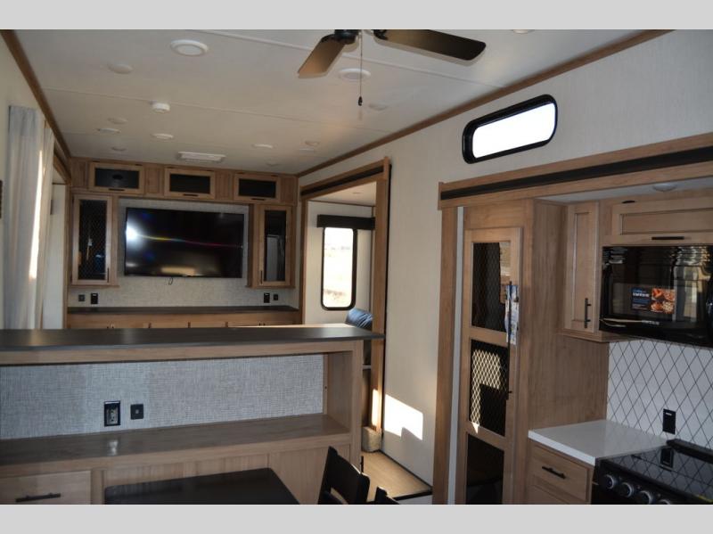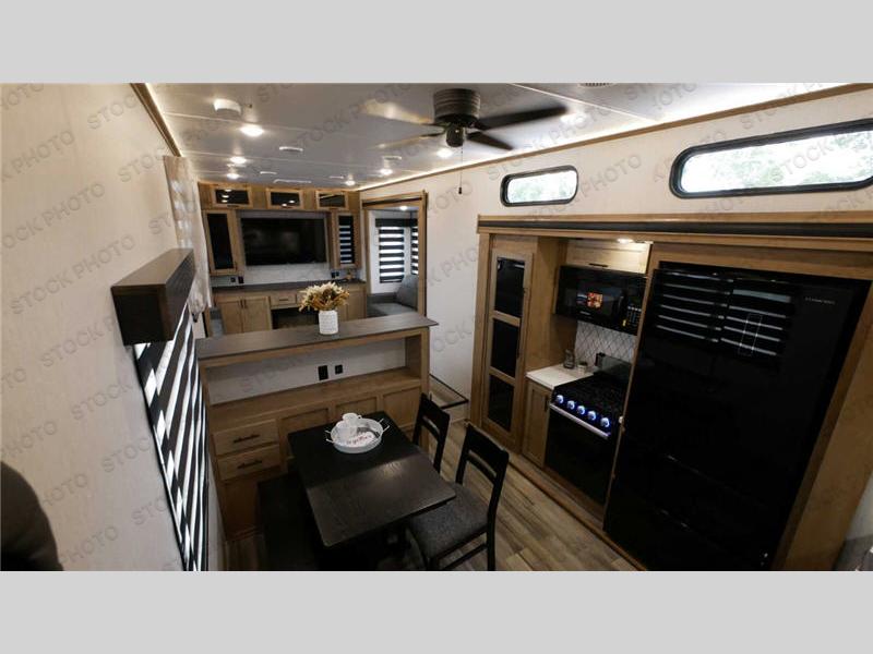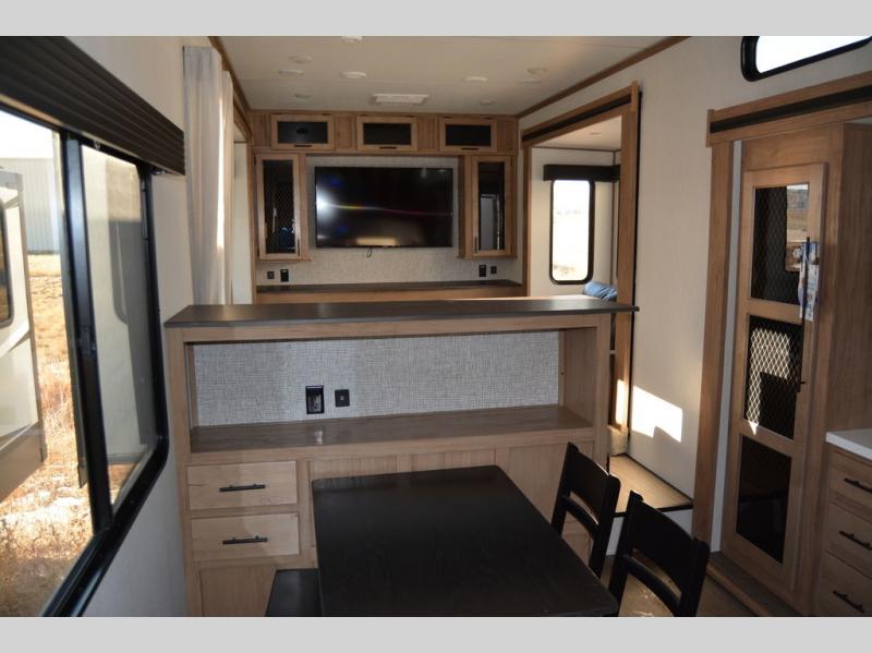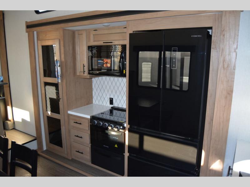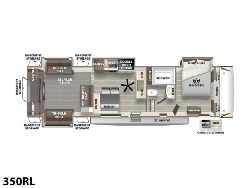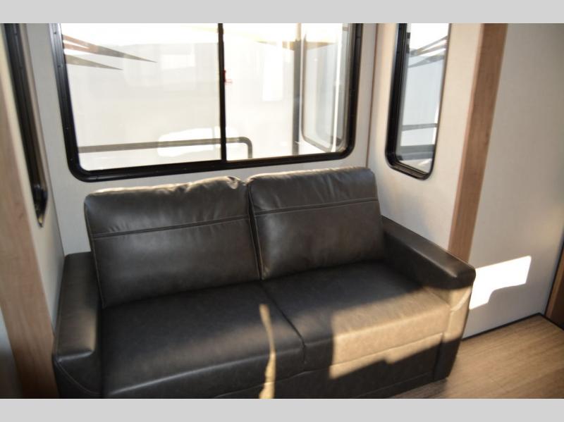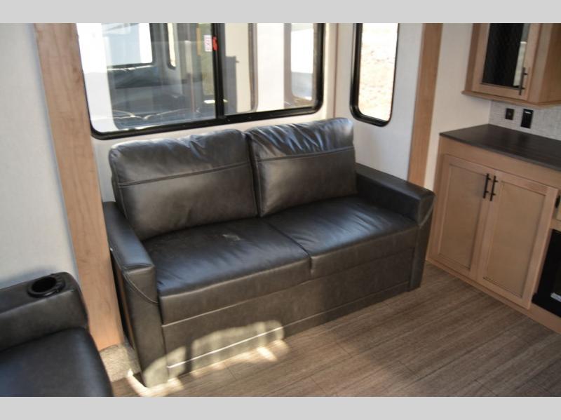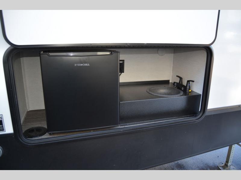 Pack your bags and head across the country in this cozy fifth wheel for six. The rear living area includes two tri-fold sofas, a Smart TV, 55" theater seating for two, plus two cabinets, making this space a second bedroom at night for guests. In the morning, you can prepare breakfast on the three burner range, then dine together at the free-standing table with bench seating and two chairs. There is plenty of storage space here, including a pantry, a hutch, and overhead cabinets. The full bath will allow you to stay clean throughout your trip, and you'll feel right at home in the front private bedroom with a king bed. This model also includes an outside kitchen with a sink and a refrigerator for snacks, plus basement storage in front and back as well as a massive pass-thru storage below the living area for all your gear!