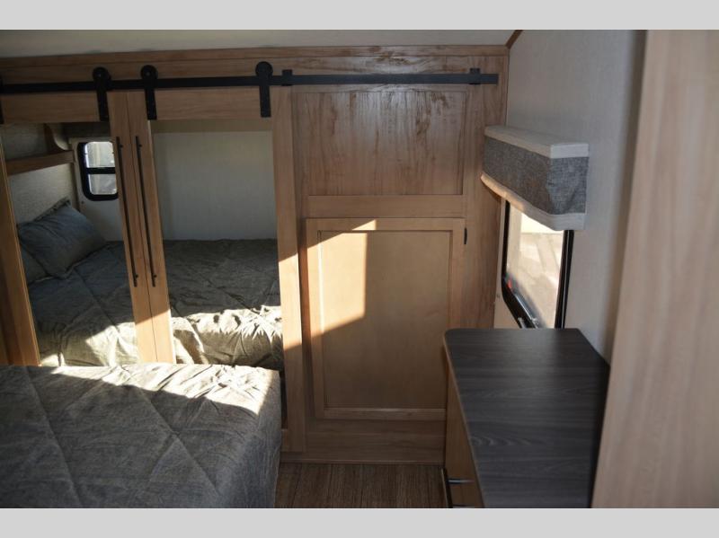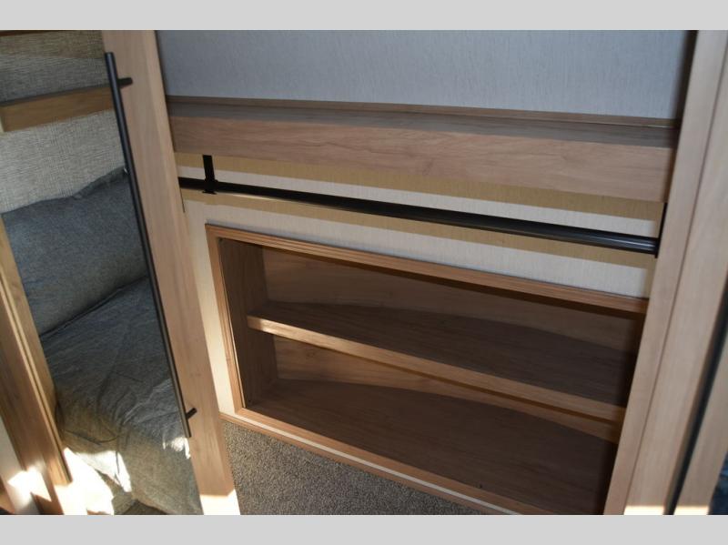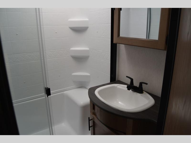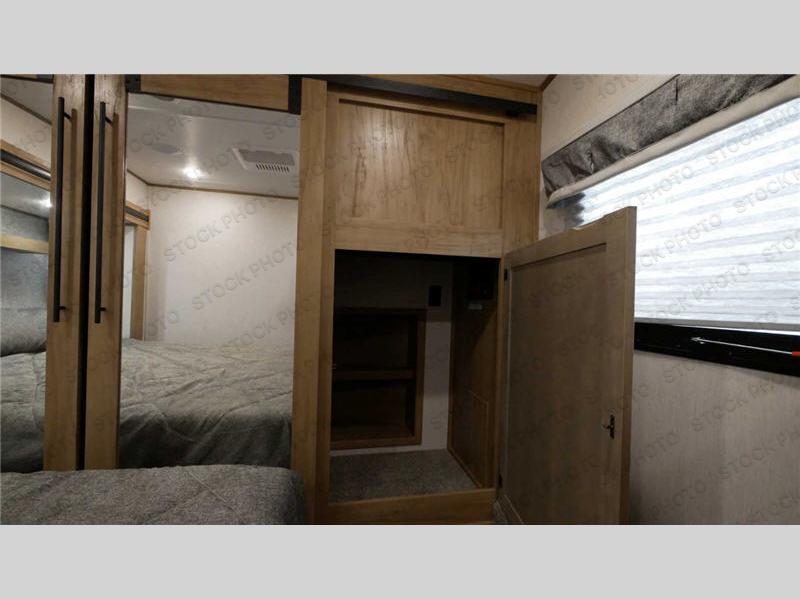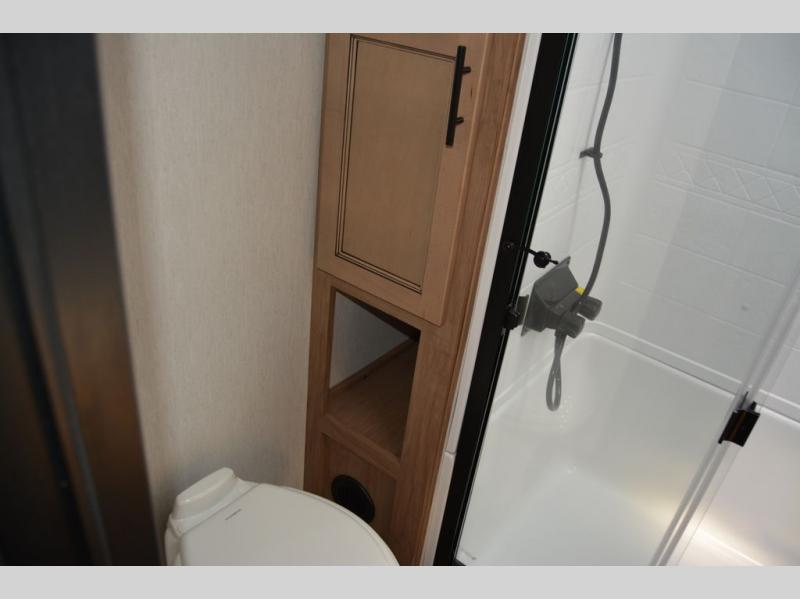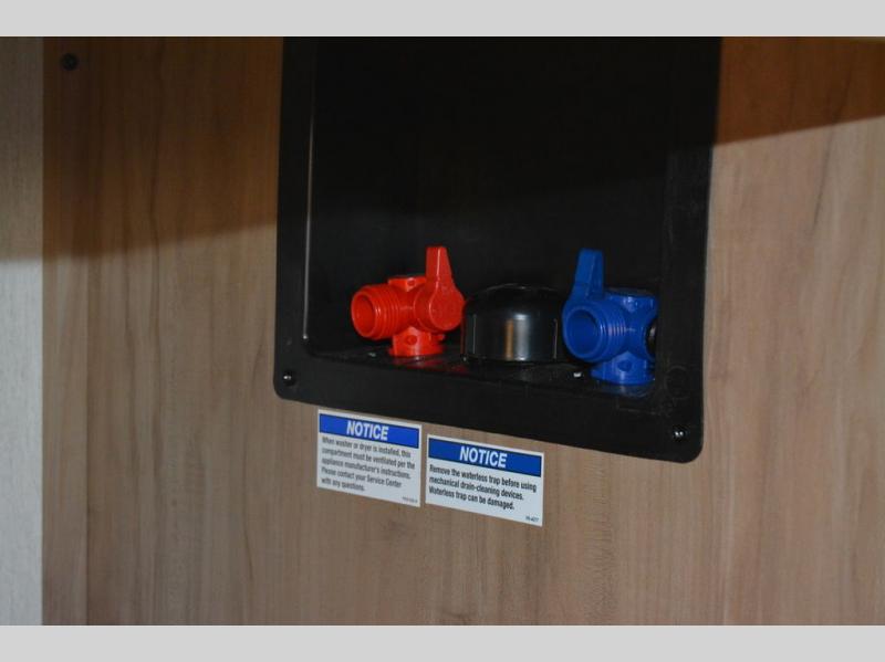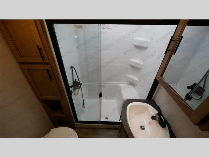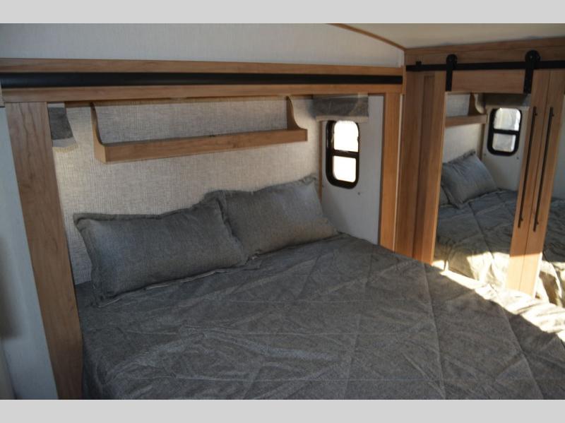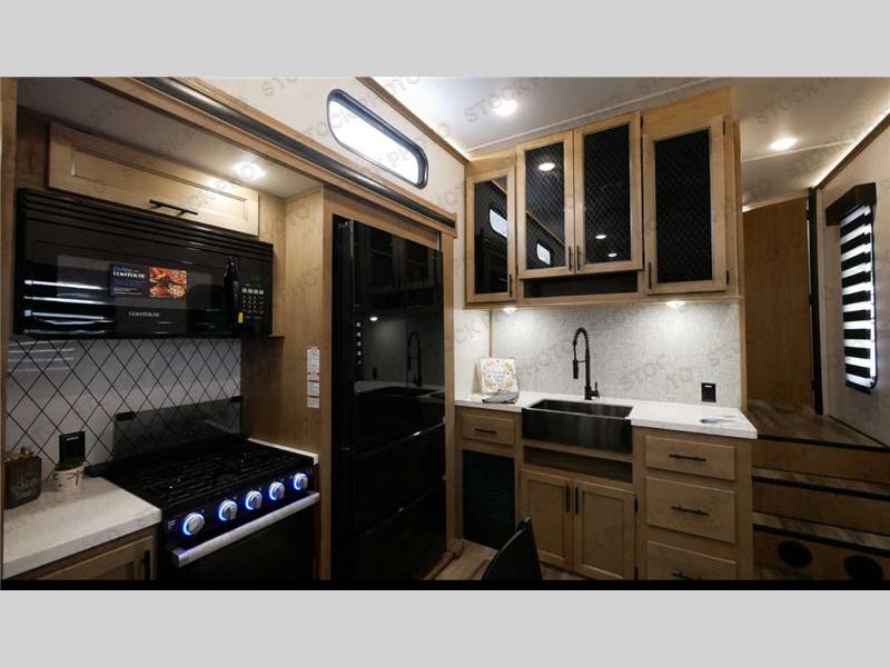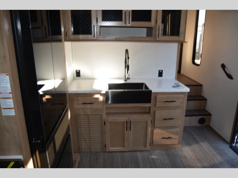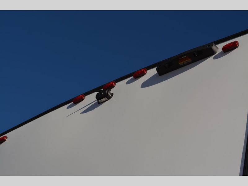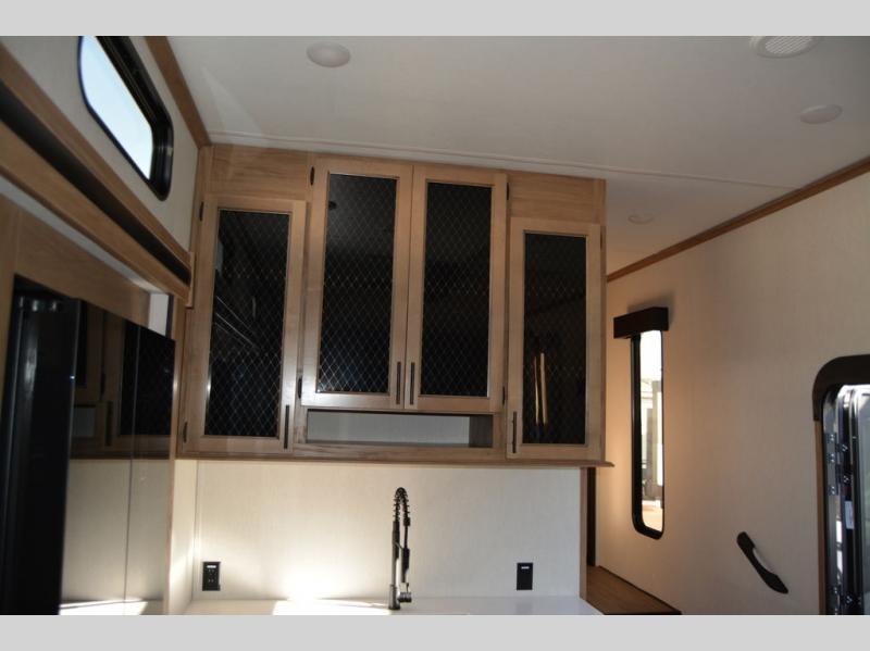 Pack your bags and head across the country in this cozy fifth wheel for six. The rear living area includes two tri-fold sofas, a Smart TV, 55" theater seating for two, plus two cabinets, making this space a second bedroom at night for guests. In the morning, you can prepare breakfast on the three burner range, then dine together at the free-standing table with bench seating and two chairs. There is plenty of storage space here, including a pantry, a hutch, and overhead cabinets. The full bath will allow you to stay clean throughout your trip, and you'll feel right at home in the front private bedroom with a king bed. This model also includes an outside kitchen with a sink and a refrigerator for snacks, plus basement storage in front and back as well as a massive pass-thru storage below the living area for all your gear!