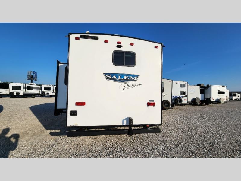 Set your sights on this Salem Platinum Edition travel trailer that can comfortably sleep four people which makes it the perfect unit for a small family. After you've set up camp and had a look around the campground, come back to this unit to enjoy lunch or take a quick rest. The chef of the family can cook on the three-burner cooktop or make something quick in the microwave, and the 8' chaise lounge will be a perfect spot to relax or play a game of cards. You'll appreciate the full rear bath that includes a walk-in shower and a closet for extra towels. This unit also features a front private bedroom with a custom king bed that you are sure to love, and you'll find plenty of storage space throughout, including an exterior pass-through compartment for the fishing poles.