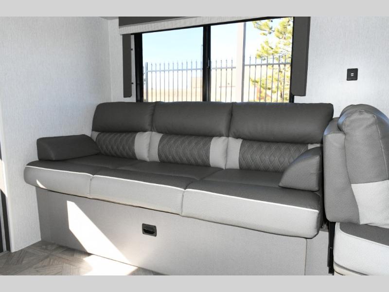 Kick back and relax in the cozy rear living space featuring dual lounge chairs, a booth dinette, and large panoramic windows that let in plenty of natural light.