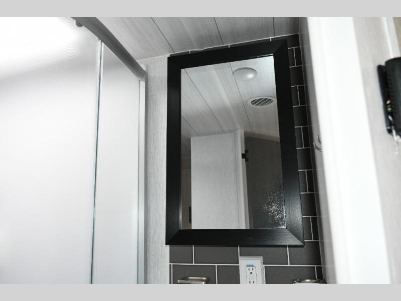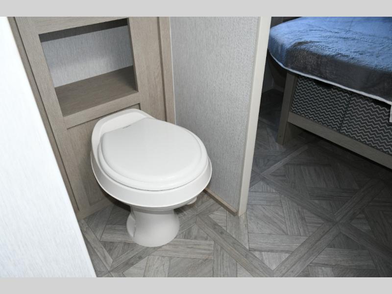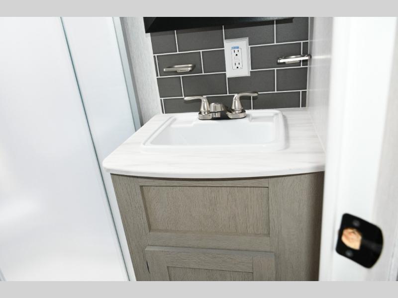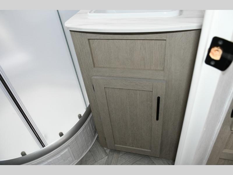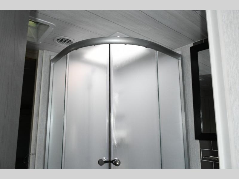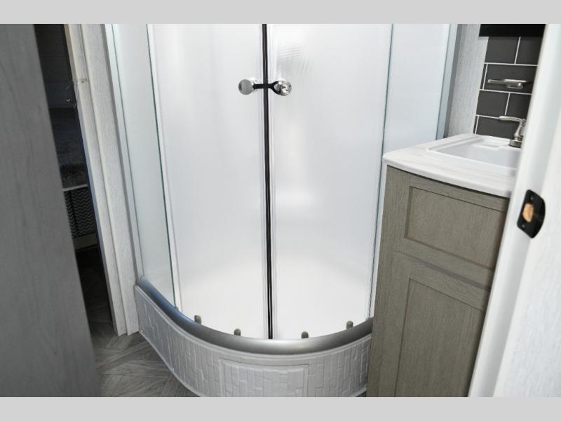 The walk-through bathroom provides extra space and functionality, featuring a glass radius shower, toilet, and sink — everything you need to feel refreshed and comfortable on the go.