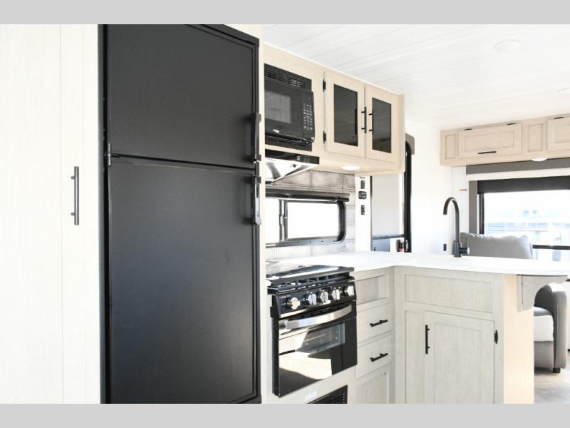Cooking up camp favorites is a breeze in the fully equipped kitchen with high-definition countertops, extra-large overhead cabinets, and a double door refrigerator for all your ingredients. There’s also a Bluetooth stereo with remote control so you can listen to your favorite tunes while you cook or dine.