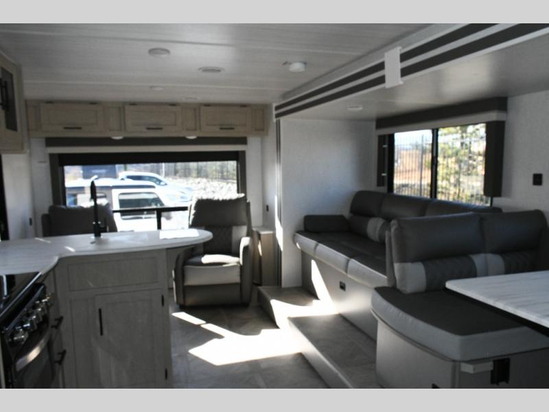 Kick back and relax in the cozy rear living space featuring dual lounge chairs, a booth dinette, and large panoramic windows that let in plenty of natural light. The dinette is perfect for meals, games, or even sleeping space for guests, while the open layout ensures you have room to stretch out after a day of exploring.