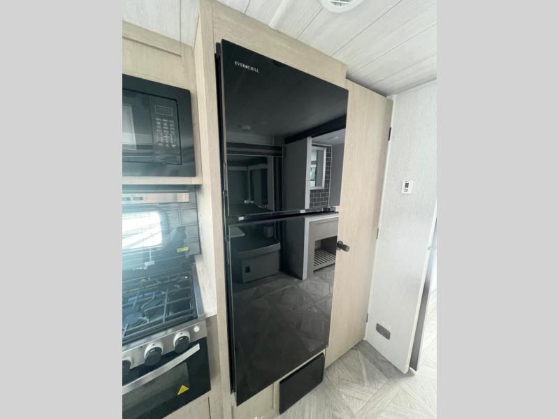 You will enjoy sleeping for up to six with a custom king bed in the private front bedroom, plus a versa-lounge and a u-shaped dinette within the large slide out. There are also panoramic windows here to let tons of natural light in. Cooking will be easy either indoors or outdoors with an exterior camp kitchen situated under the 20' awning, and the two pantries and an oversized fridge inside will hold all of your food. You will feel right at home in the front private bedroom that includes a custom king bed, dual nightstands and closets, plus a walk-in closet to keep your clothes wrinkle-free. And check out the pass-through storage outside to keep fishing poles, hiking gear, and extra lawn chairs!
