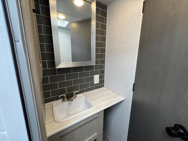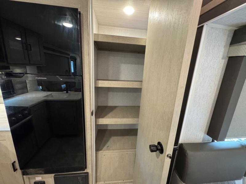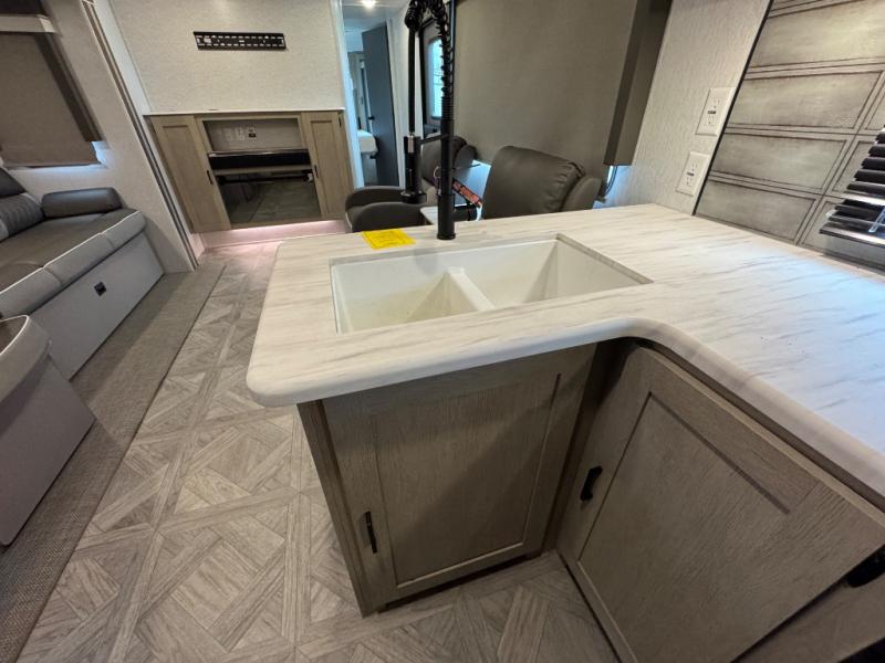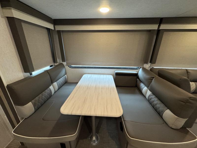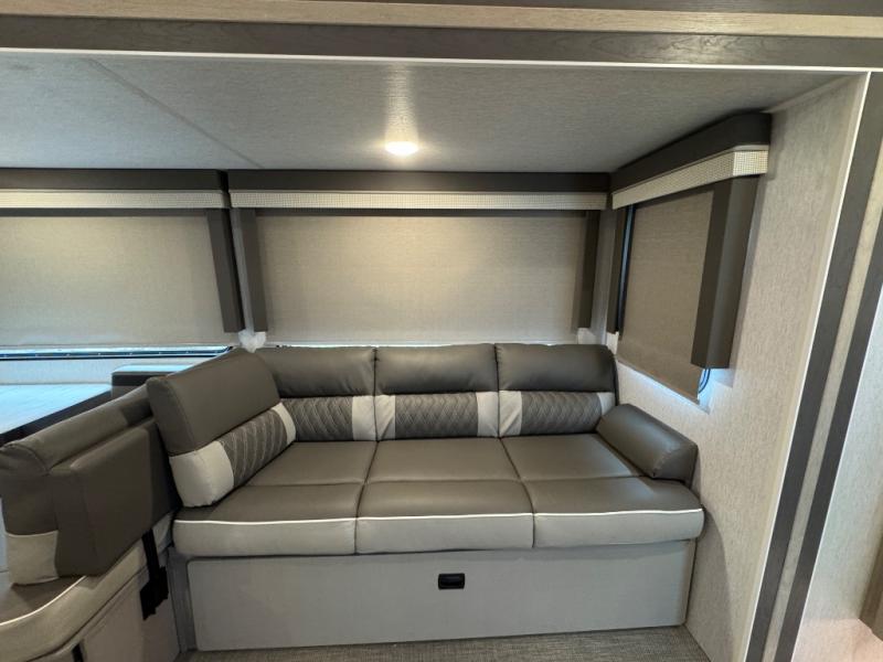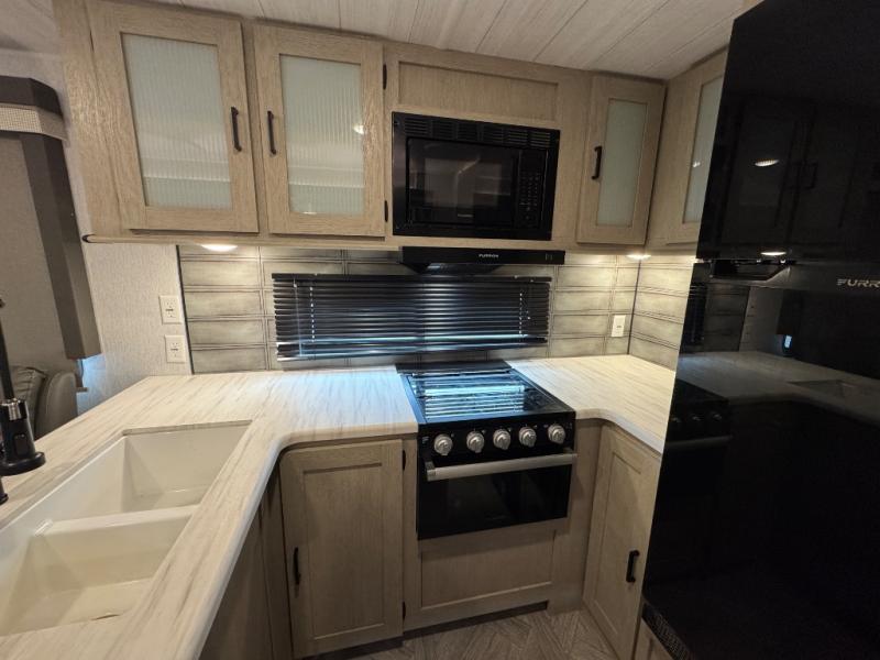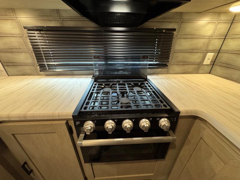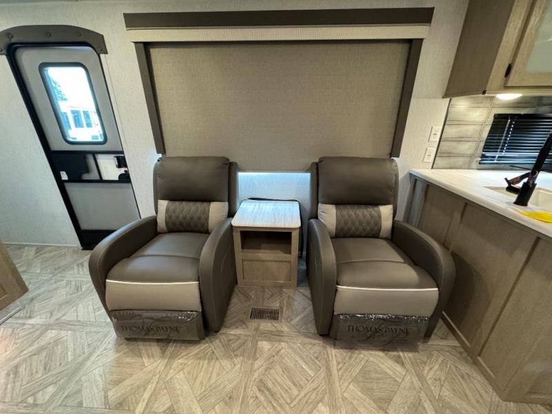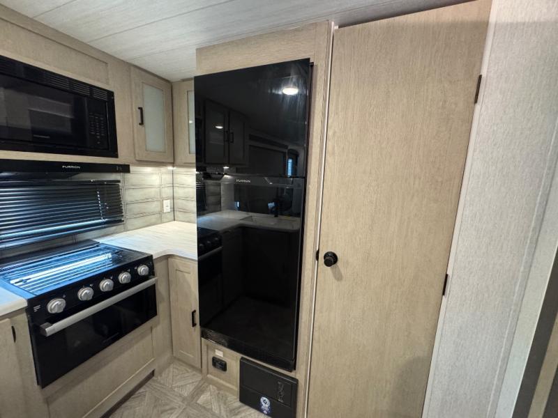 With a spacious kitchen and panoramic windows, this travel trailer is sure to stand out! The Versa Lounge is customizable for you to reconfigure for your needs and it also has Stow N Go storage for extra blankets. Your nights will be spent in true comfort by playing games at the booth dinette or relaxing in one of the two chairs by the fireplace. You can either cook a delicious meal in the rear kitchen or you can use the exterior camp kitchen to breathe in some fresh air while you cook. After a fun-filled day, you can rinse off in the walk-in shower then head to the front private bedroom, grab your pajamas from the walk-in closet, and lay down on the custom king bed for a good night's rest!