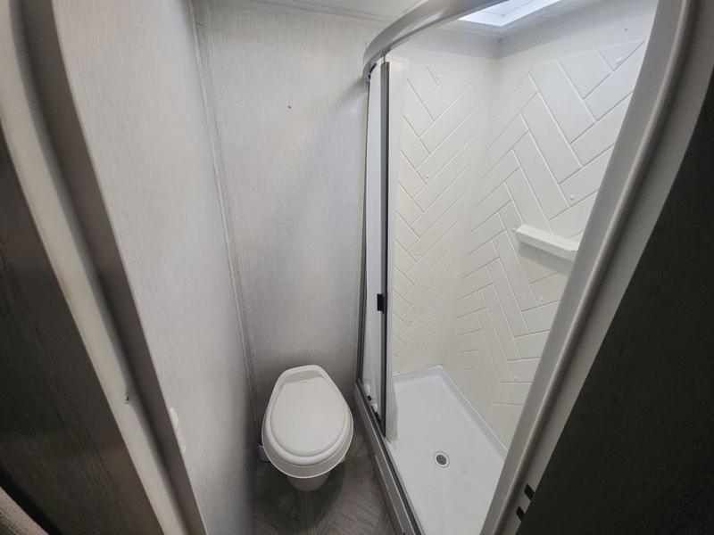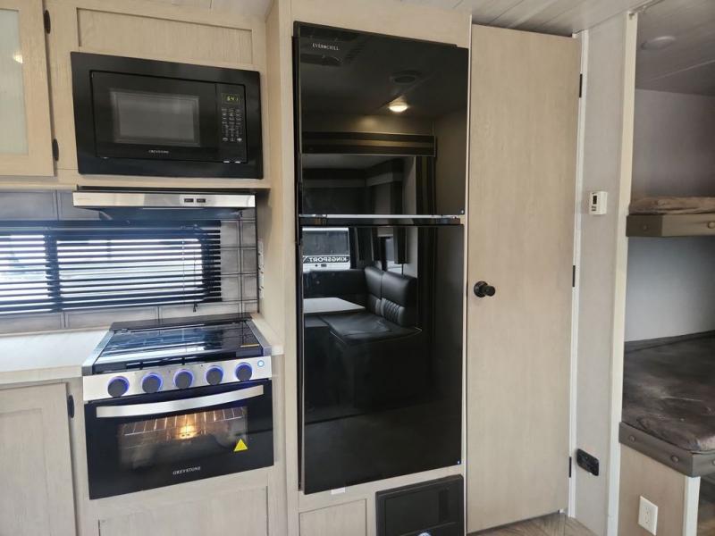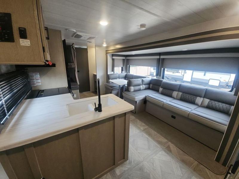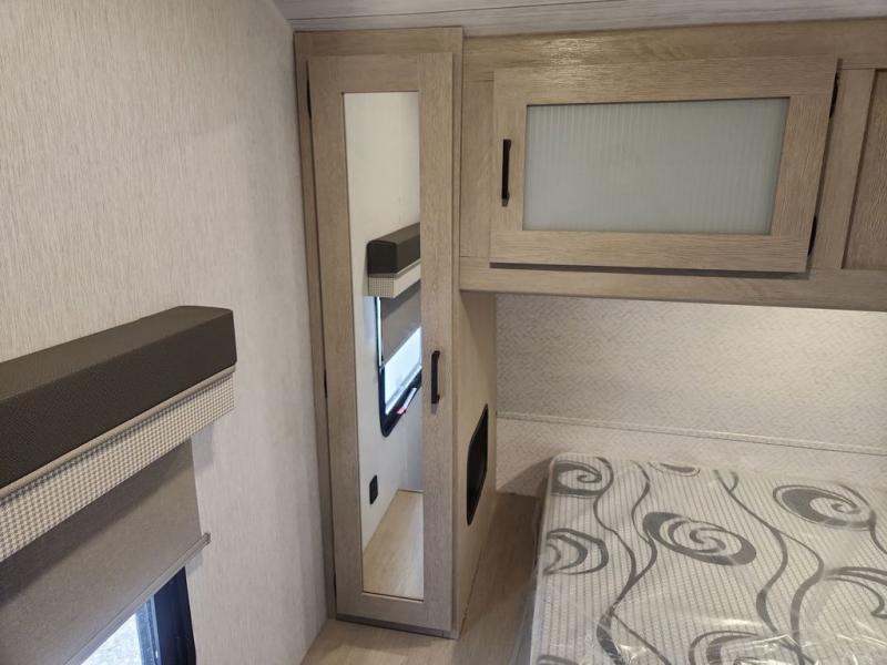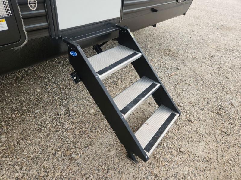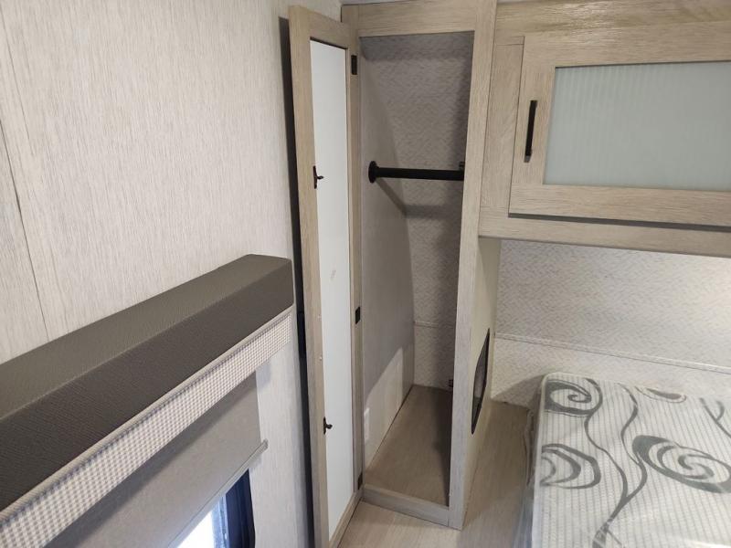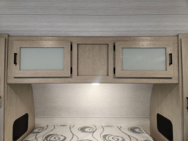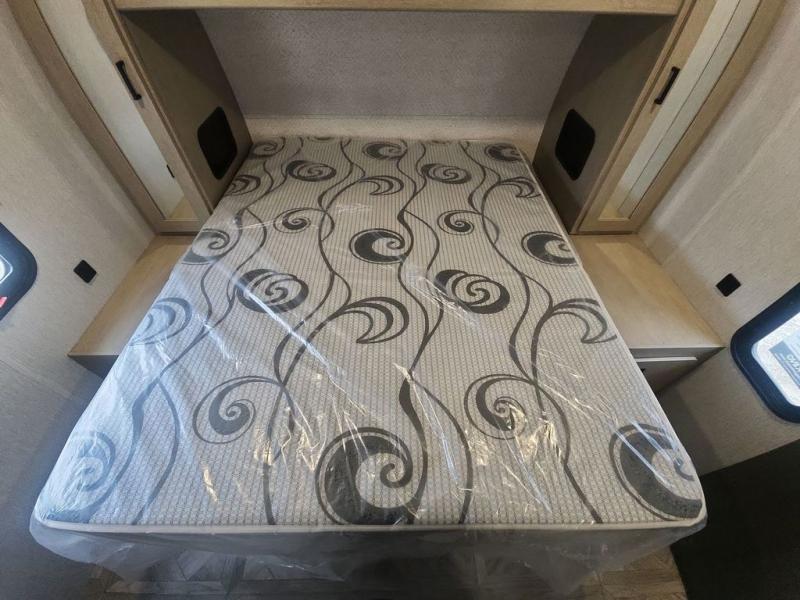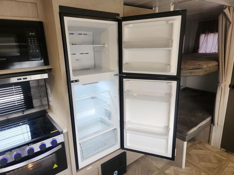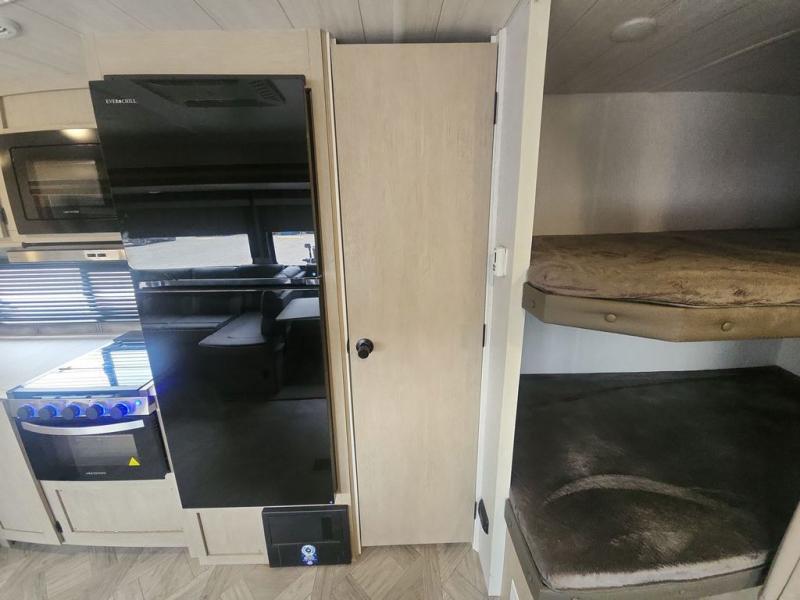 The perfect unit for your larger family to enjoy camping together, or for those that enjoy taking along extended family and/or friends. You will find plenty of space in this large single slide bunk model with stacked double beds in the rear corner next to an opposite rear corner bathroom for convenience. The slide offers a bit more floor space when everyone is inside relaxing. A private front bedroom offers a quiet retreat for two with bedside wardrobes and an overhead shelf for your things, plus there is a large pass-through storage compartment for all of your outdoor camping gear as well. The 16' awning is great for providing an outdoor living space to enjoy, and when indoors the panoramic windows in the main slide will make you feel like you've brought a little outdoors inside with you!