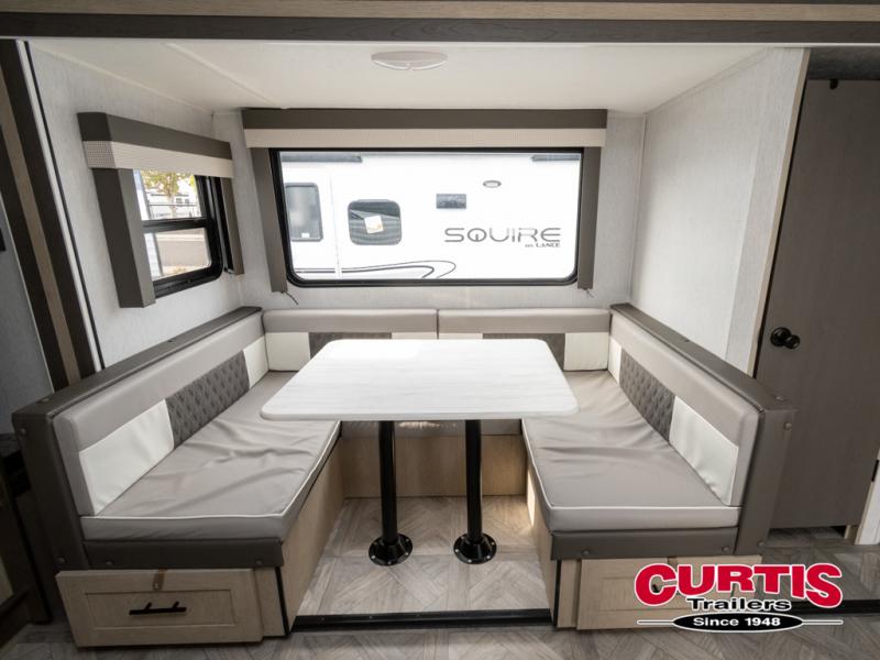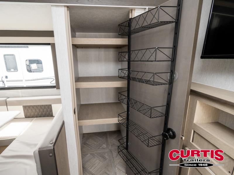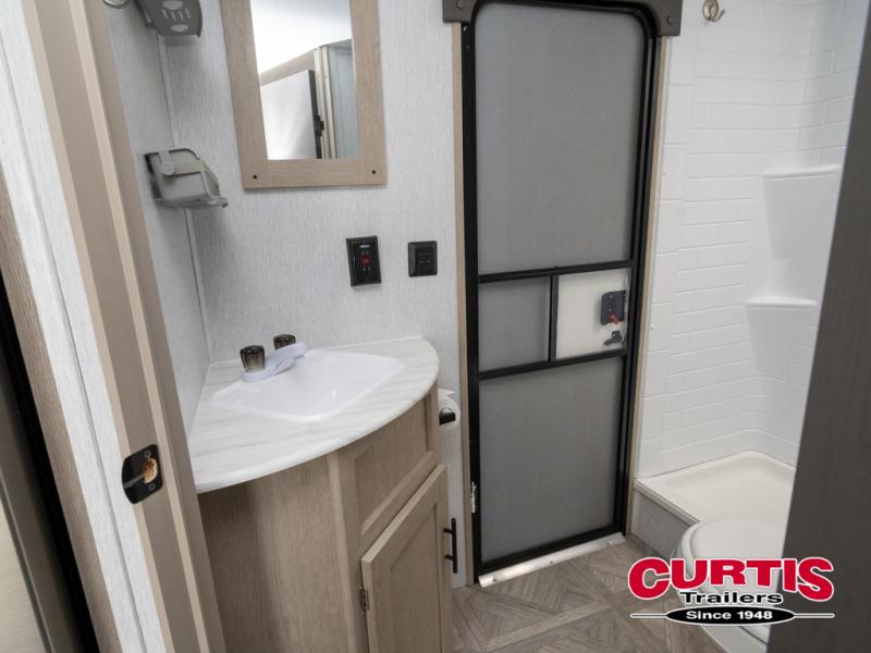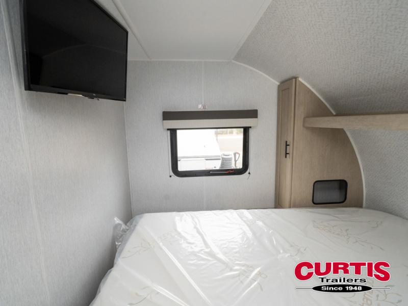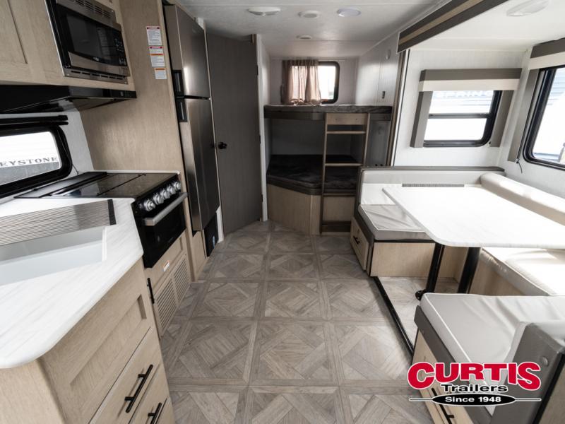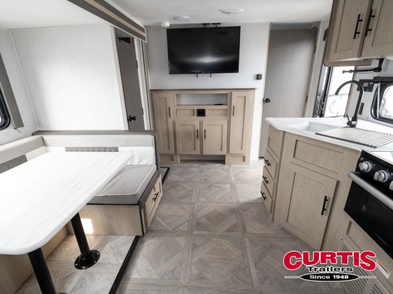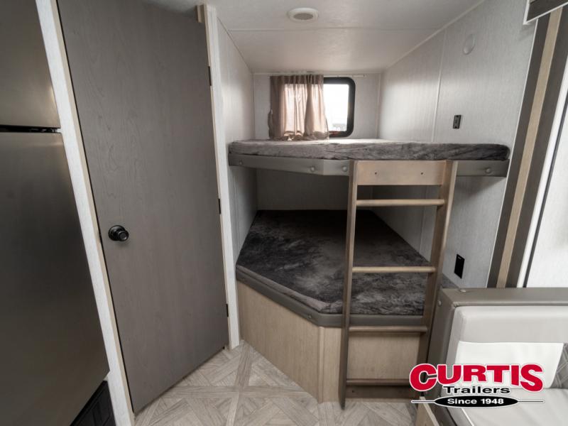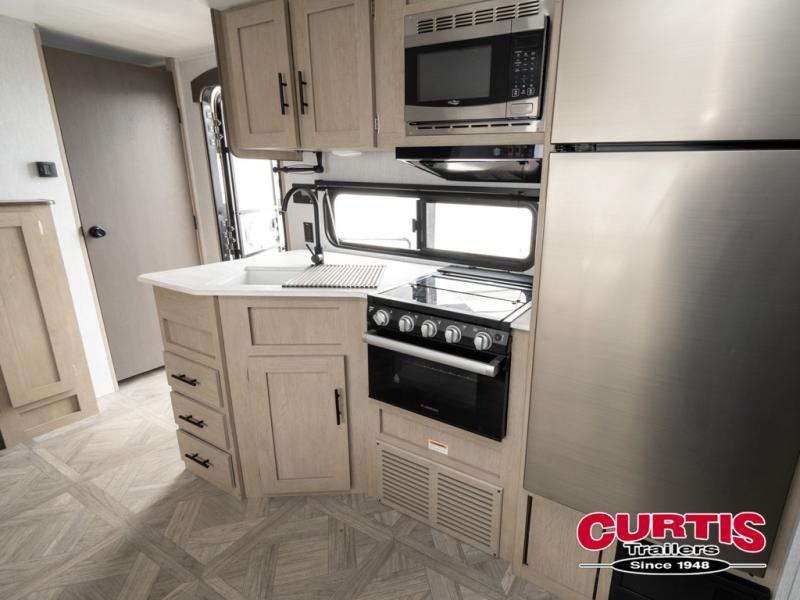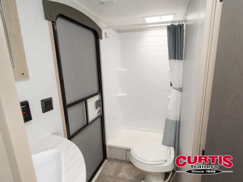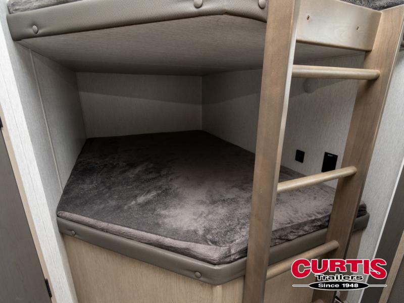 This travel trailer is big enough for the whole family to join in on the fun and weighs in at less than 6,000 lbs! The kiddos can sleep on the corner 46" 74" double-size bunk beds, and you can sleep on the custom king bed inside the front private bedroom, plus the U-shaped dinette can transform into an extra sleeping space. It also has a panoramic window for you to look out at your beautiful scenery while you eat. The rear corner bathroom has everything you will need to get squeaky clean each morning, as well as an exit/entrance door to the unit. The oversized 11 cu. ft. refrigerator will keep your perishables fresh and the three burner cooktop is just waiting for you to create a delicious meal. There is also a walk-in pantry for canned goods and an outside kitchen option for the cook to enjoy!