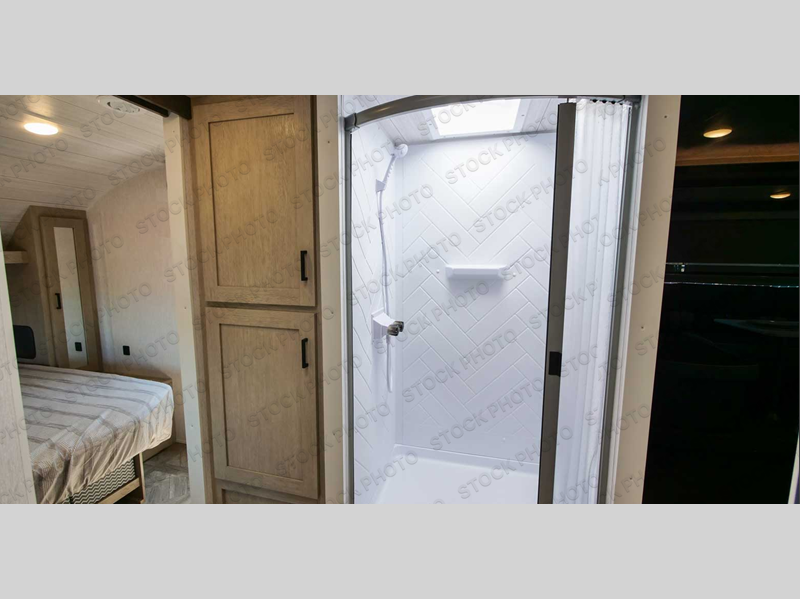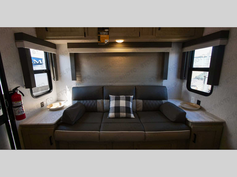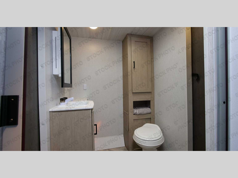 This travel trailer is packed full of features, but is still lightweight coming in at just over 5,000 lbs.! You will feel right at home in the front master bedroom with a custom king bed that has closets on either side, CPAP storage, and a walk-in closet to keep your clothes looking their best. The walk-through bathroom has a walk-in shower with fiberglass surround and a skylight above for added natural lighting as you get ready. The U-shaped dinette slide has a panoramic window for you to enjoy your beautiful scenery as you eat dinner, and there is a fireplace at the entertainment center for a relaxing evening indoors. There is a pass-through storage area to store your outdoor camping gear, and a 16' power awning and exterior speakers to crank up the tunes!