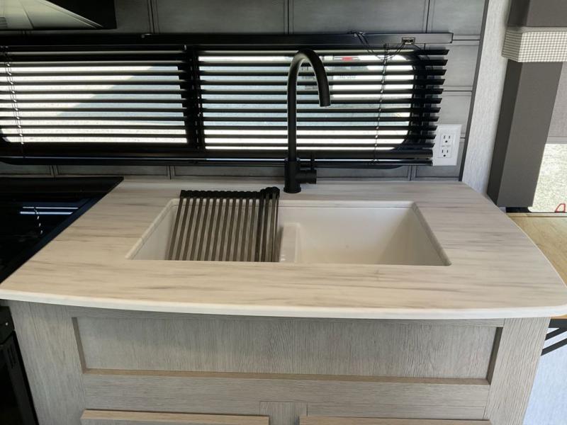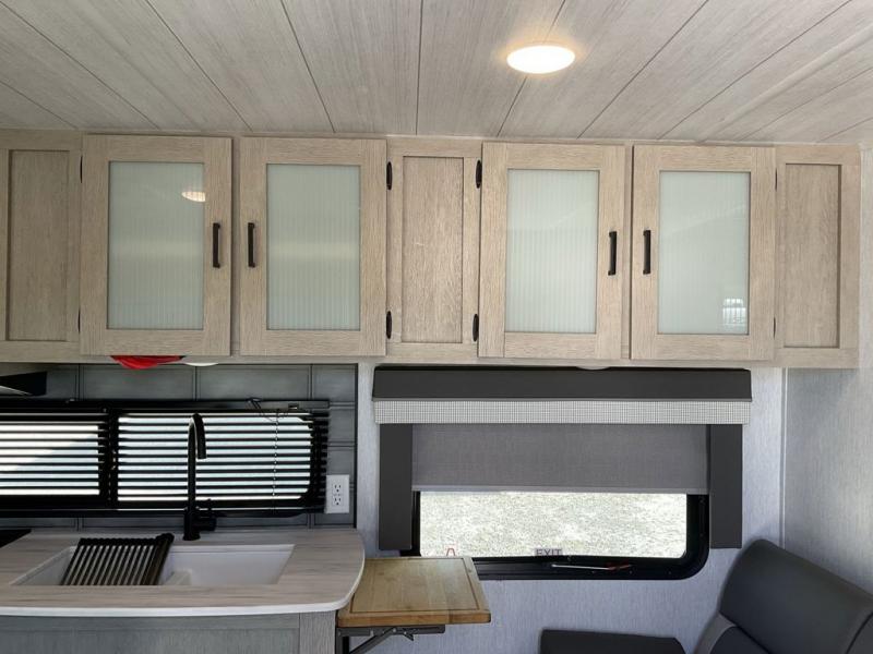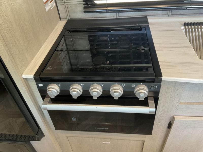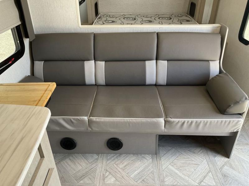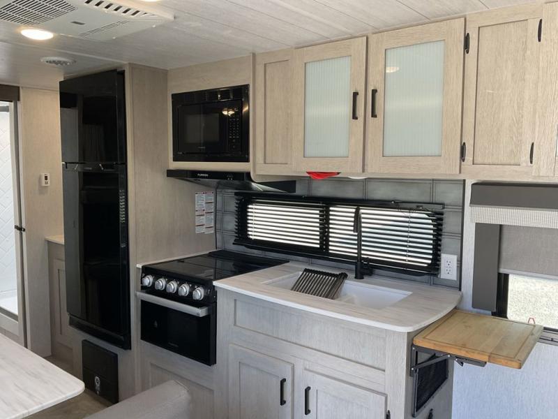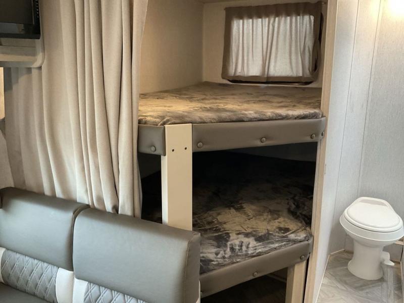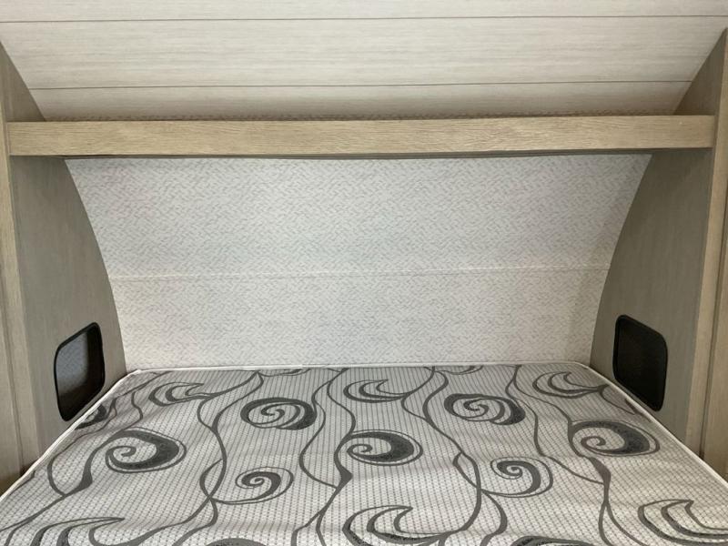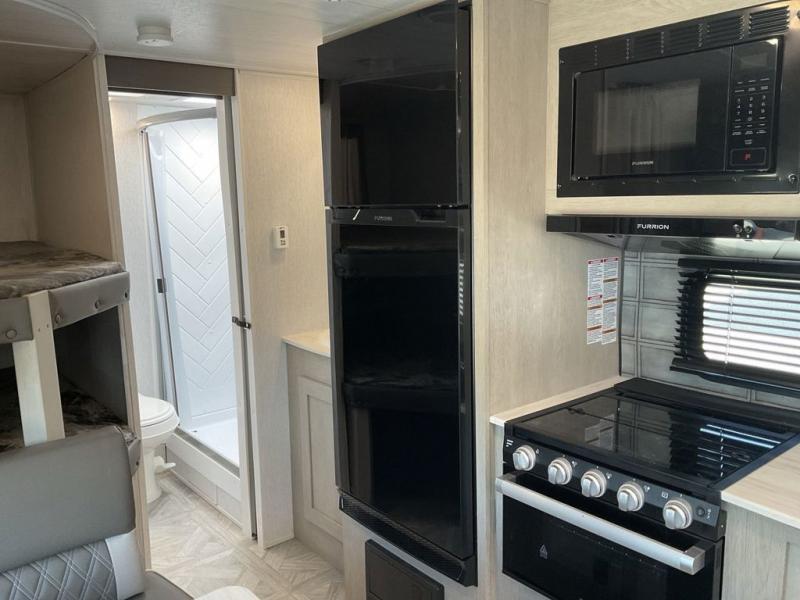 Load up this light weight travel trailer with double-size bunks and head to your favorite campsite! There is plenty of seating and sleeping spaces between the rear bunks, the custom king bed, the booth dinette, and the sofa. The front bed has closets on either side of it and a privacy curtain to draw at night. The oversized 11 cu. ft. refrigerator will keep your perishables fresh and the three burner cooktop is just waiting for you to prepare a delicious home cooked meal. And you might want to add the optional outside kitchen for a sunrise breakfast!