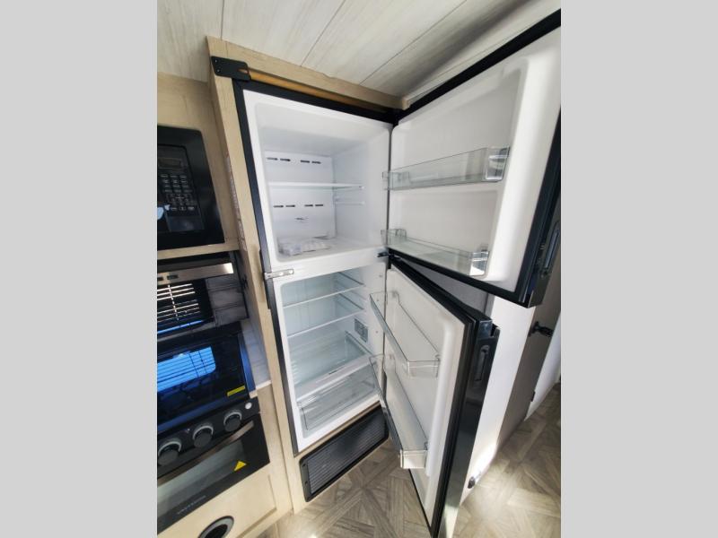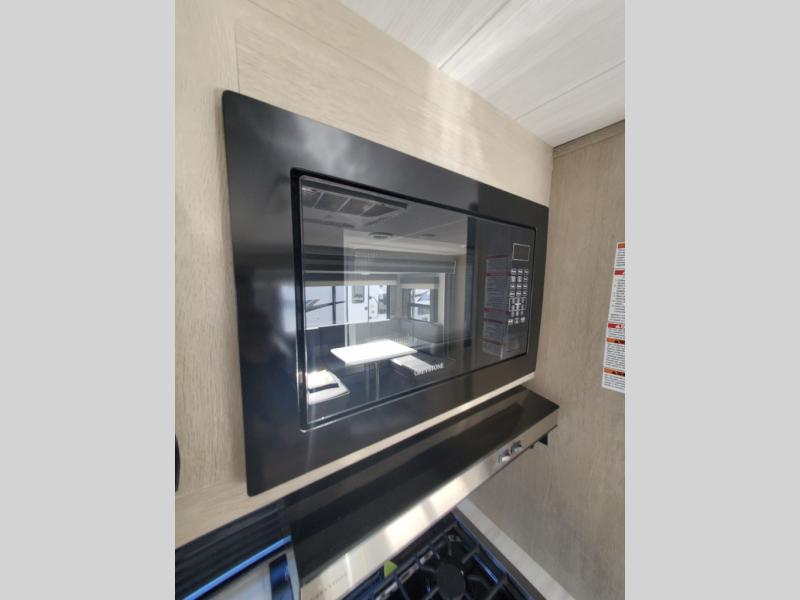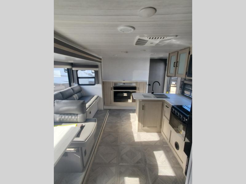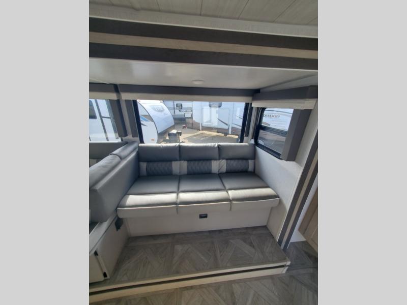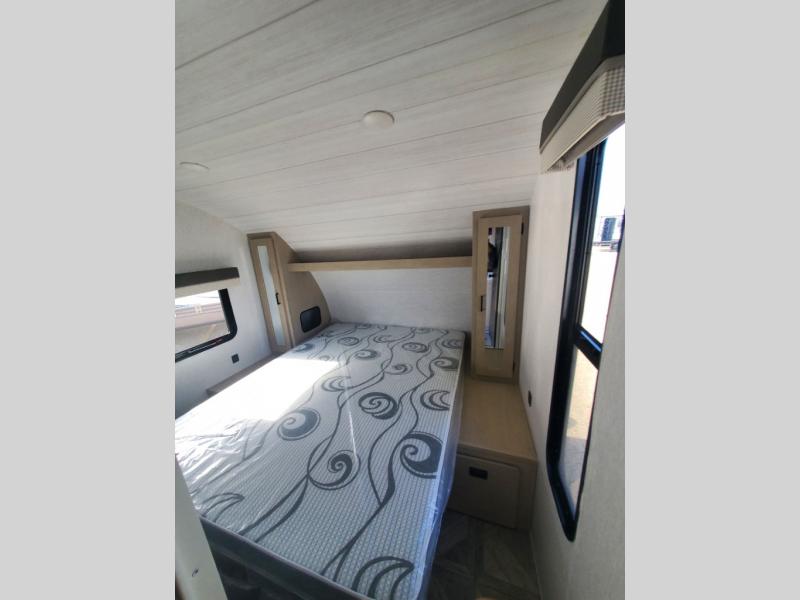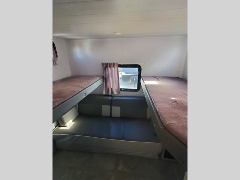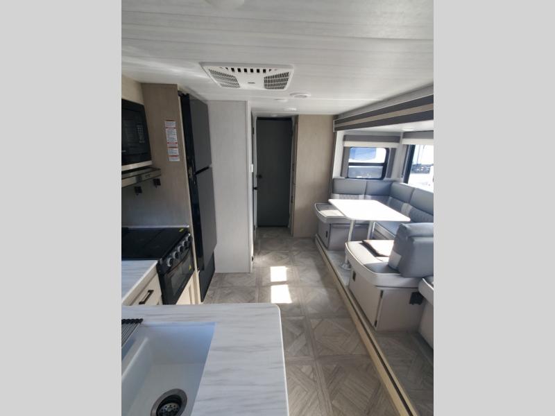 This travel trailer is new to the lineup and offers a large amount of versatility! The rear private bunkhouse has two 30" x 74" Versa-bunks and a Versa- queen bed so that more can join in on the camping fun. Start each morning feeling clean and fresh after showering in the walk-in shower with fiberglass surround then head to the front private bedroom to change. The kitchen has an oversized 11 cu. ft. refrigerator to keep your perishables fresh, a three burner cooktop for meals, and a U-shaped dinette for dining, game time, or just hanging out.